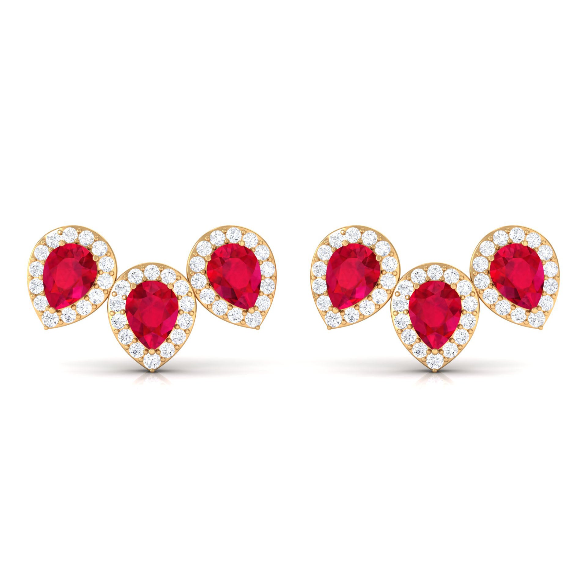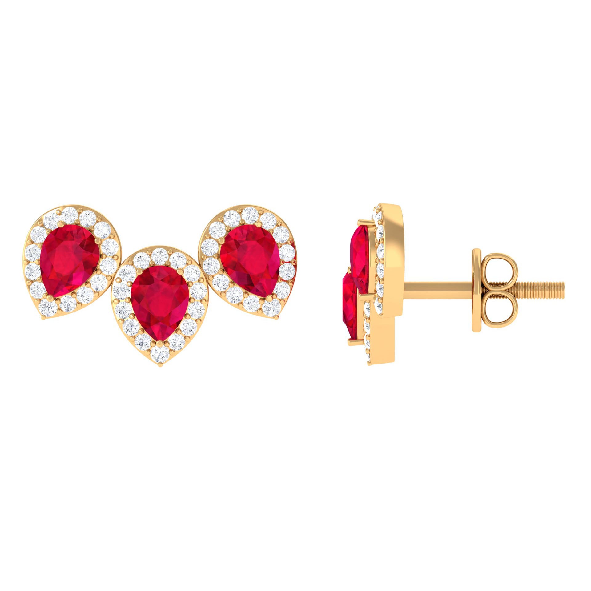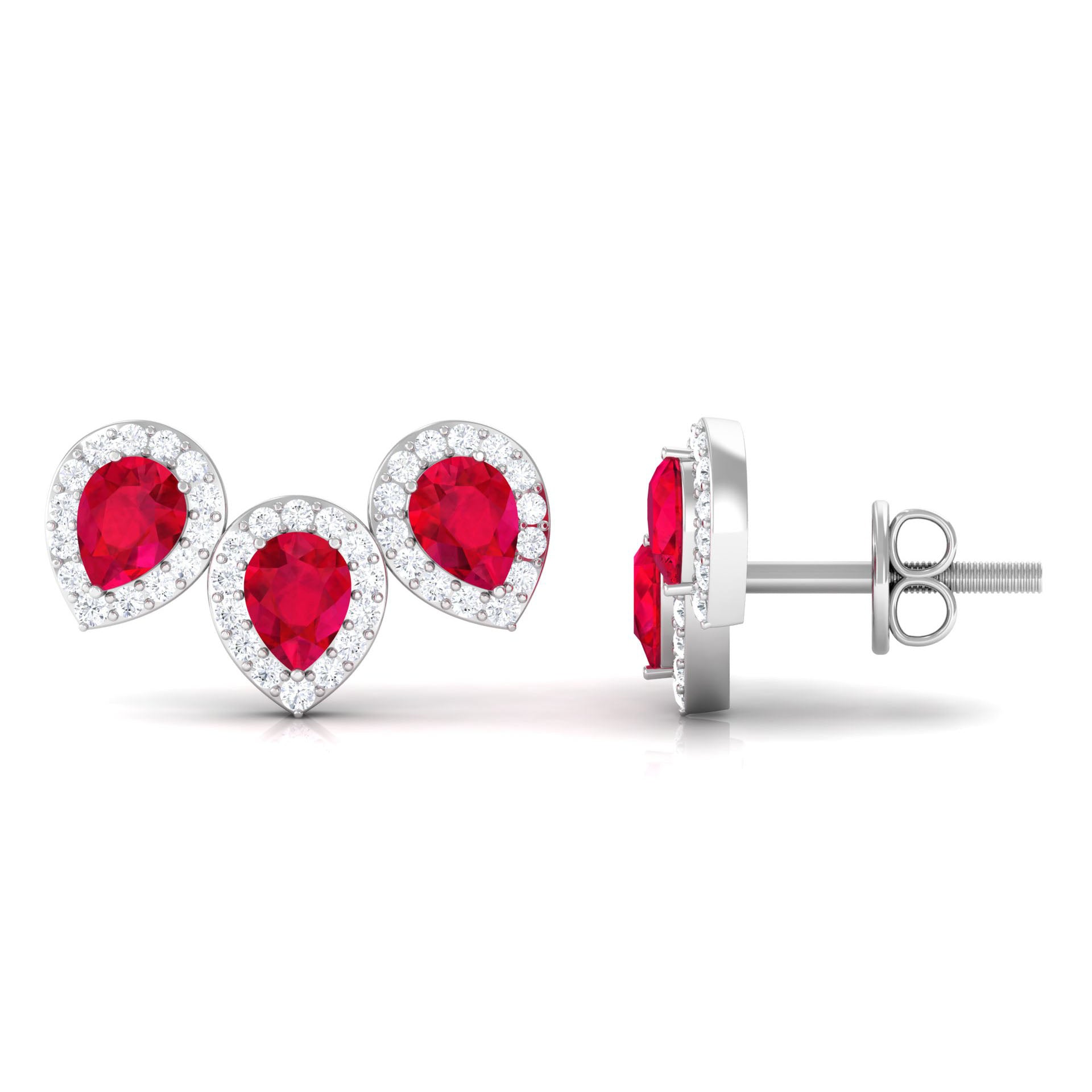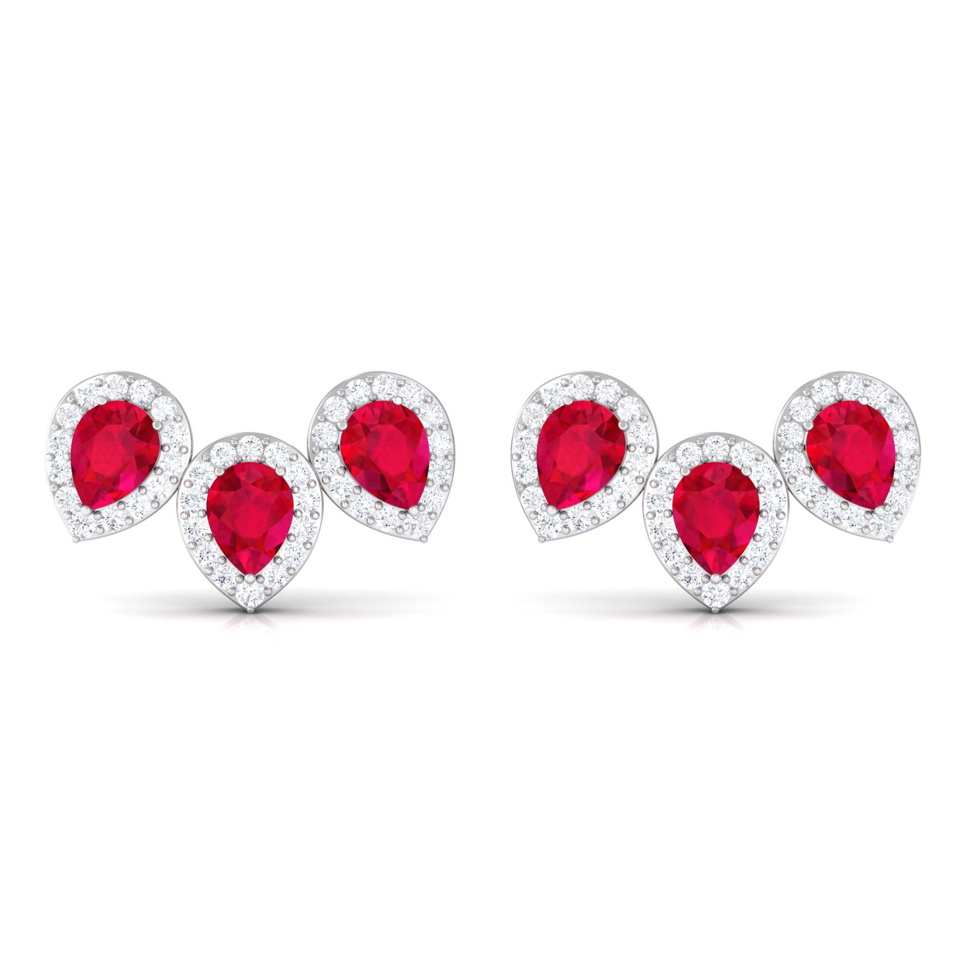 Modern and unique these 3 Stone Earrings embellished with Pear Cut Created Ruby accentuated by Diamond Halo will set you apart from the crowd.