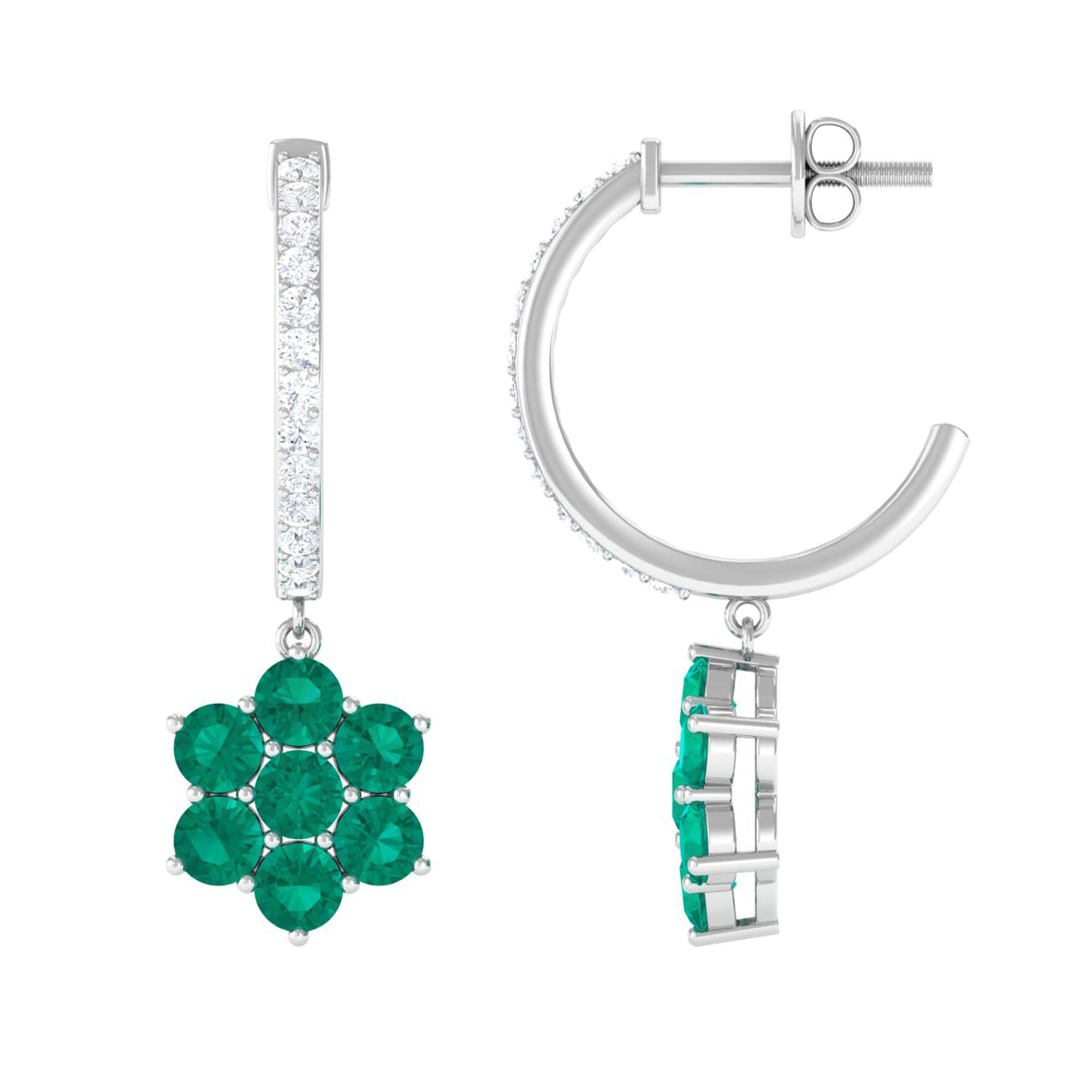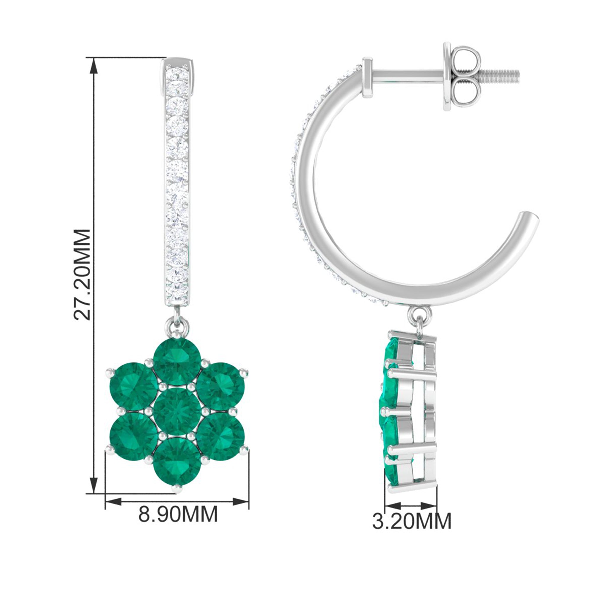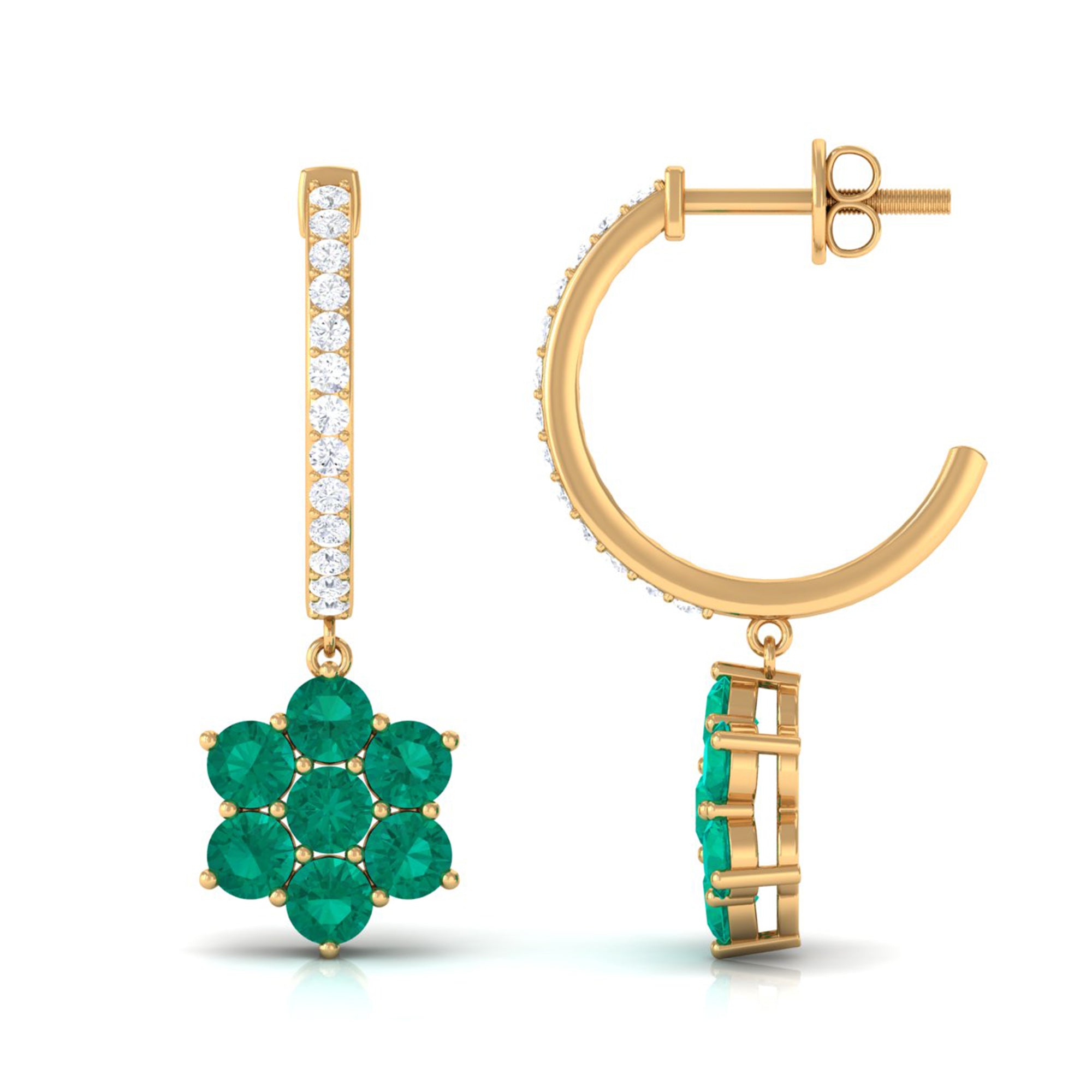 Get lots of compliments with these Flower Drop Earrings, a refreshing blend of vibrant color and timeless sparkle. Designed to captivate, each earring features 3 mm Round Shape Emerald stones arranged in a charming flower pattern that instantly adds a touch of romance and elegance. The flower gently dangles from a sleek Half Hoop, beautifully lined with dainty Diamond stones that shimmer with every move. Secured with Screw Back Closure, these Emerald Diamond Earrings offer comfort and style all in one. Whether you are dressing up for a dinner date, stepping out for a special celebration or simply adding a pop of green to your everyday outfits, these Emerald Drop Earrings make the perfect accessory. Packaged in a signature jewelry box, these Hoop Drop Earrings are also an ideal gift for birthdays, anniversaries or anyone who adores fine jewelry with a natural touch.