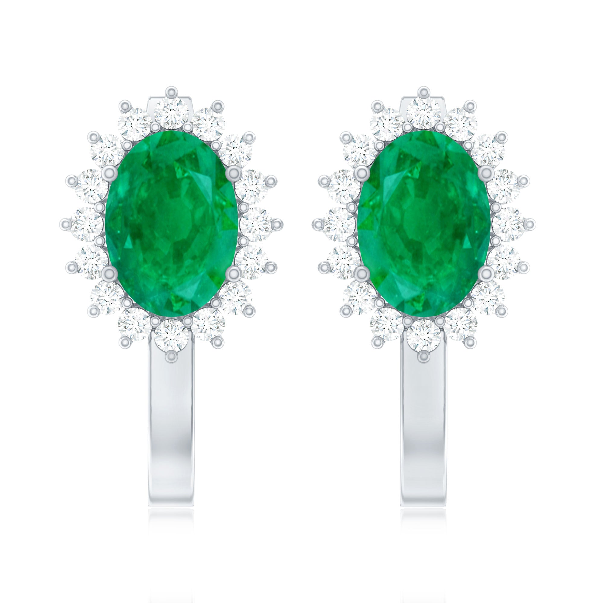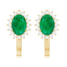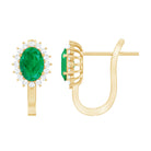 An Attractive and Eye-Catching Halo Stud Earring embellished with Oval Shape Emerald Gemstone is set in prong setting with Diamond halo. Classic Women Earring is composed of Gold. A perfect and time-saving accessory for working women. An elegant and lovely anniversary and birthday present for your loved ones.