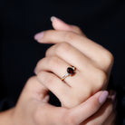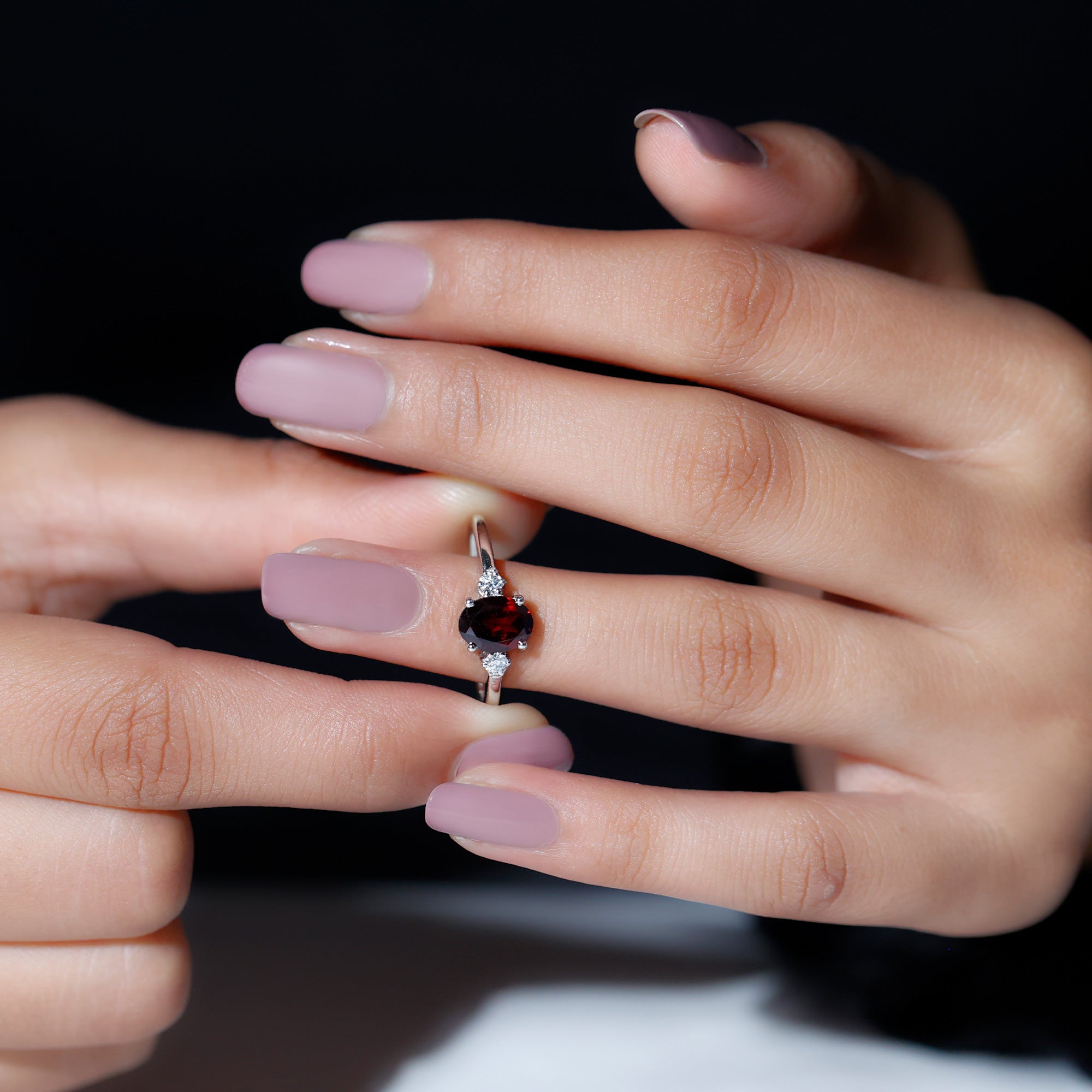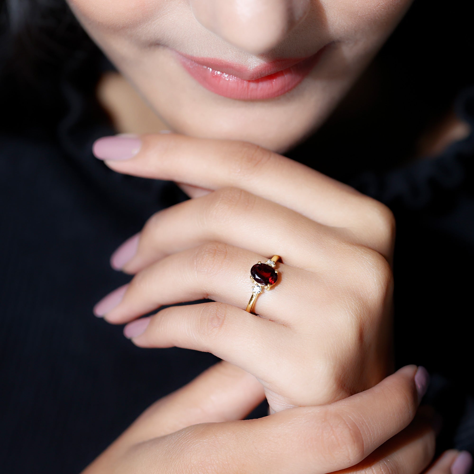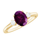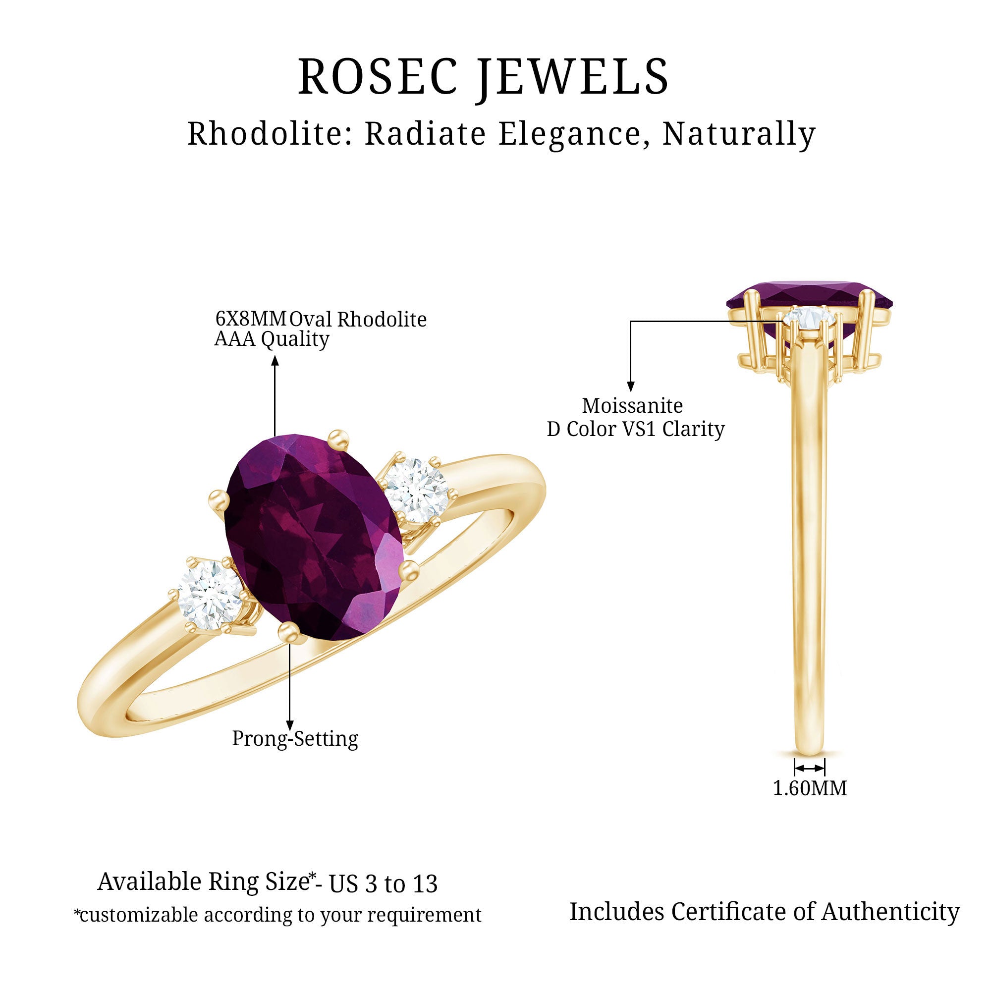 This Solitaire Engagement Ring is a timeless and elegant piece of jewelry thats a perfect choice for your lady love. Adorned with an Oval Cut Rhodolite in Prong Setting with Moissanite Stone on either side, this Rhodolite and Moissanite Ring is crafted with Gold Metal. This ring is a perfect symbol of your love and commitment, and its sure to be cherished for a lifetime.