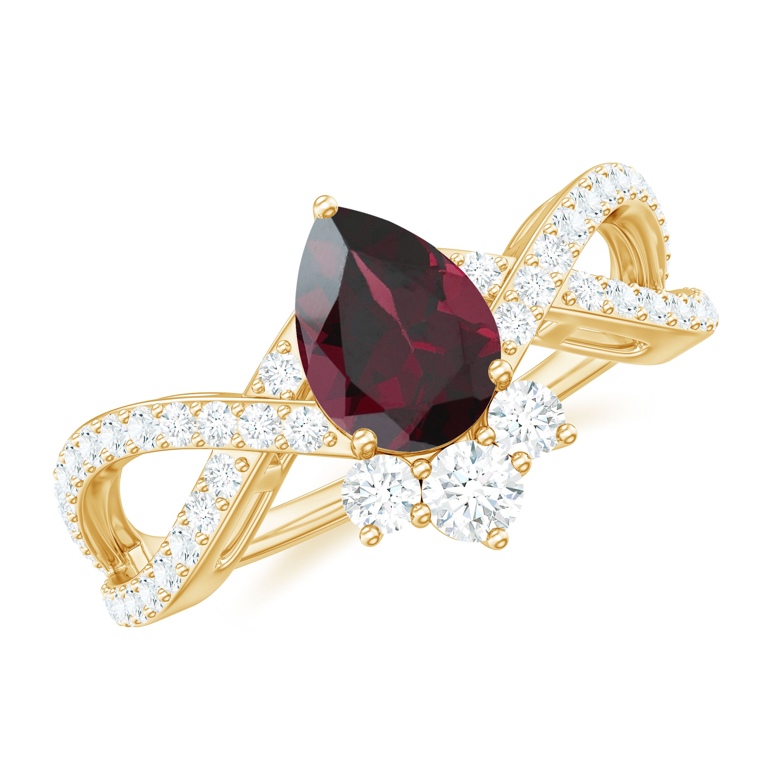 1.75 CT Pear Cut Rhodolite Designer Solitaire Engagement Ring with Crossover Diamond