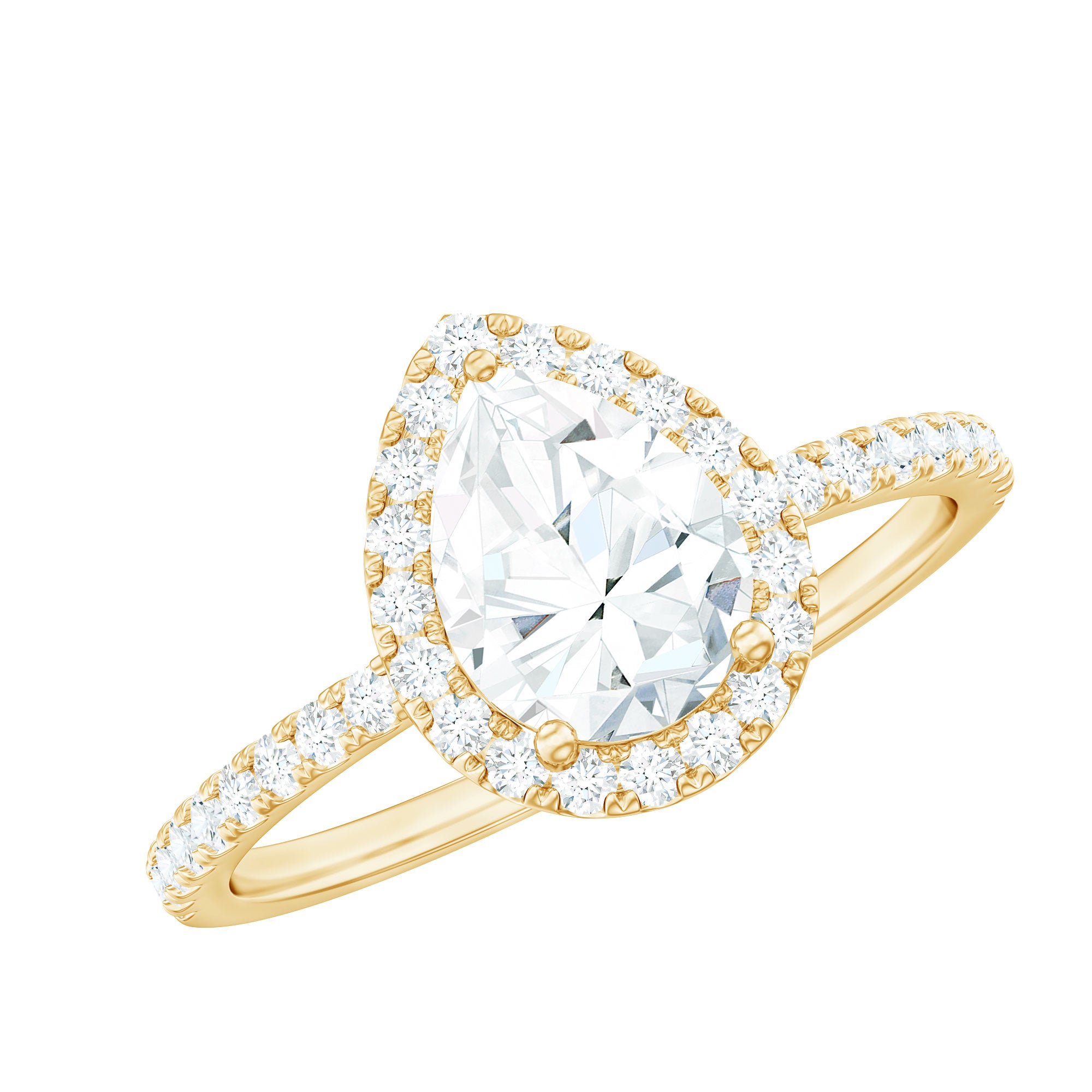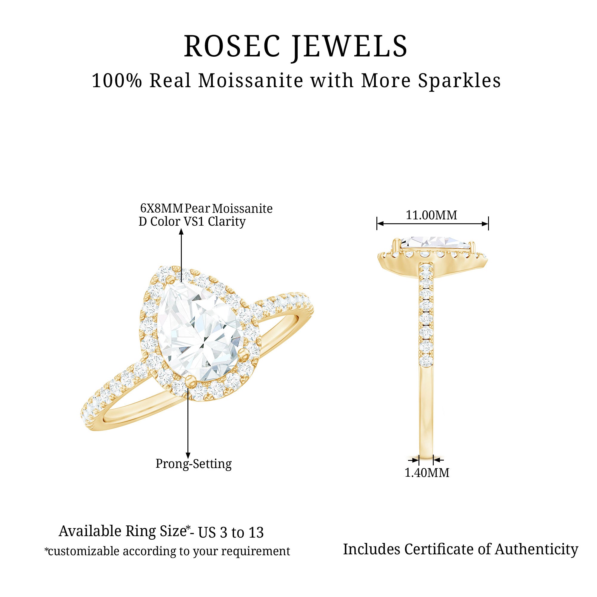 Make her feel truly cherished with this gorgeous Moissanite Engagement Ring, designed to shine on her big day. With a simple yet elegant design, this Pear Shaped Engagement Ring showcases the center stone beautifully. At the heart of the ring is a stunning 6X8 MM pear cut moissanite, set in prong setting, sparkling with incredible fire and clarity. Surrounding it is a delicate halo of round moissanite stones that enhance the center gem’s brilliance and add extra sparkle. The band is embellished with additional shimmering round shaped moissanites, creating a bold, radiant look that draws attention from every angle. This 1 Carat Moissanite Ring blends classic charm with a touch of modern sophistication. Carefully crafted with precision and love, this Halo Engagement Ring comes in various sizes to ensure the perfect fit. Every detail of this piece reflects love, artistry, and commitment. Let it tell your love story with brilliance and elegance, because she deserves nothing less than extraordinary.