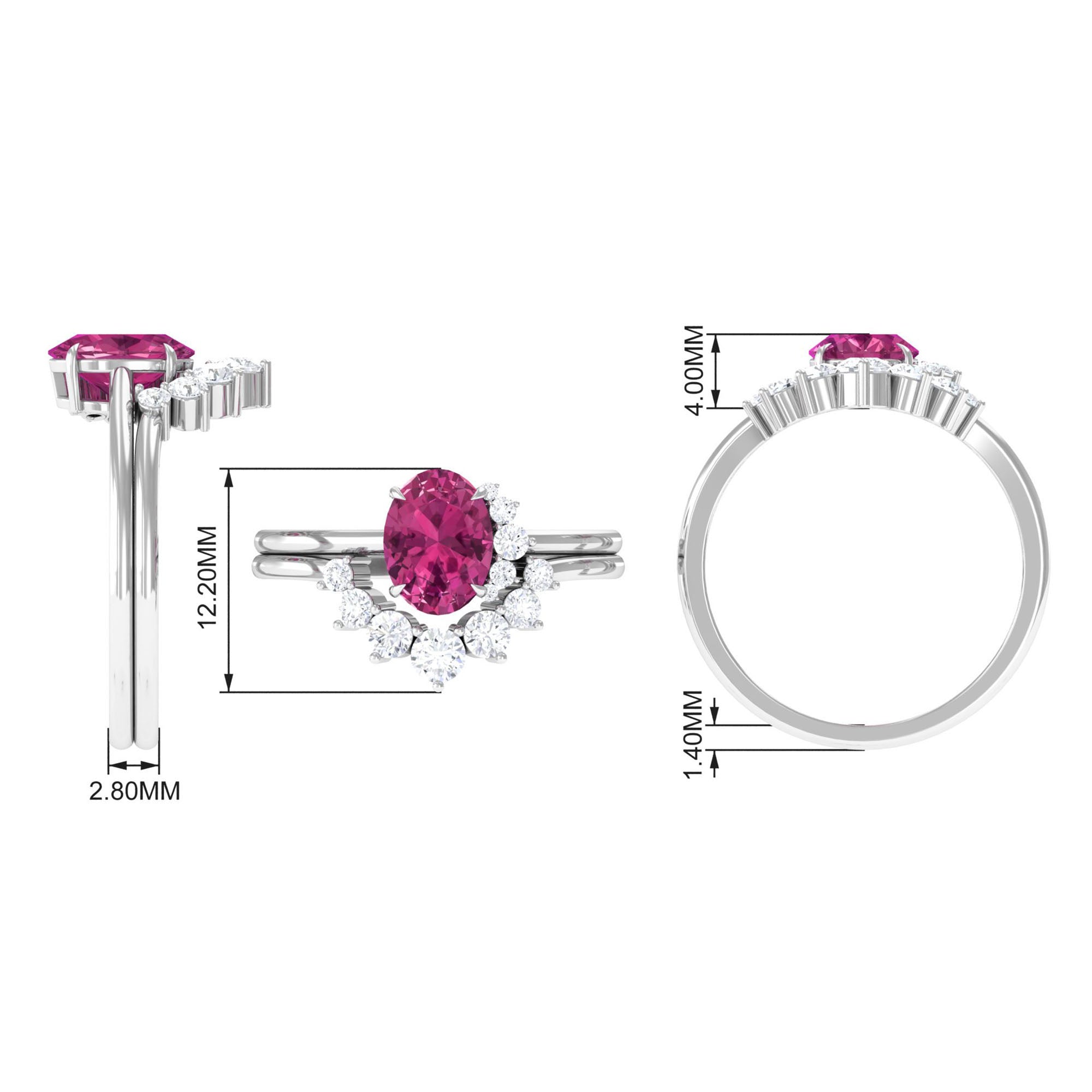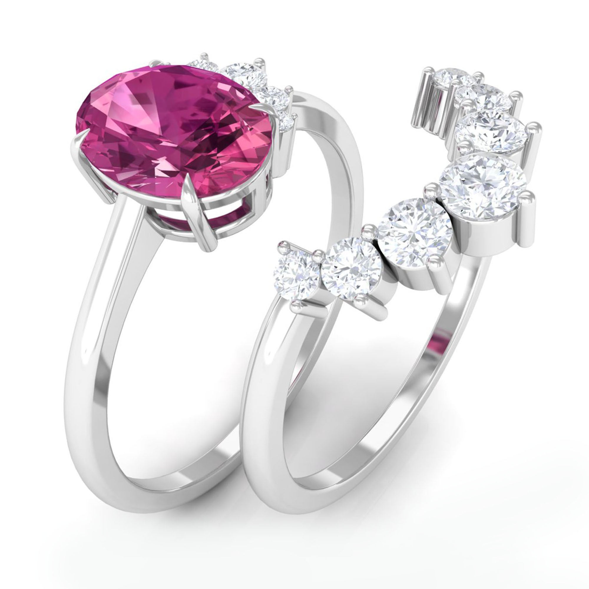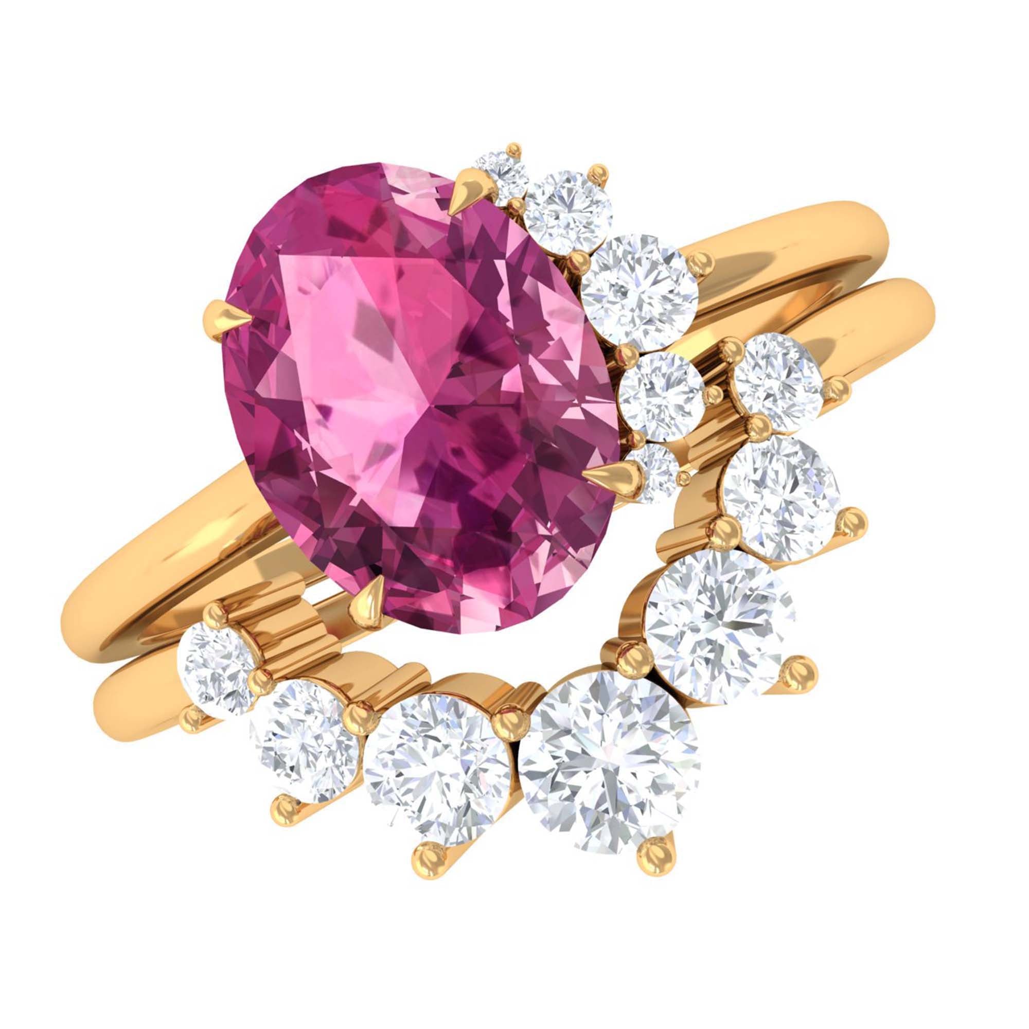 A Perfect and Lovely Engagement Enhancer Ring Set has adorned with Oval Shape Pink Tourmaline set as a solitaire in a claw setting and Round Shape Moissanite in a prong setting on enhancer band. This Engagement Enhancer Ring Set is crafted in solid gold.