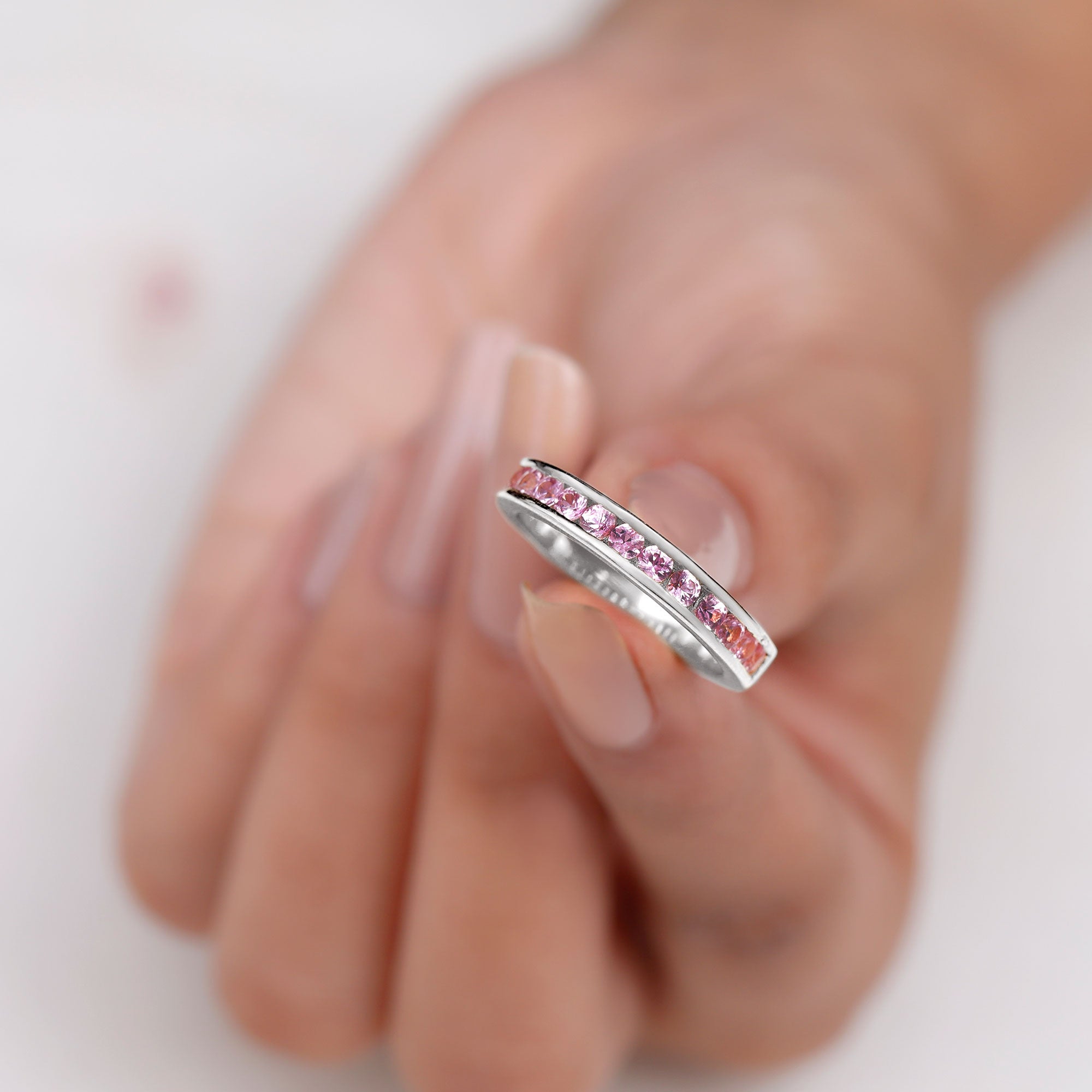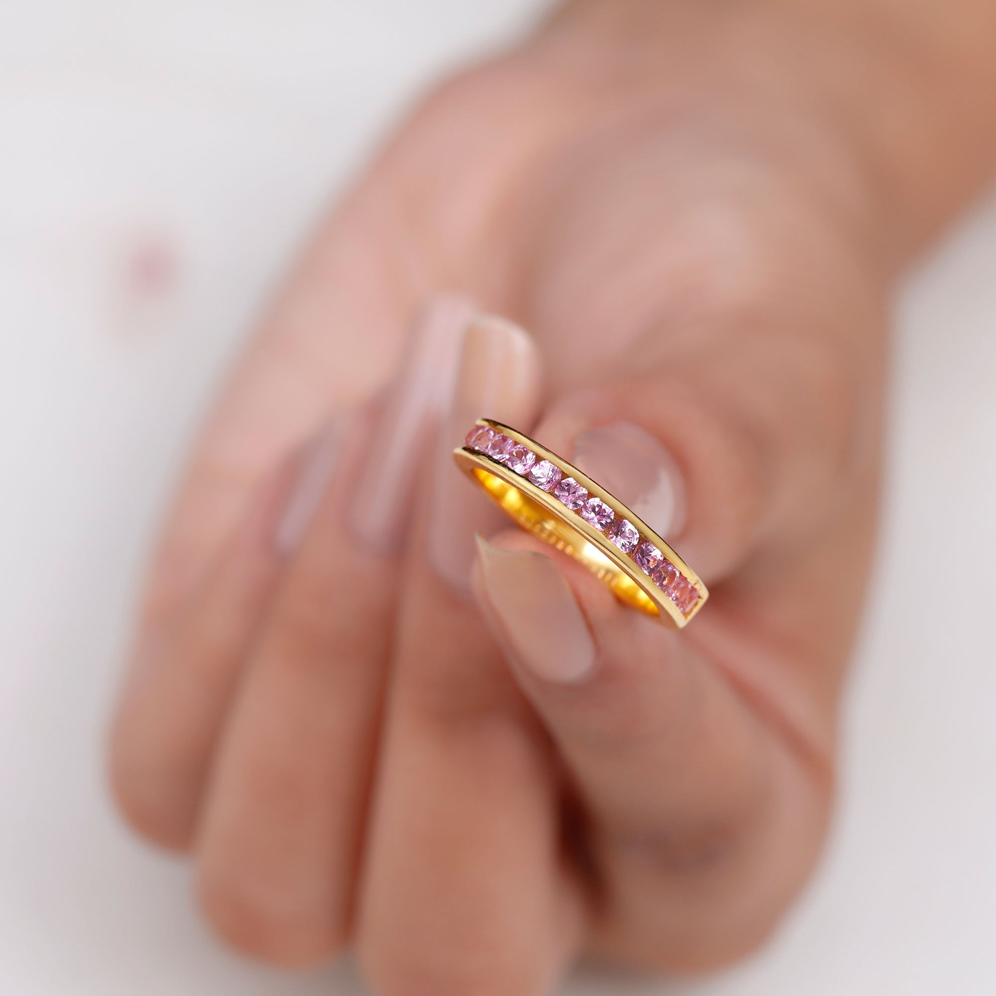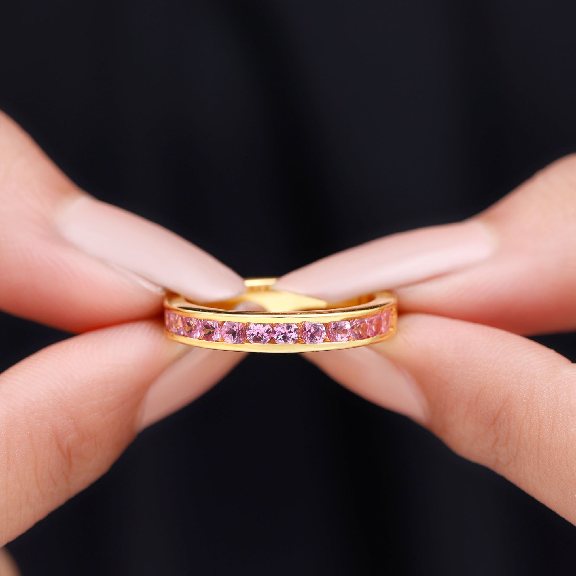 In this beautiful Half Eternity Ring Round Cut Created Pink Sapphire sets in Channel Setting. Gemstones are mounted in Solid Gold, a gorgeous ring for your lovely life partner to feel her special on Birthday.