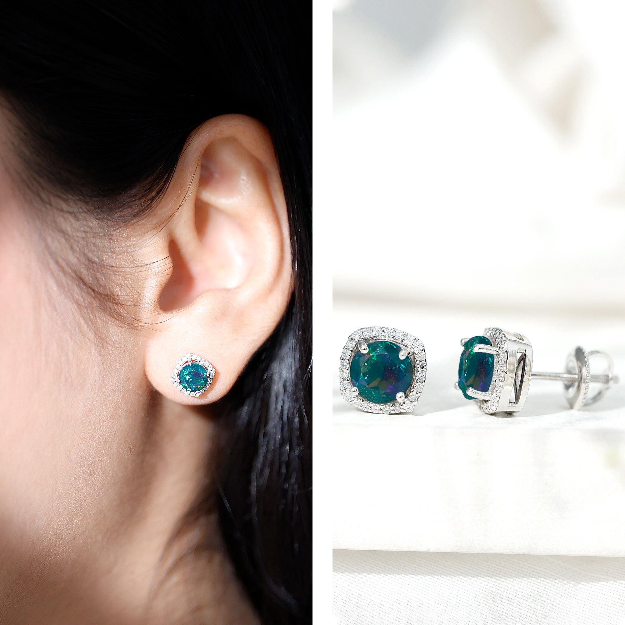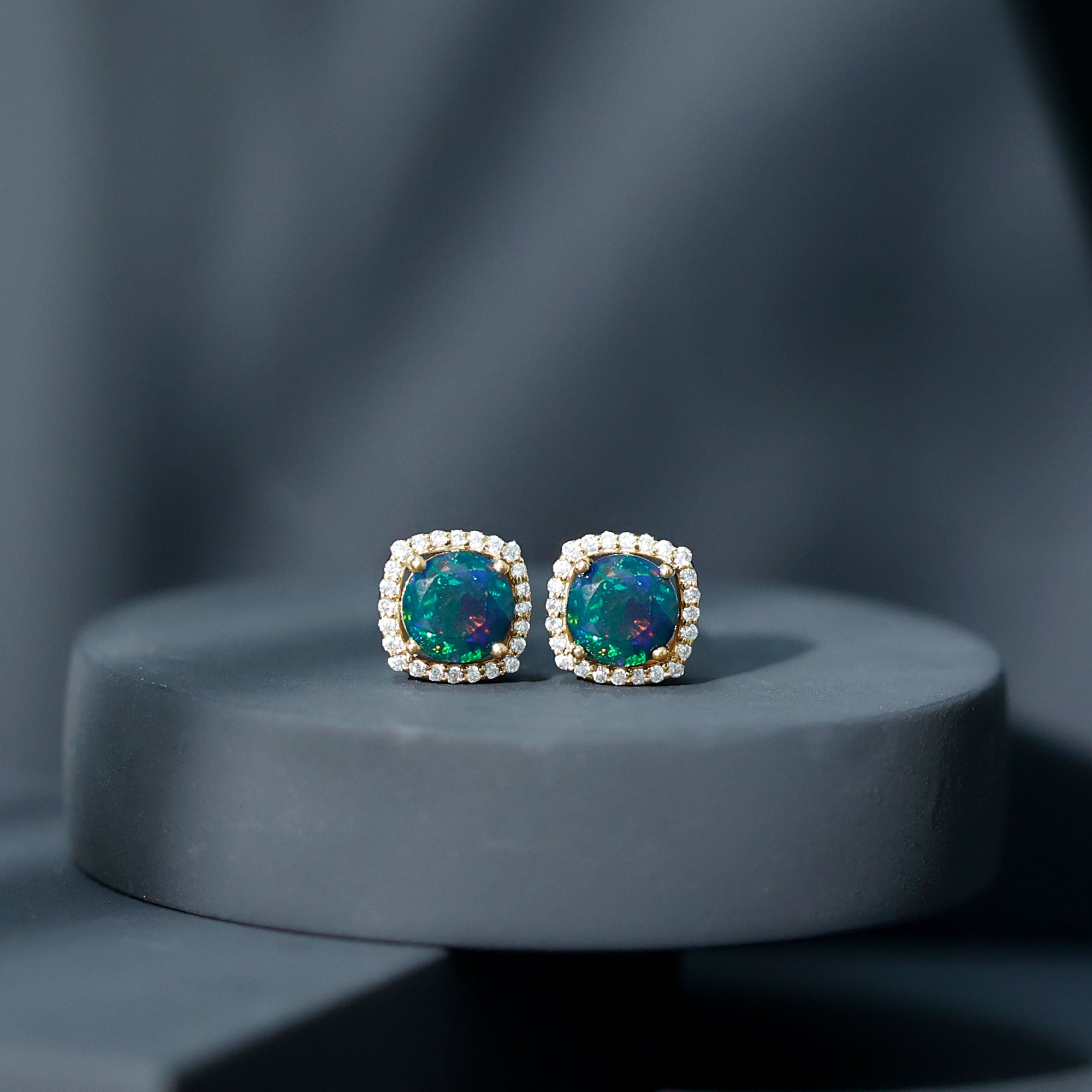 Make a statement with these stunning Stud Earrings with embellished with Round Shape Black Opal gemstone, encircled with Moissanite Halo. The Moissanite halo adds a touch of luxury and sparkle, making these earrings perfect for special occasions. Crafted from gold metal, these earrings will be a cherished addition to your jewelry collection for years to come.