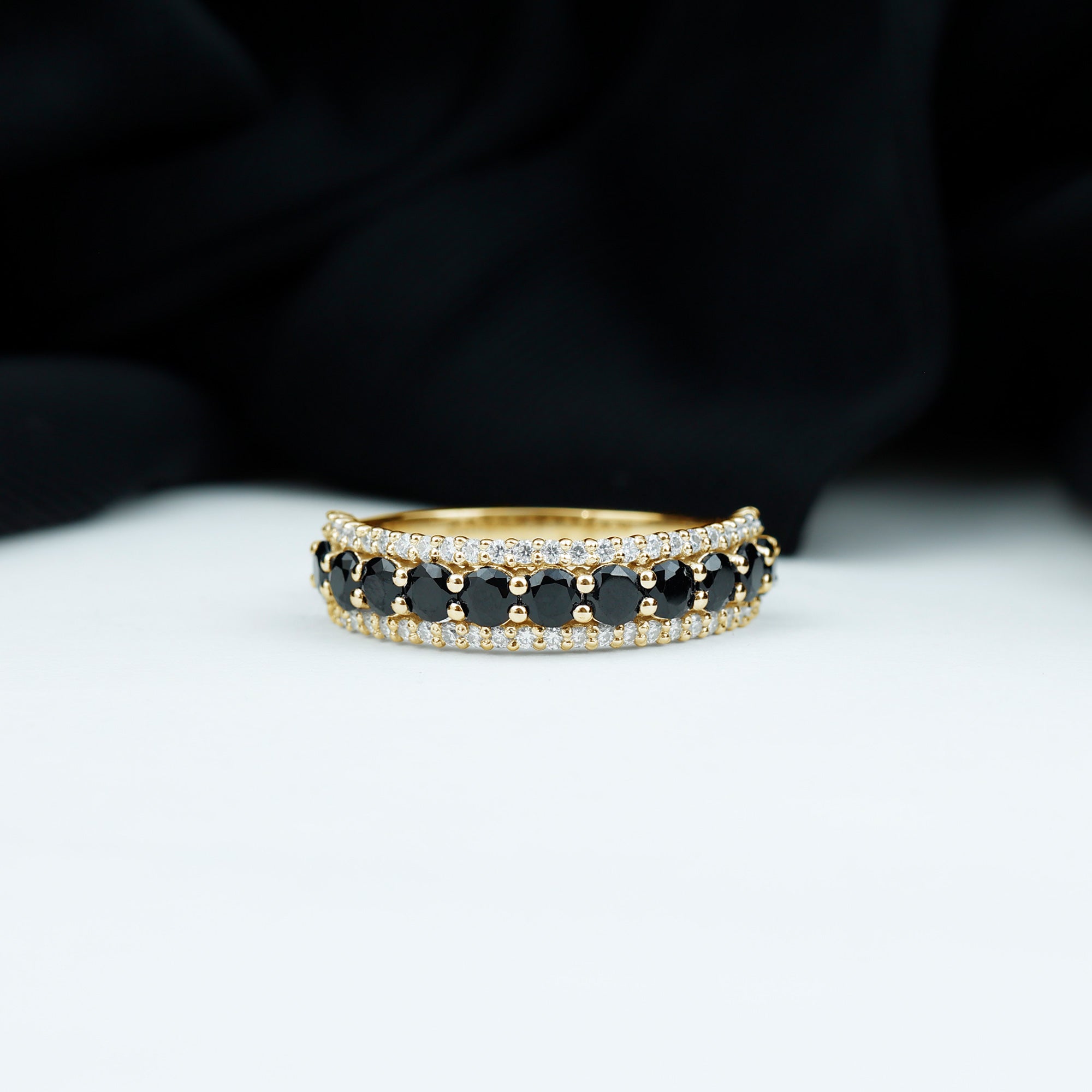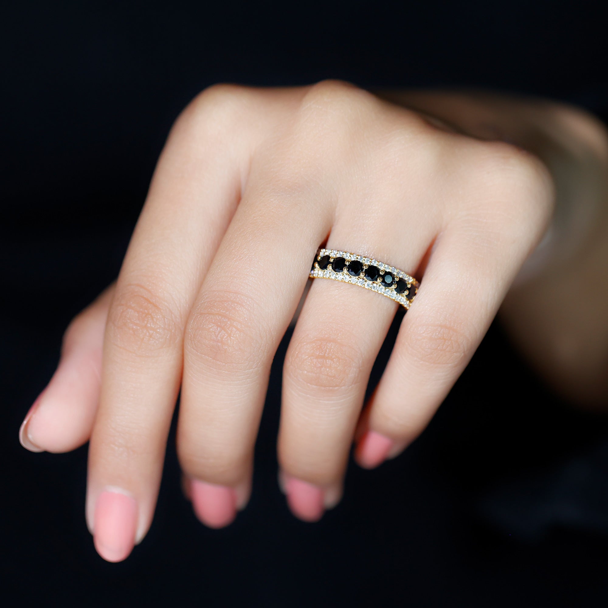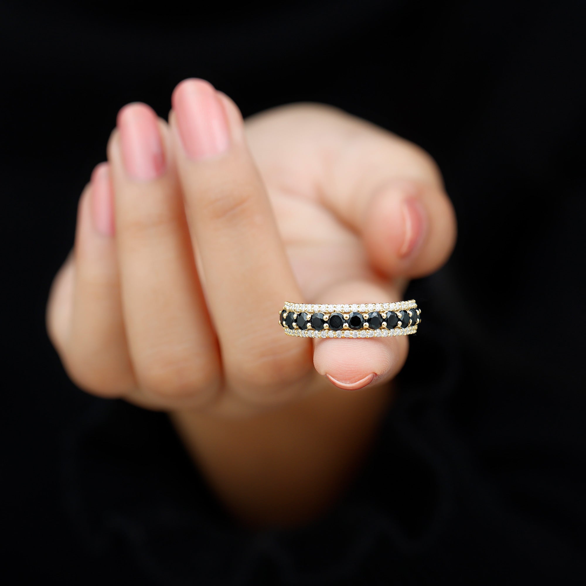 Choose something special for your beloved with this Classic Wedding Band. Round Shape Black Spinel adorns this Band Ring in Prong Setting with petite Diamond over Solid Gold build to make for a gorgeous choice for the Wedding.