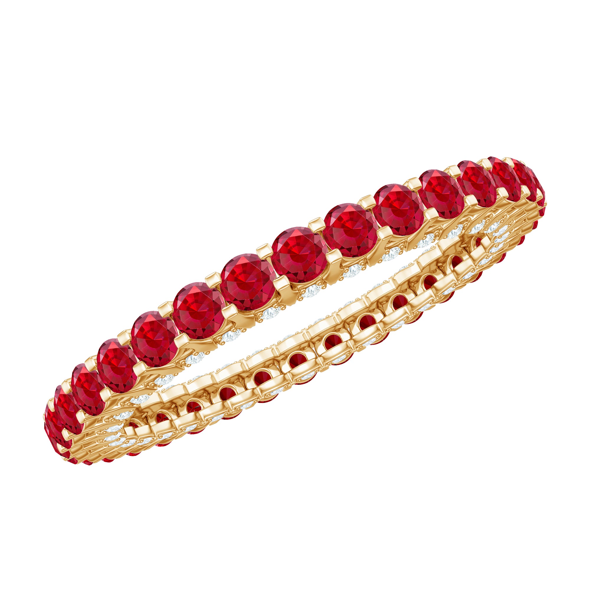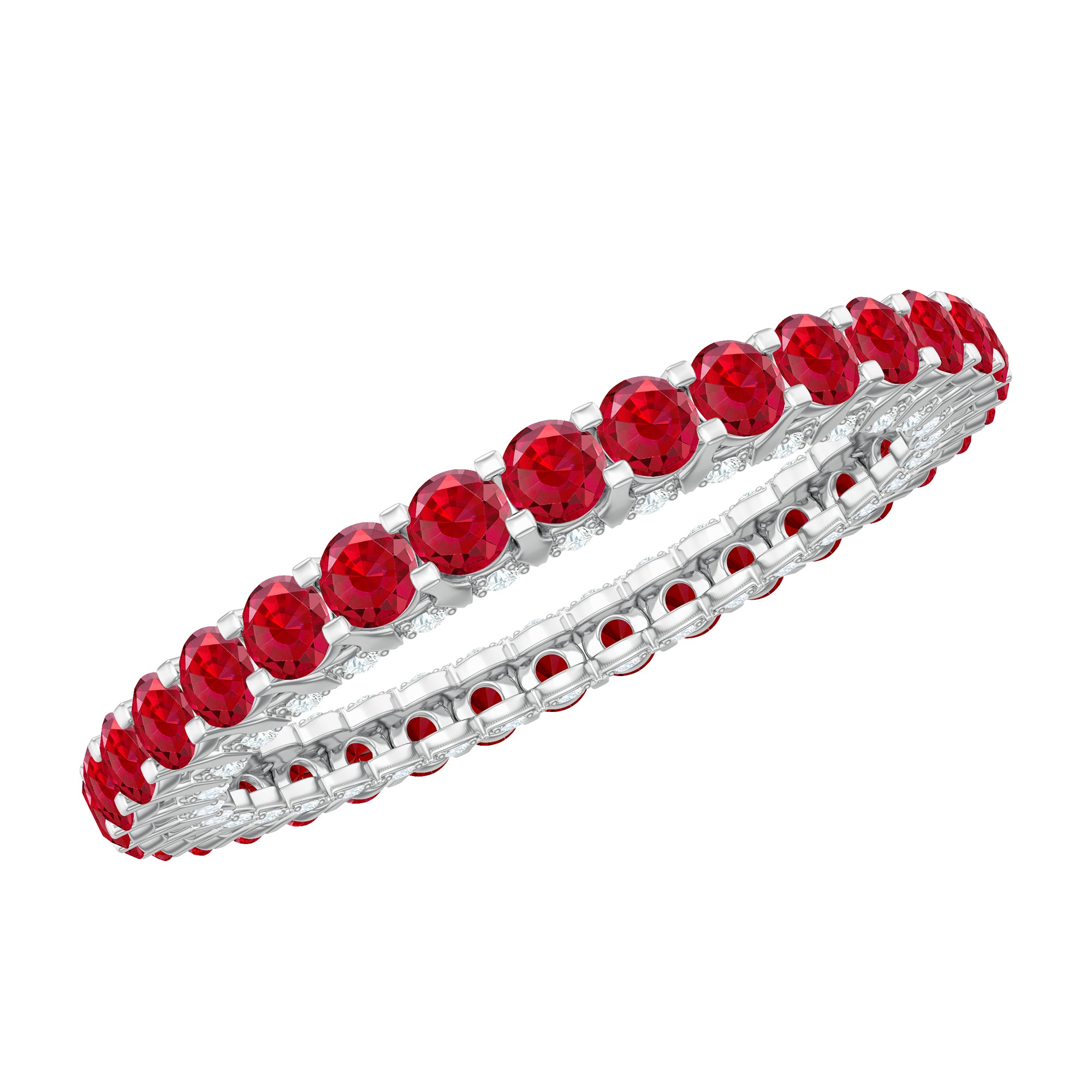Enhance your beauty with this utterly Classic Lab Created Ruby and Diamond Eternity Wedding Band. It is embellished with Round Shape Lab Created Ruby and sparkling Round Diamond studded beautifully on the entire Eternity Band Ring.