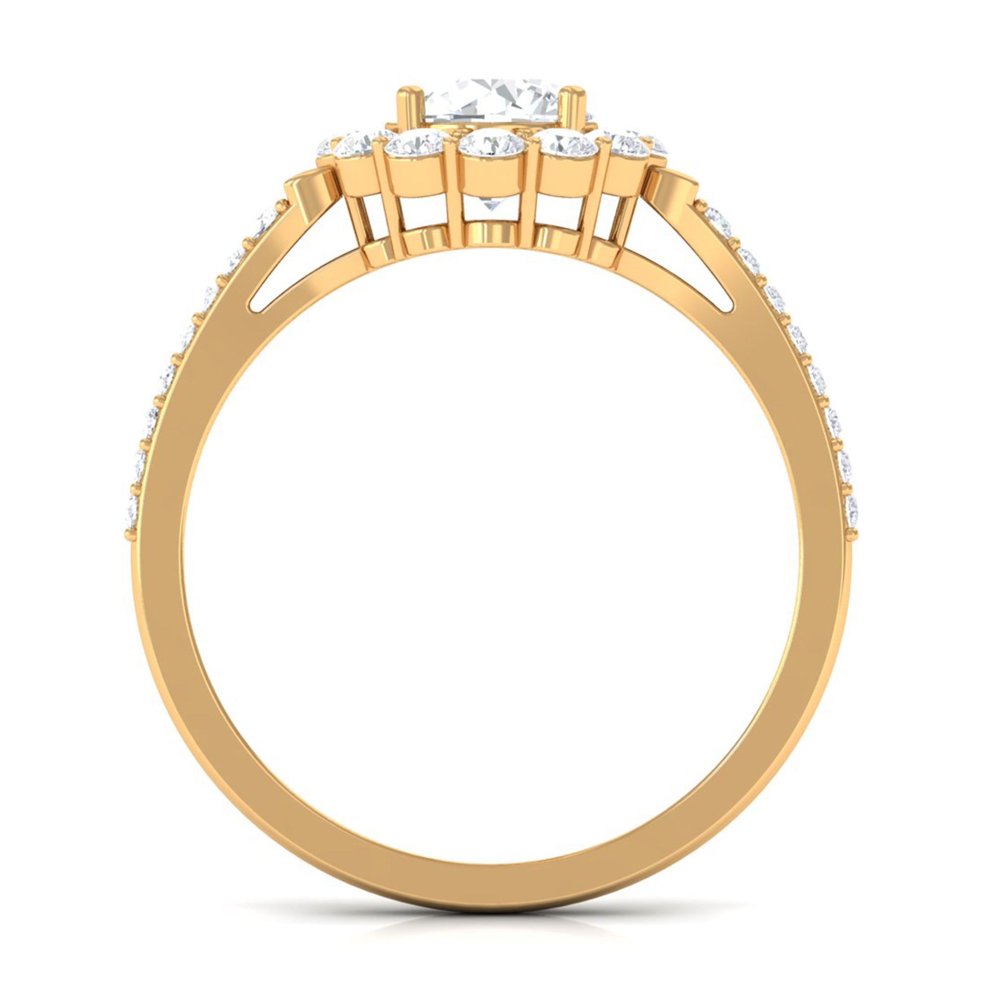 Your love is a tale as old as time, true as it can be. Put this charming Round Halo Engagement Ring on her finger. This Cubic Zirconia Engagement Ring features a Round Shape center stone with an impeccably radiant shine and Little Round Shape Zircon set as Halo and Side Stones in a simple way, crafted in gold.