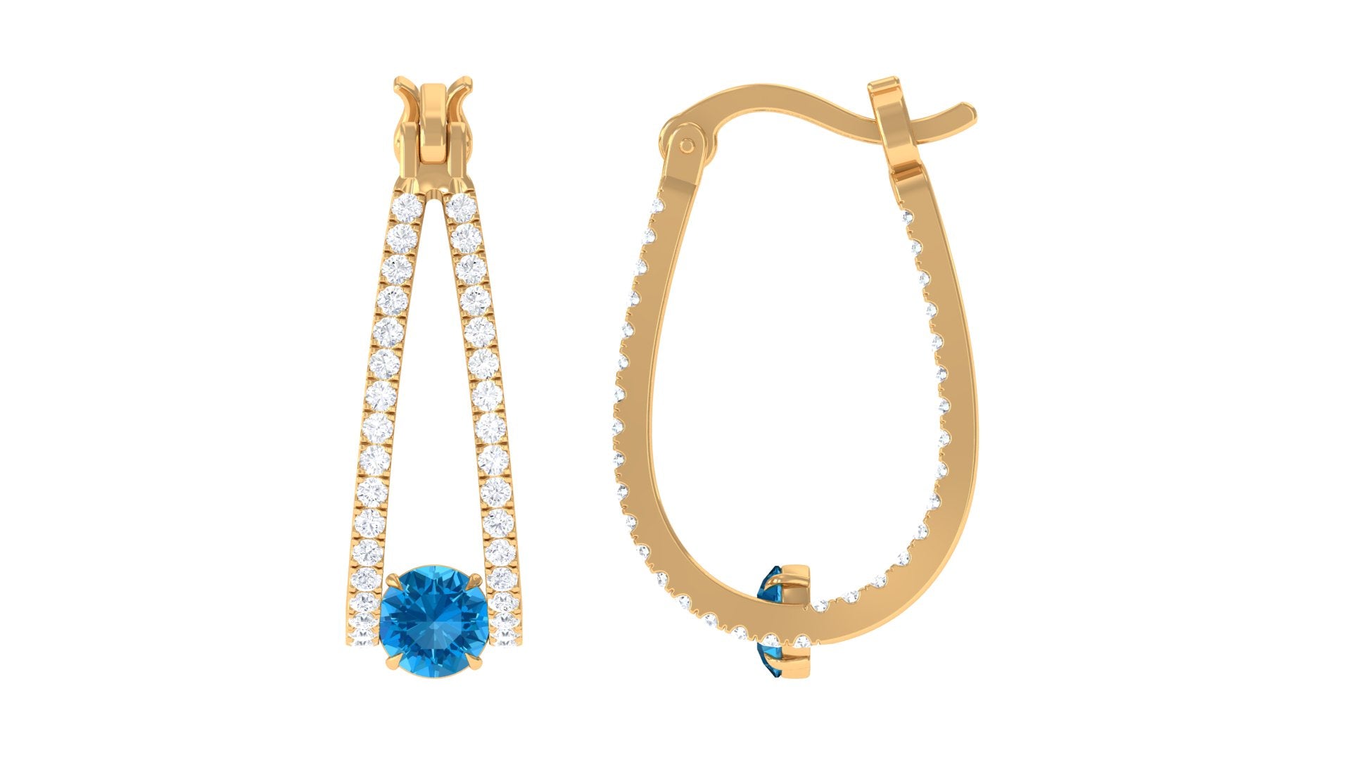 Dazzle your way through with this Statement J Hoop Earrings is adorned with Round Shape Swiss Blue Topaz in a pave setting and round shape Diamond in a pave setting. Statement Hoop Earrings is available in solid gold.