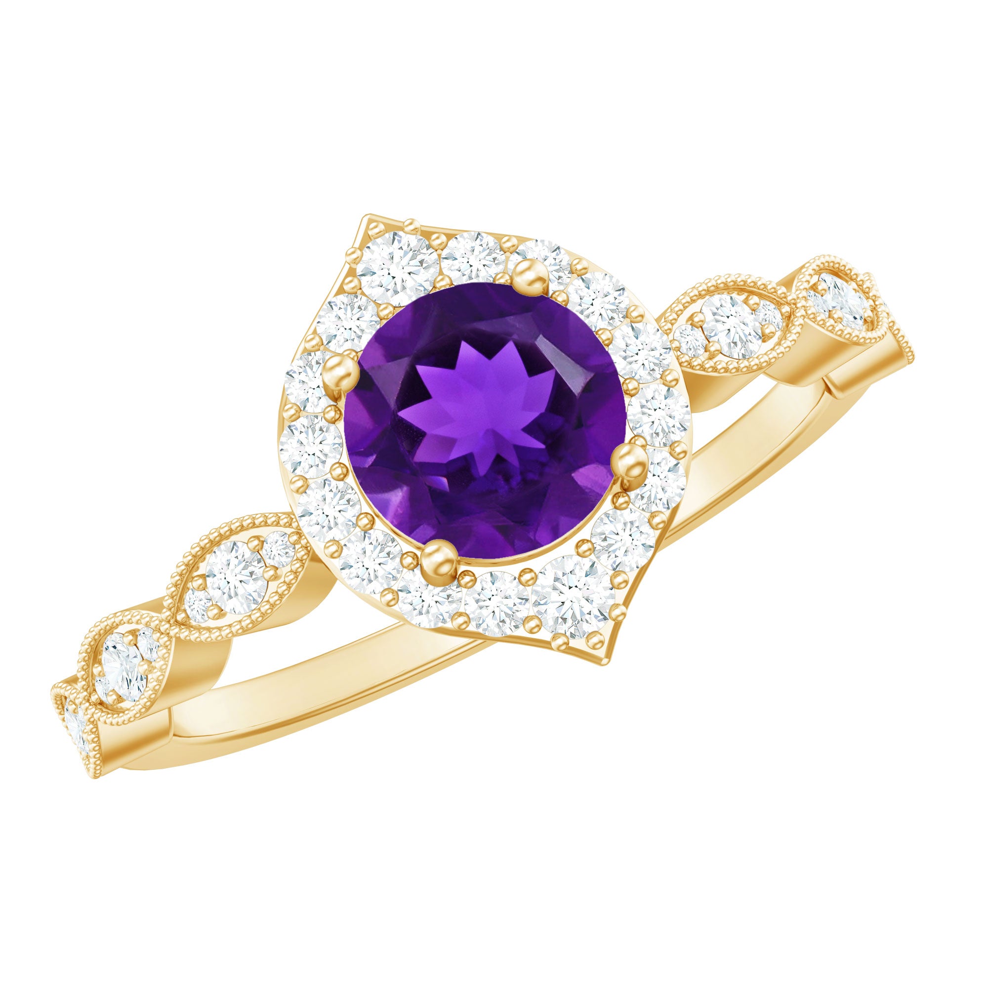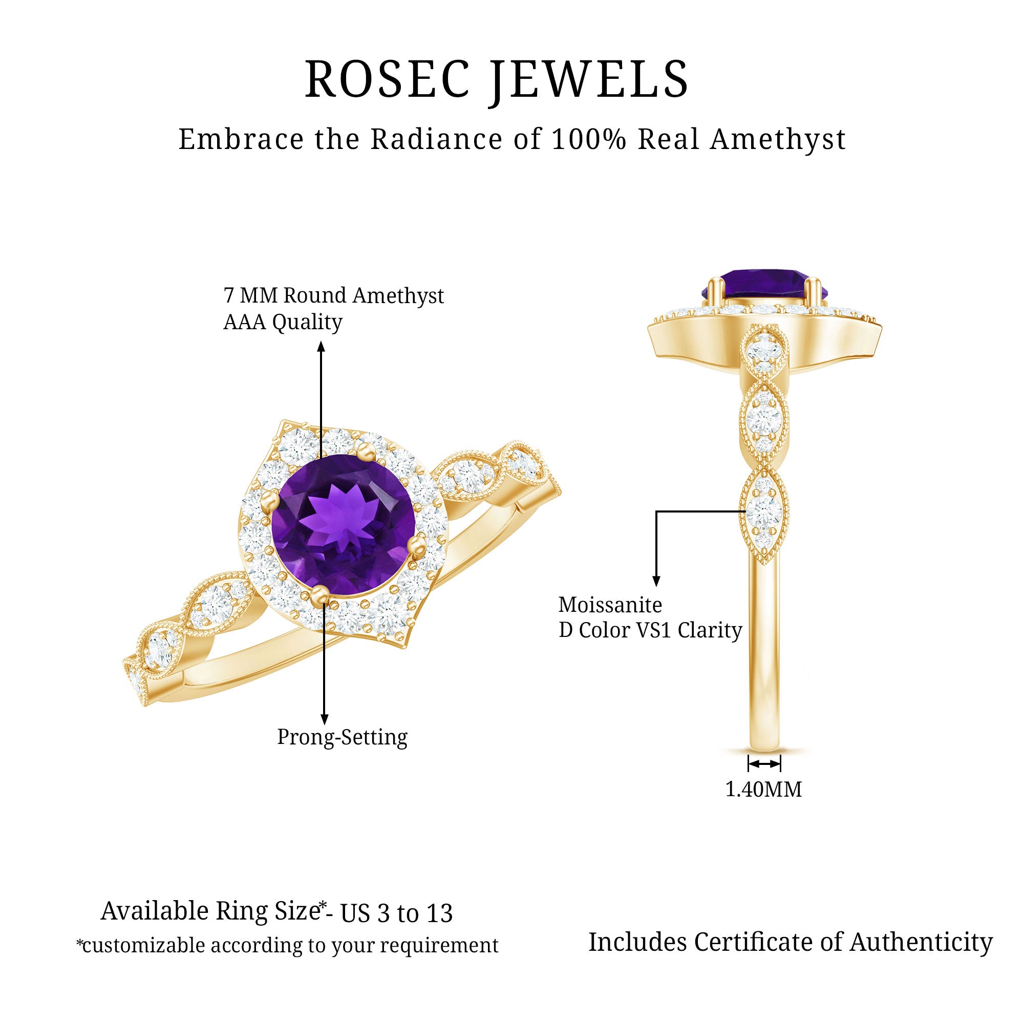 Glamorous Prong Set Amethyst sparkle along this Engagement Ring and beautifully accented by moissanite. This Timeless Amethyst Engagement Ring is made in Gold to showcase the brilliance of this scintillating ring. This Vintage Amethyst Ring is classy and has an opulent appeal.