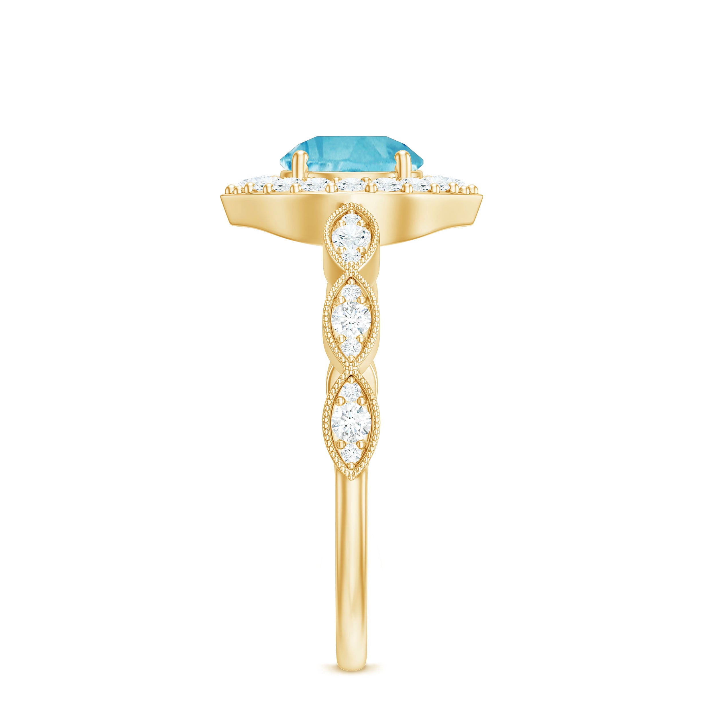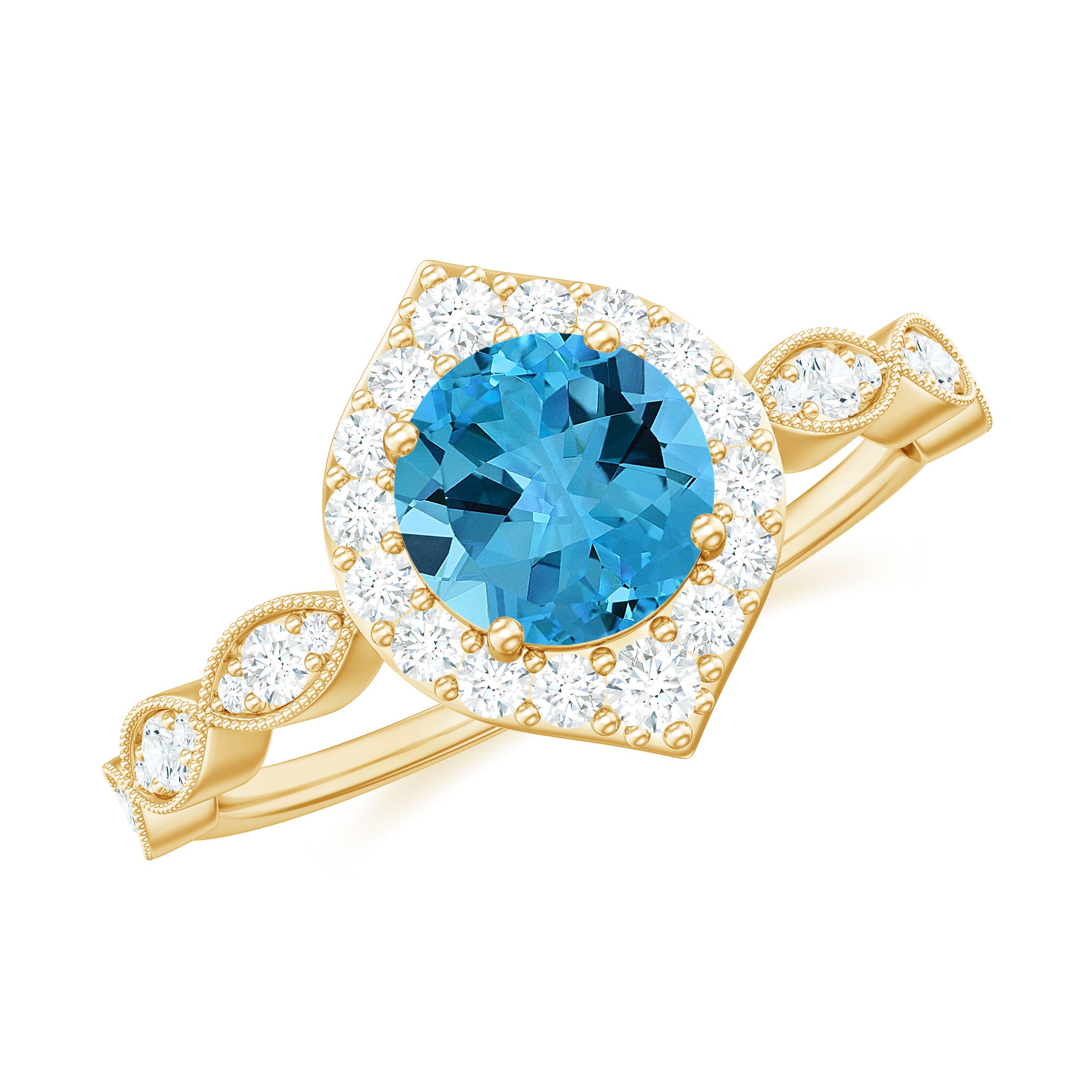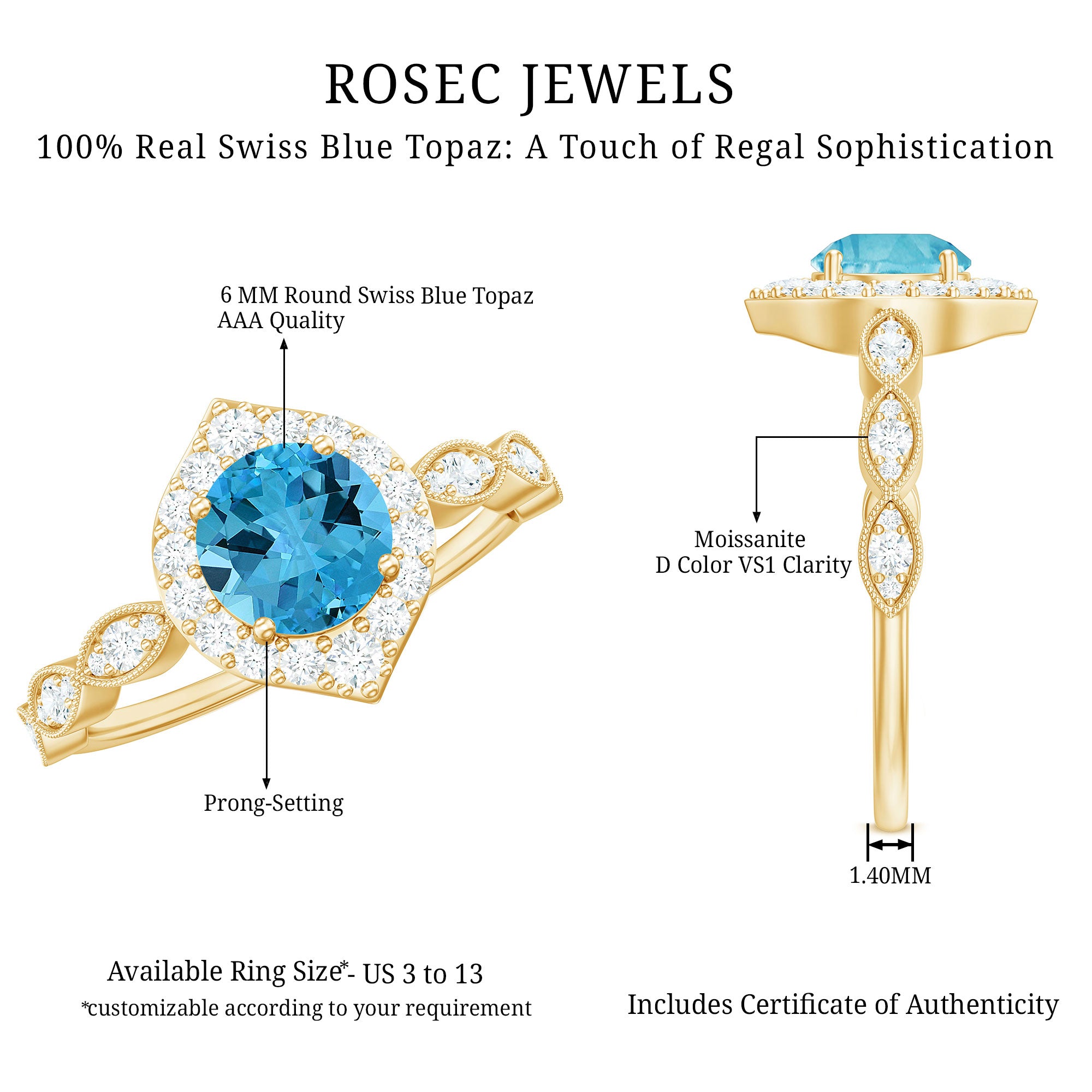Glamorous Prong Set Swiss Blue Topaz sparkle along this Engagement Ring and beautifully accented by moissanite. This Timeless Swiss Blue Topaz Engagement Ring is made in Gold to showcase the brilliance of this scintillating ring. This Vintage Ring is classy and has an opulent appeal.