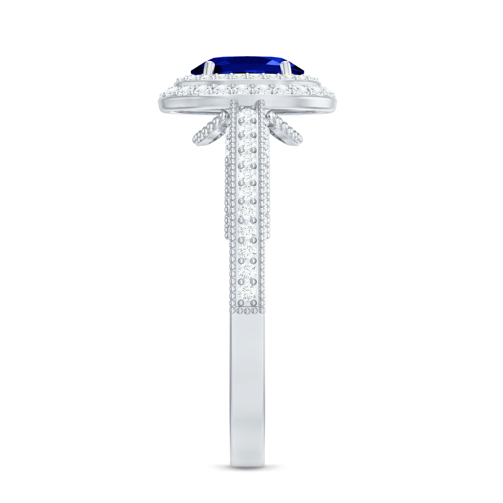 Timeless yet undeniably captivating, this Vintage Inspired Engagement Ring brings romance and elegance together in the most enchanting way. At the center of this stunning piece rests a brilliant 5X7 mm Oval Shape Lab Created Blue Sapphire set in Prong Setting, glowing with deep, royal blue tones that symbolize loyalty, passion and everlasting devotion. Surrounding the center stone is a dazzling Double Halo of sparkling Diamond stones that amplify its beauty, creating a radiant frame that catches the light from every angle. The band itself is adorned with shimmering Diamond stones and intricate Beaded detailing, adding texture and a touch of antique charm that makes the design truly special. Every element of this Oval Engagement Ring is thoughtfully crafted to celebrate love stories that deserve something extraordinary. Whether it marks the beginning of a forever journey or becomes a treasured symbol of commitment, this Lab Grown Blue Sapphire Engagement Ring speaks of romance in the most beautiful way. Presented in a signature jewelry box and available in multiple ring sizes, this Double Halo Engagement Ring is ready to become part of a moment that will be remembered for a lifetime.
