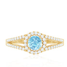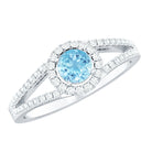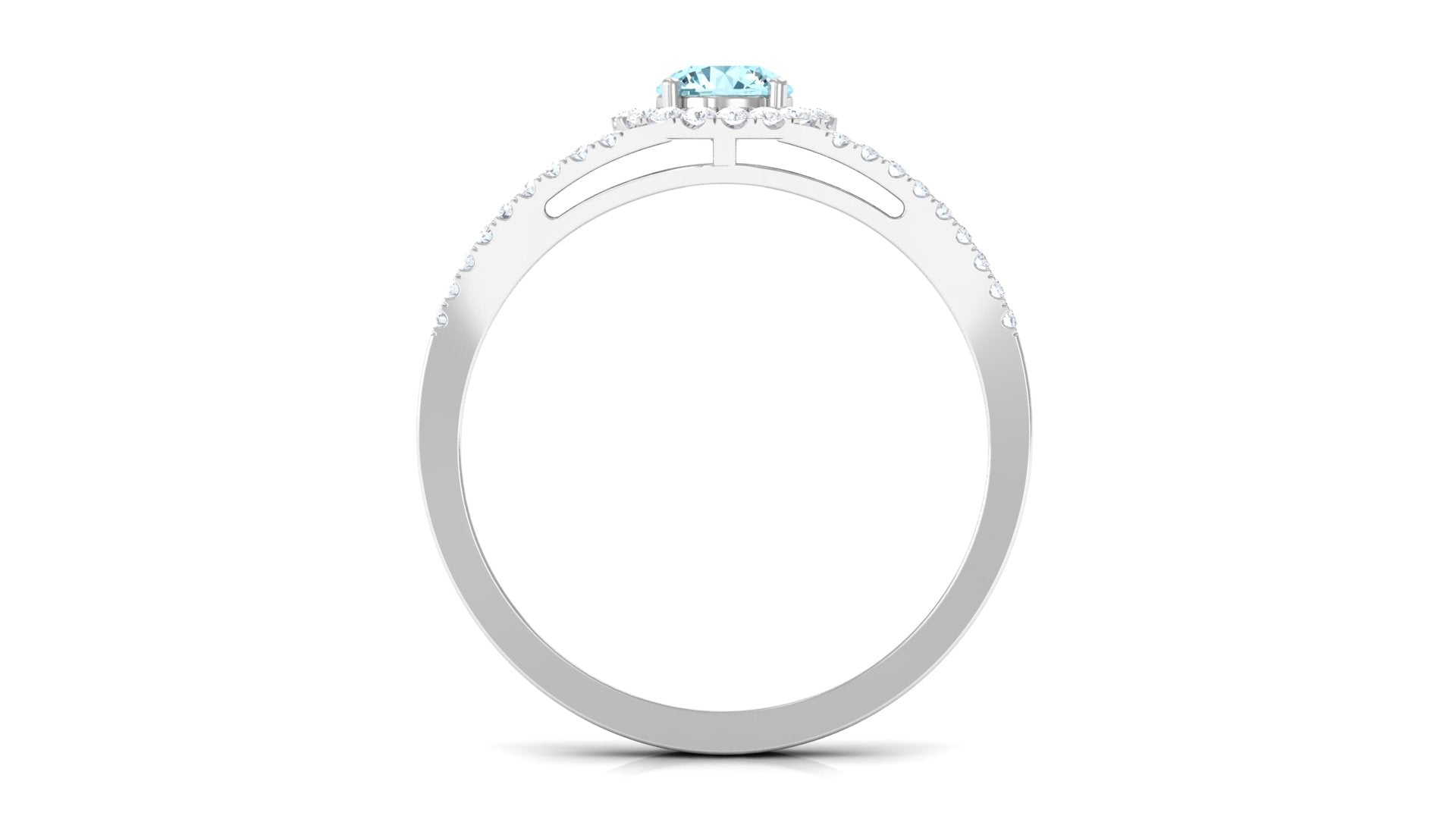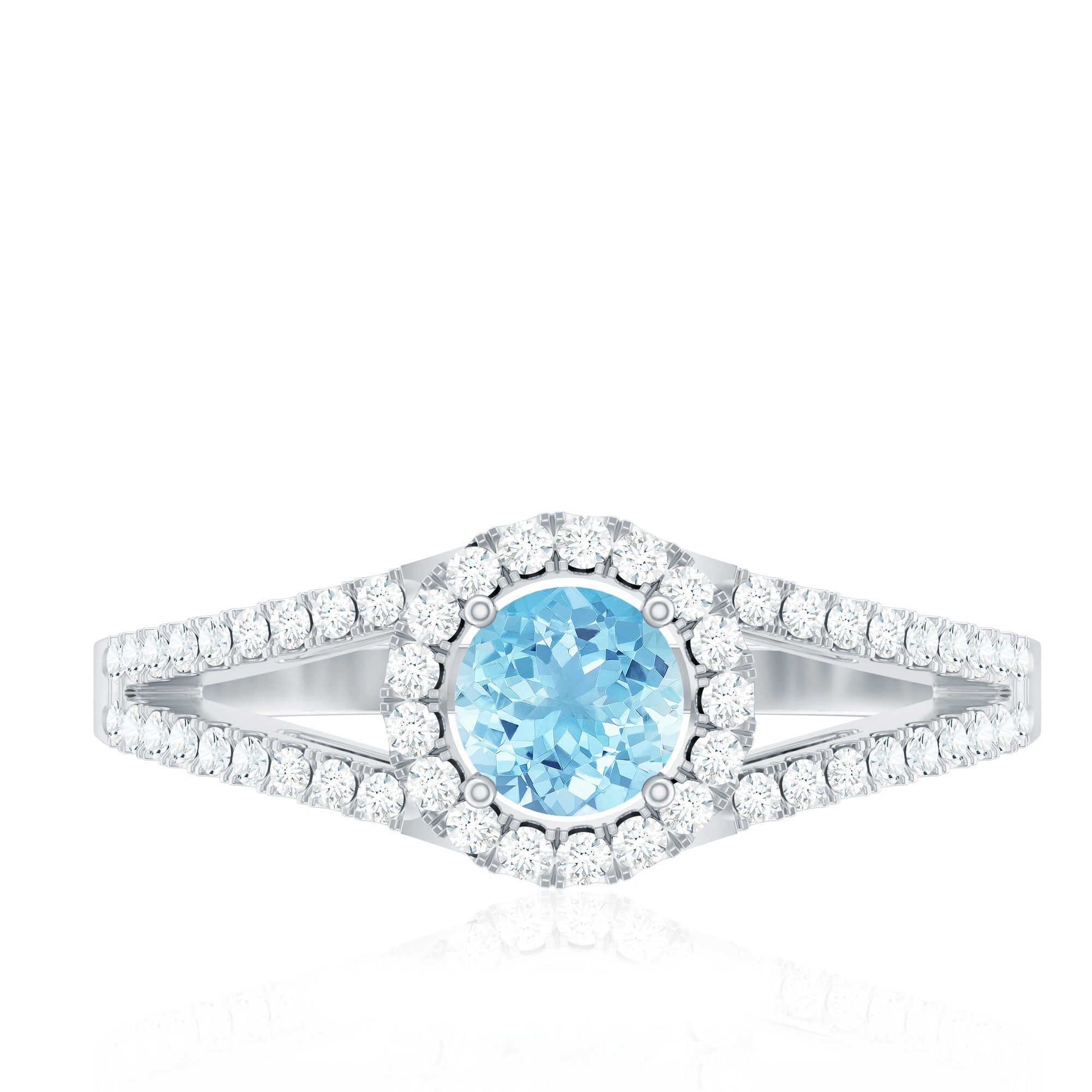 A Lovely and Fabulous Split Shank Engagement Ring has adorned with Round Shape Aquamarine set as a solitaire in a prong setting and Round Shape Diamond in a split shank in a prong setting. This Split Shank Engagement Ring is available in solid gold.