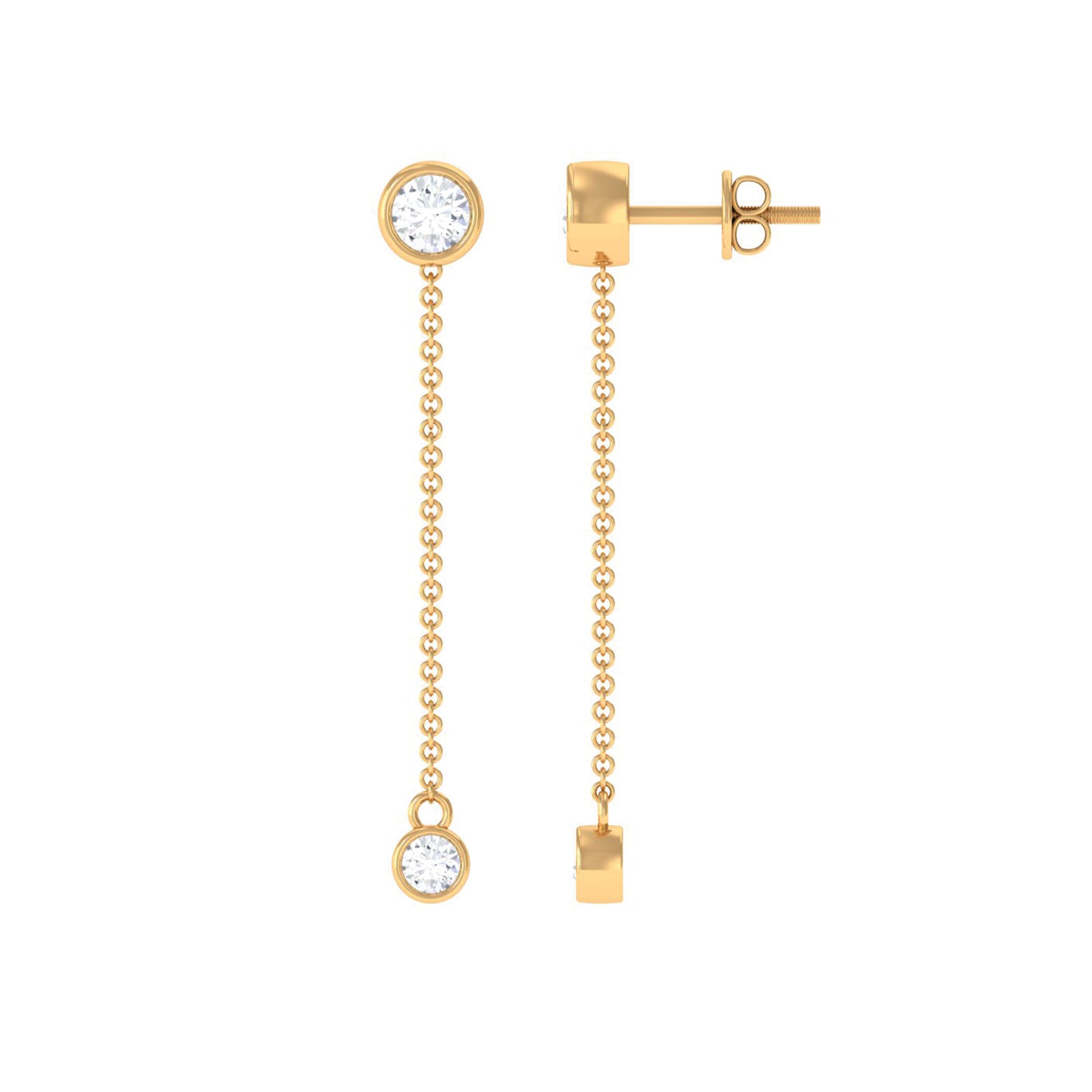 Elevate your jewelry collection with these Moissanite Dangle Earrings. These Chain earrings feature round Moissanite stones in a bezel setting, suspended from a delicate gold chain for an elegant and modern look. Perfect for dressing up any outfit, these earrings are sure to become a favorite in your collection.