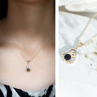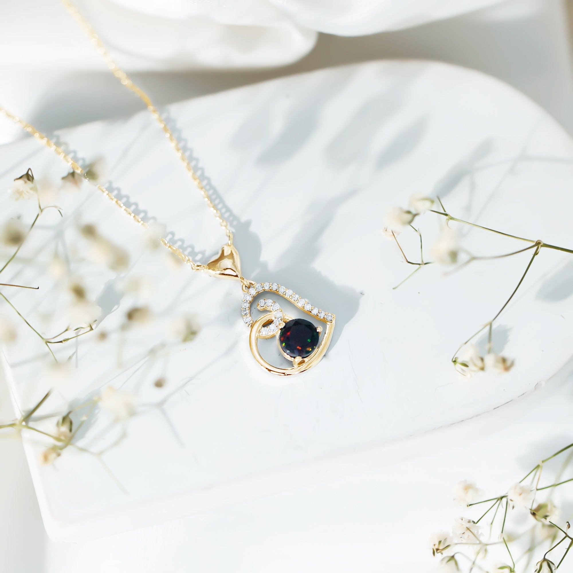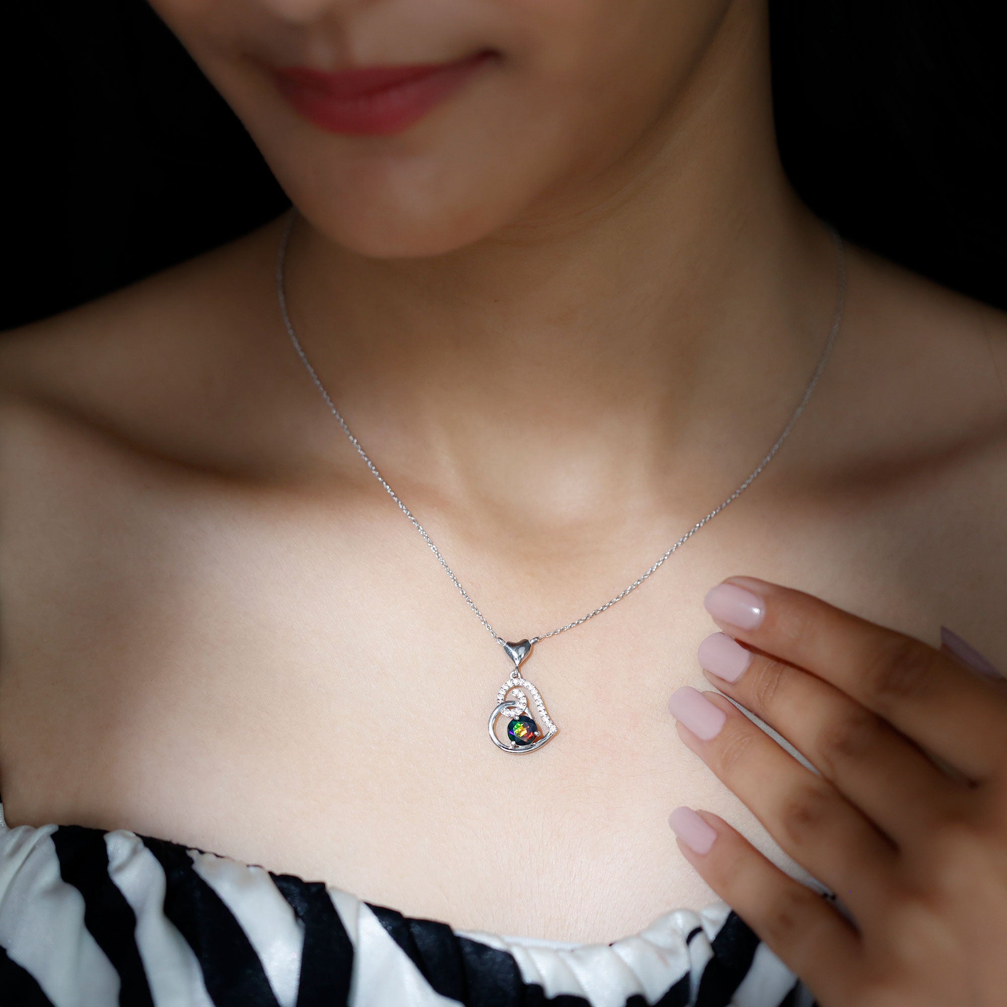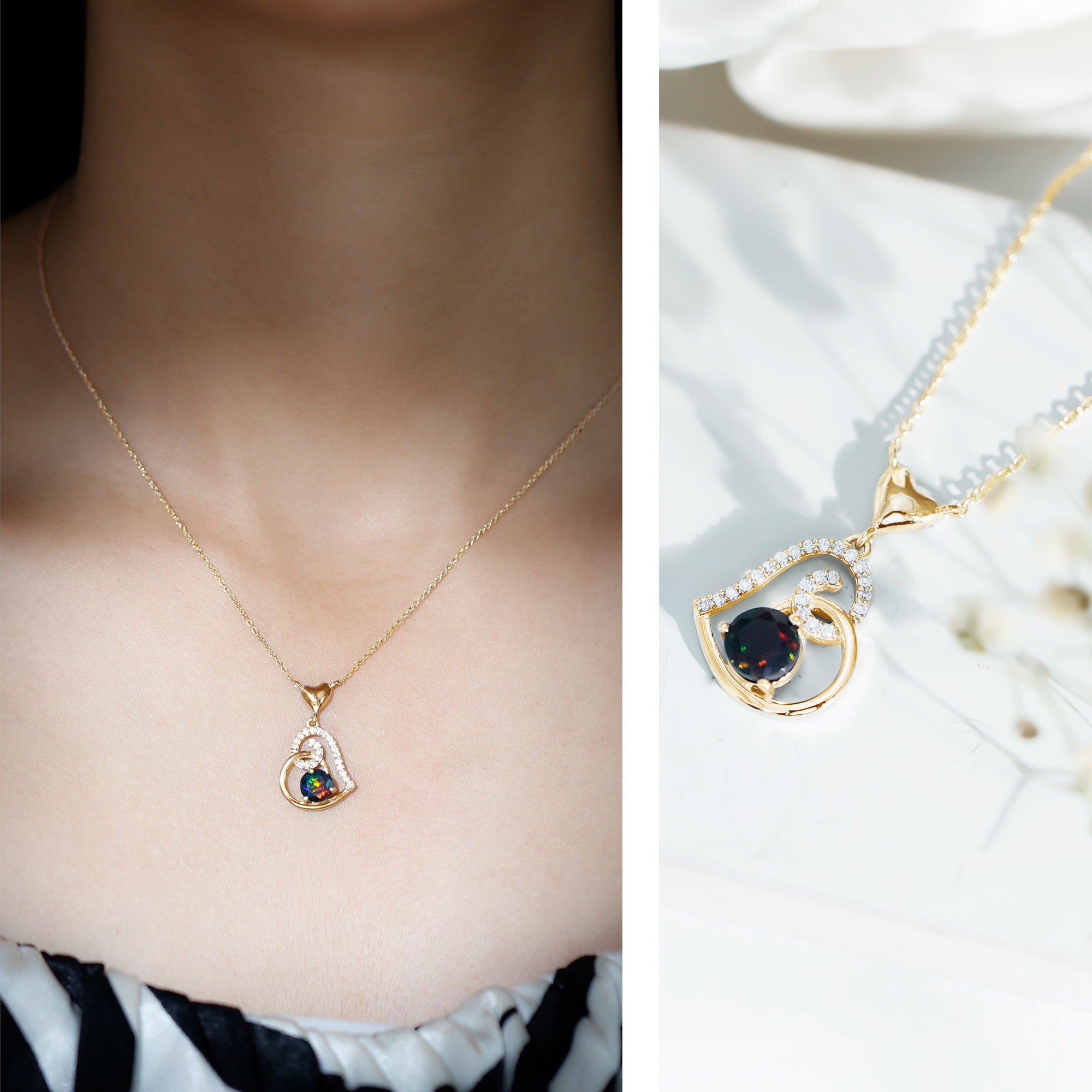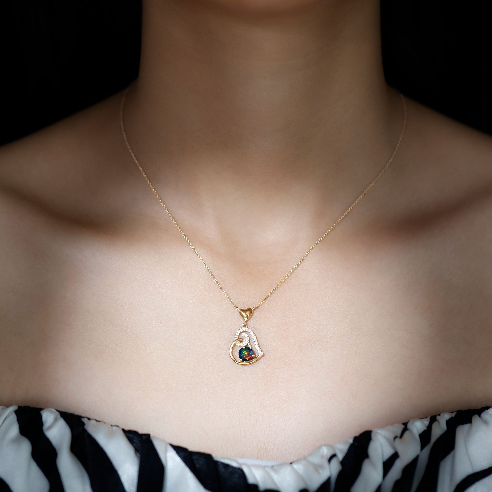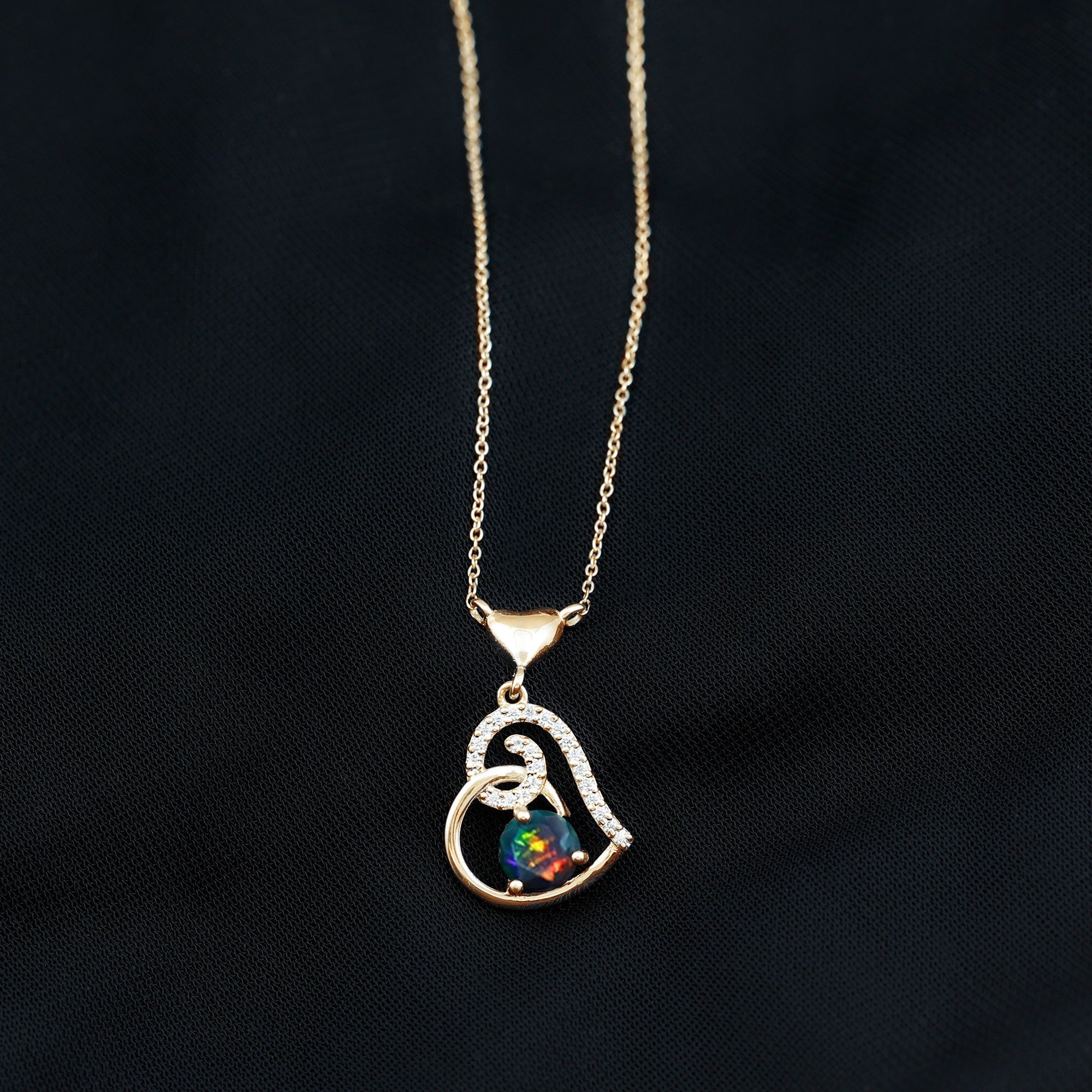 1 CT Black Opal and Moissanite Gold Heart Drop Pendant