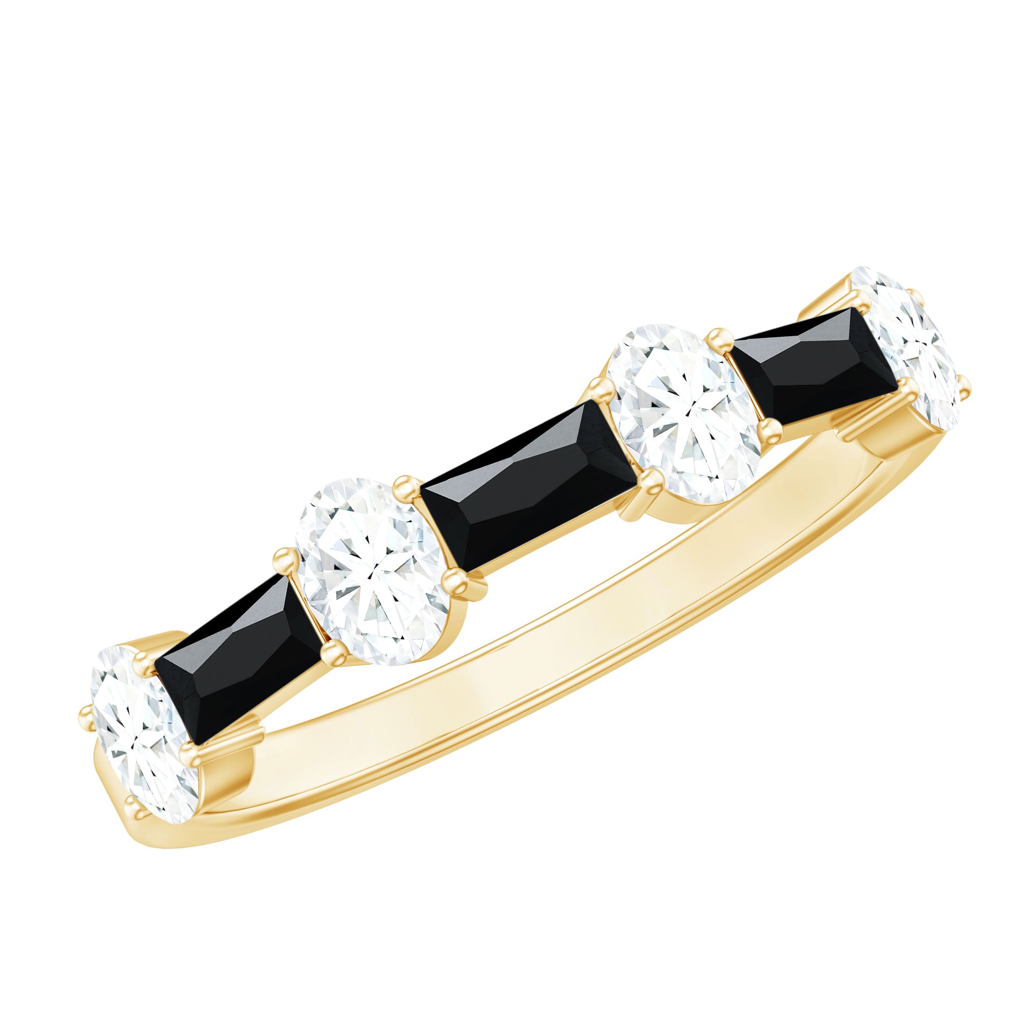 Lift up your look with this Half Eternity Ring, it is featuring Baguette Cut Black Spinel and Oval Cut Moissanite, held in Prong Setting to give this ring enchanting appeal. The Black Spinel and Moissanite are held alternative to each other. This Semi Eternity Ring will add effortless grace and charm to your look.
