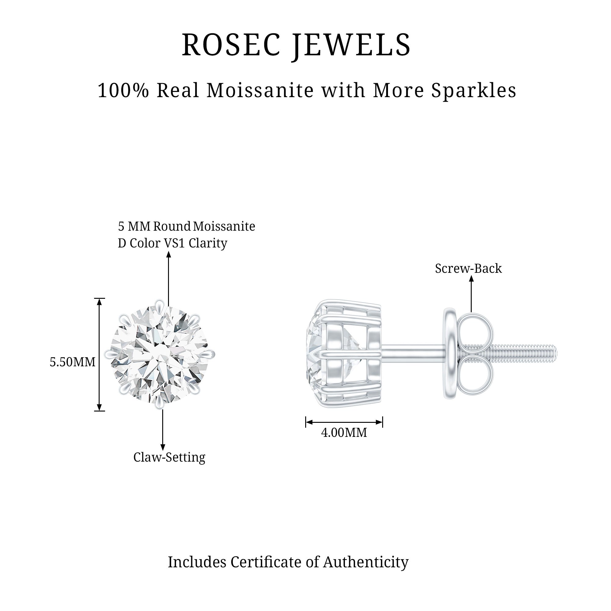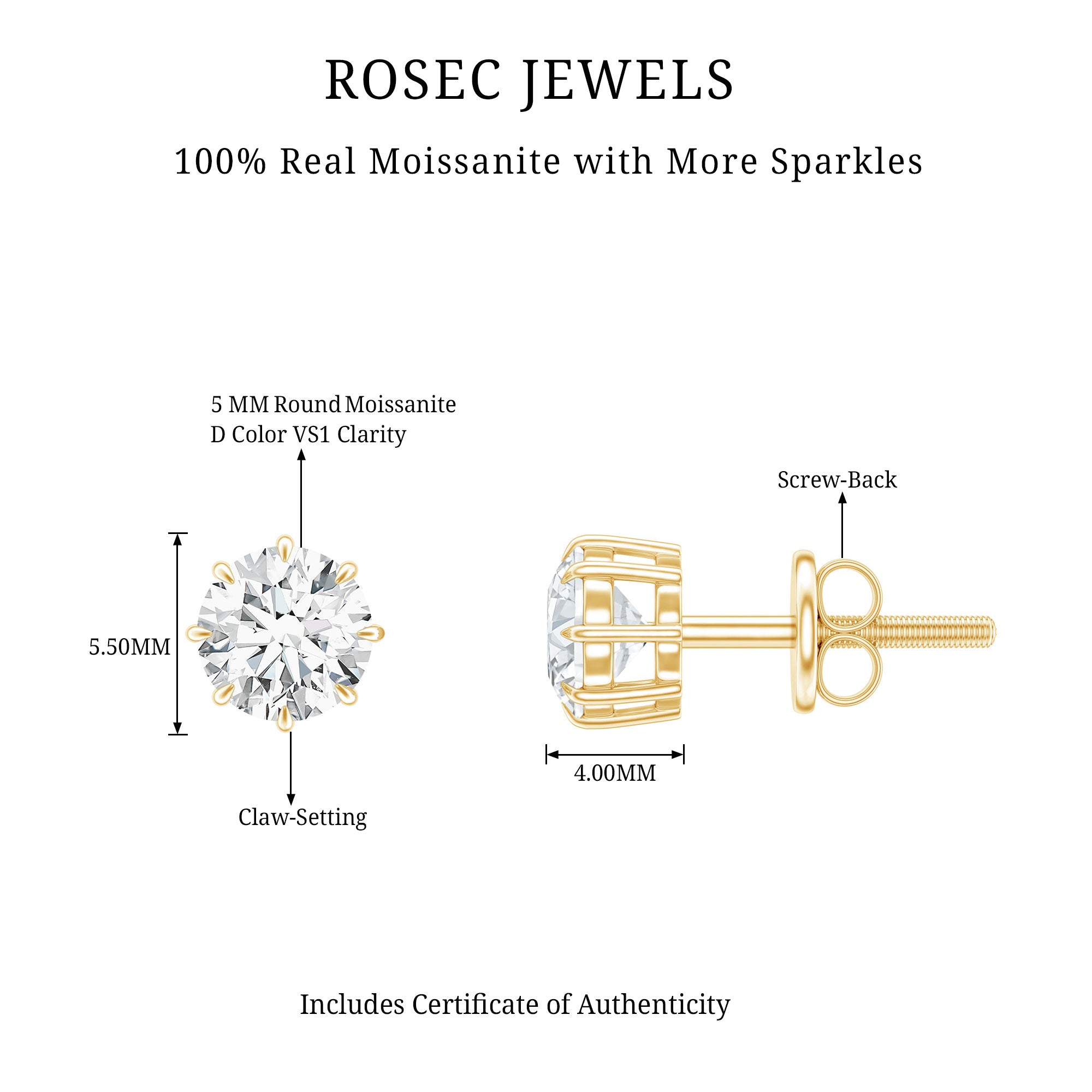 These Stud Earrings, featuring a Round Cut Moissanite set in an 8 Claw Prong Setting, are perfect for any occasion, whether its a New Year party or everyday wear. The screw-back earrings are made of gold and add a touch of elegance to any look.
