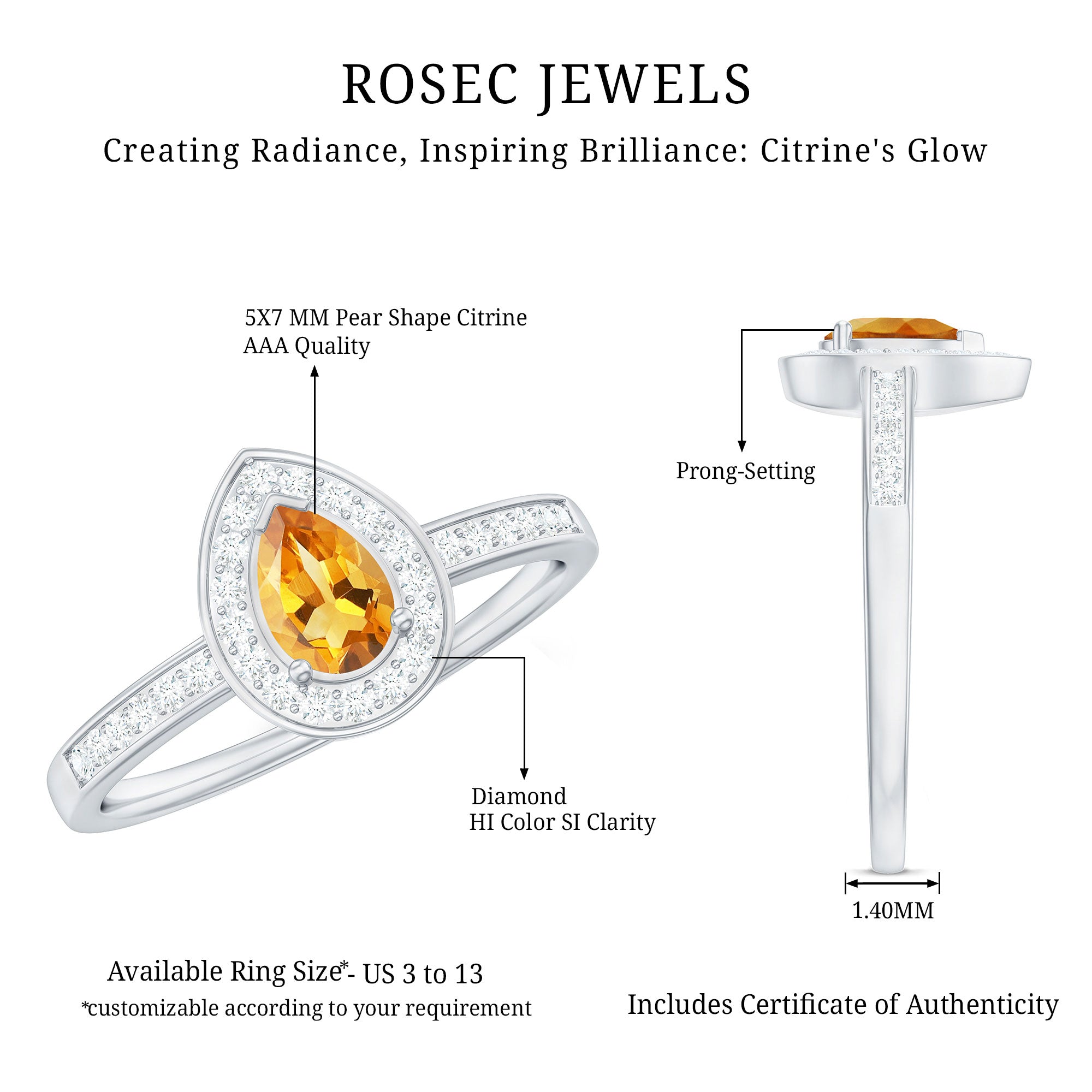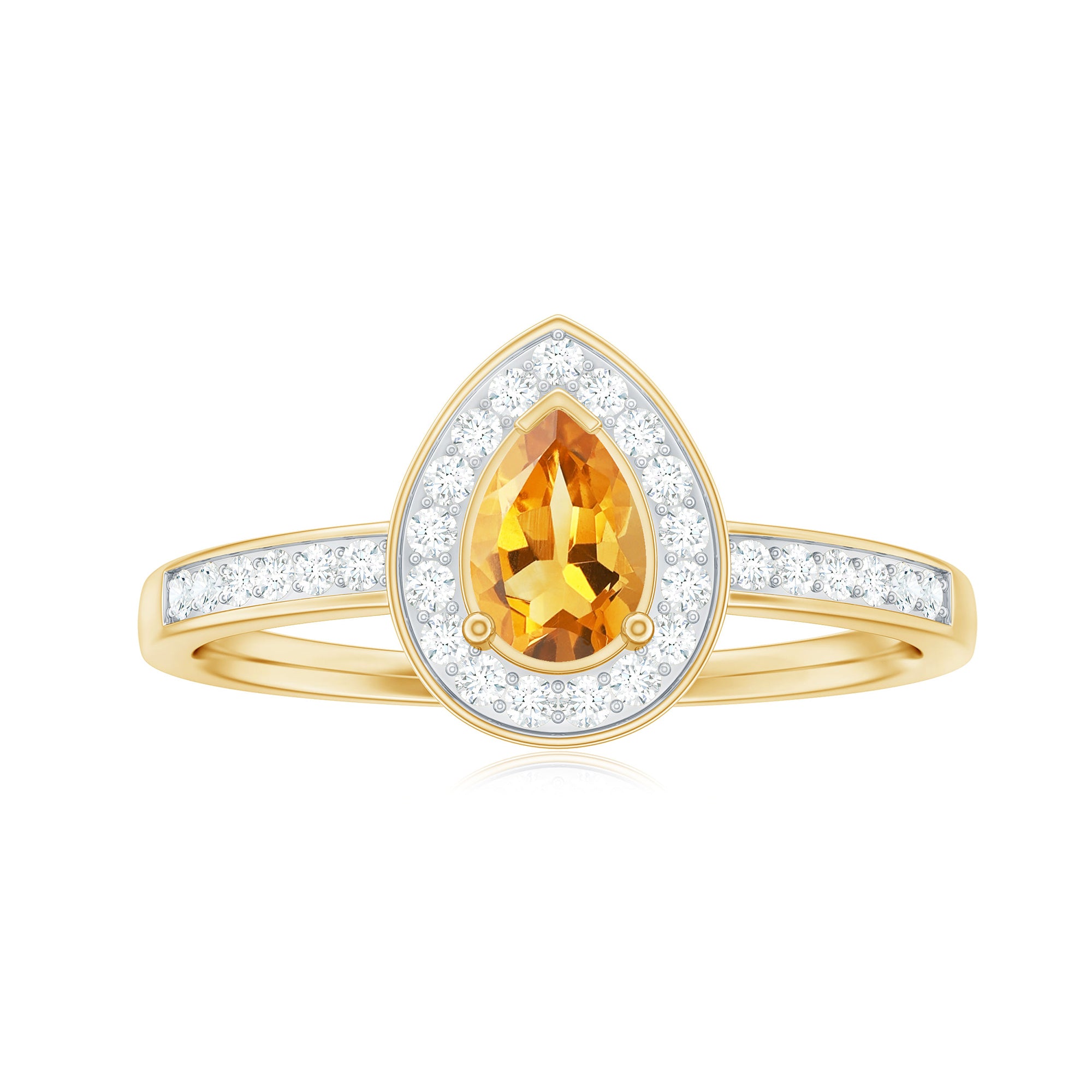 Get this alluring Citrine Engagement Ring adorned with Pear Cut Citrine in Prong Setting and more dainty Round Shape Diamonds studded as Halo and on the shank. The Citrine Ring will make her look elegant when paired with special attires. Declare your feelings for your partner by getting this Halo Ring and she will find reasons to wear it again and again.