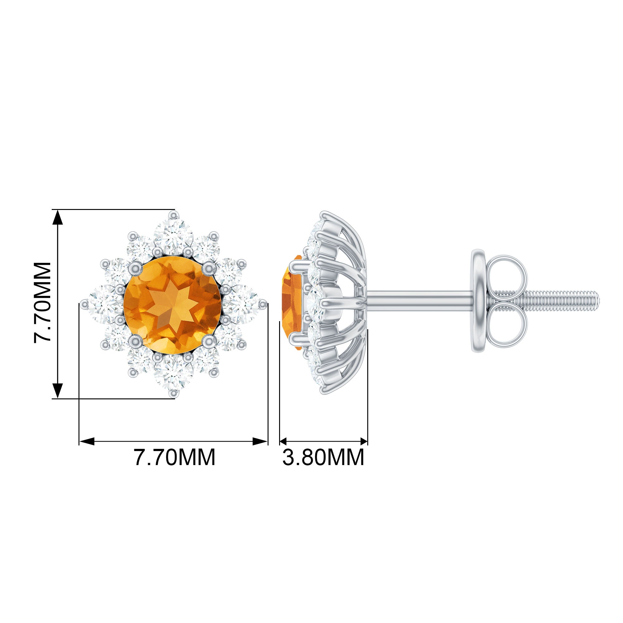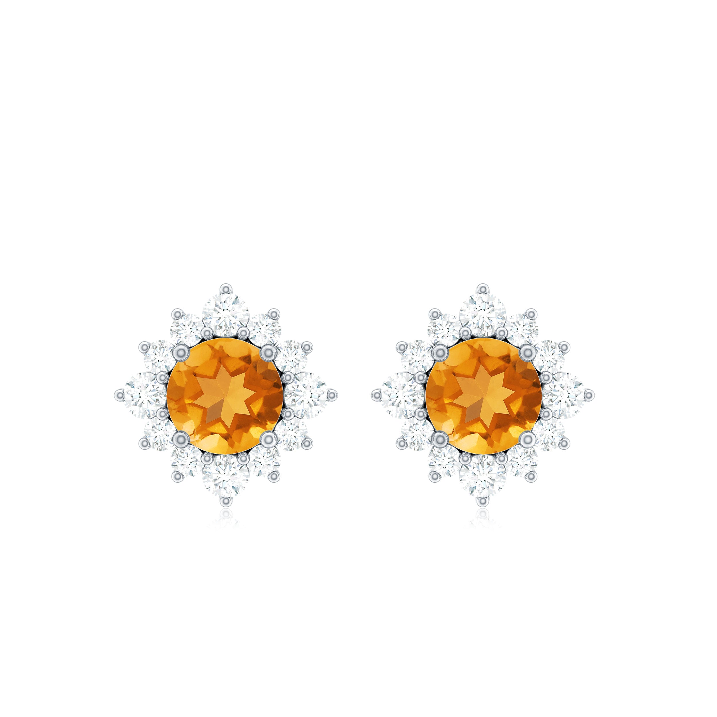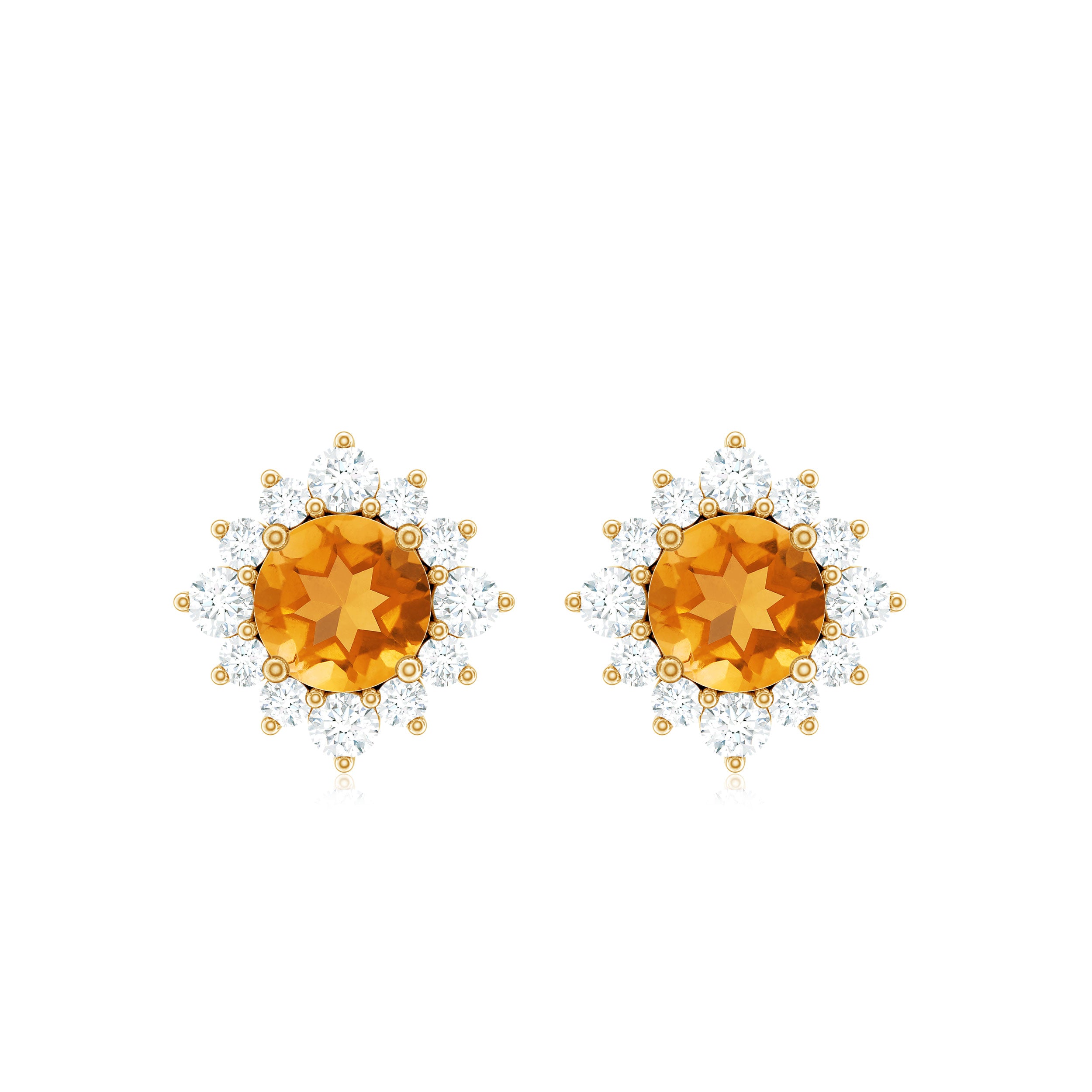 Look as stunning as ever while flaunting this pair of Halo Stud Earrings featuring a Round Shape Citrine Gemstone in the center set in prong setting encircled by a Halo of sparkling Round Shape Diamond. The Classic Stud Earrings beautifully crafted in Solid Gold will make you the center of attraction at all your parties.