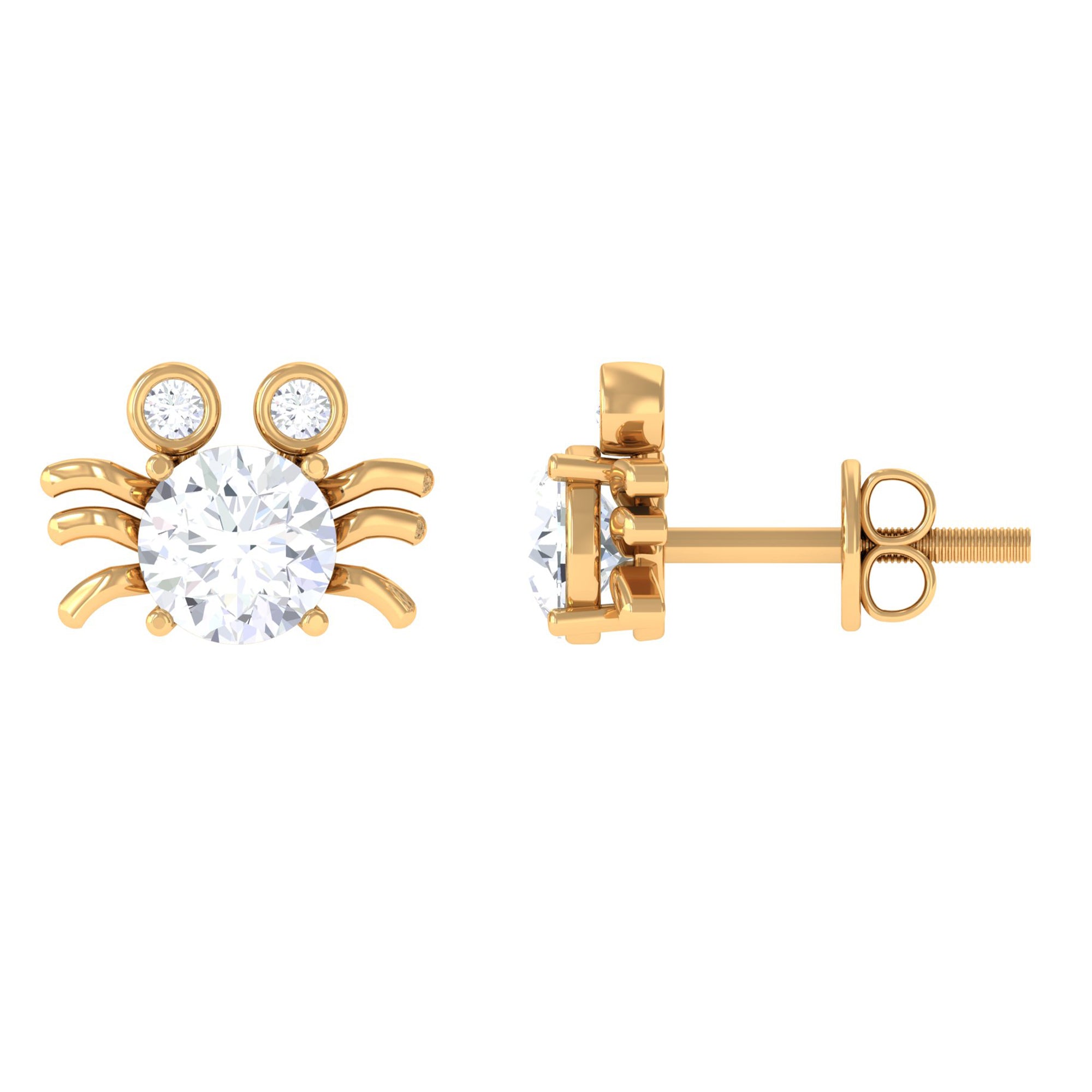 This Cute Crab Stud Earrings are embellished with one Brilliant round shape Moissanite is set at the center in a Prong Setting and two small Brilliant round shape Moissanite are set on the eyes in a Bezel Setting.