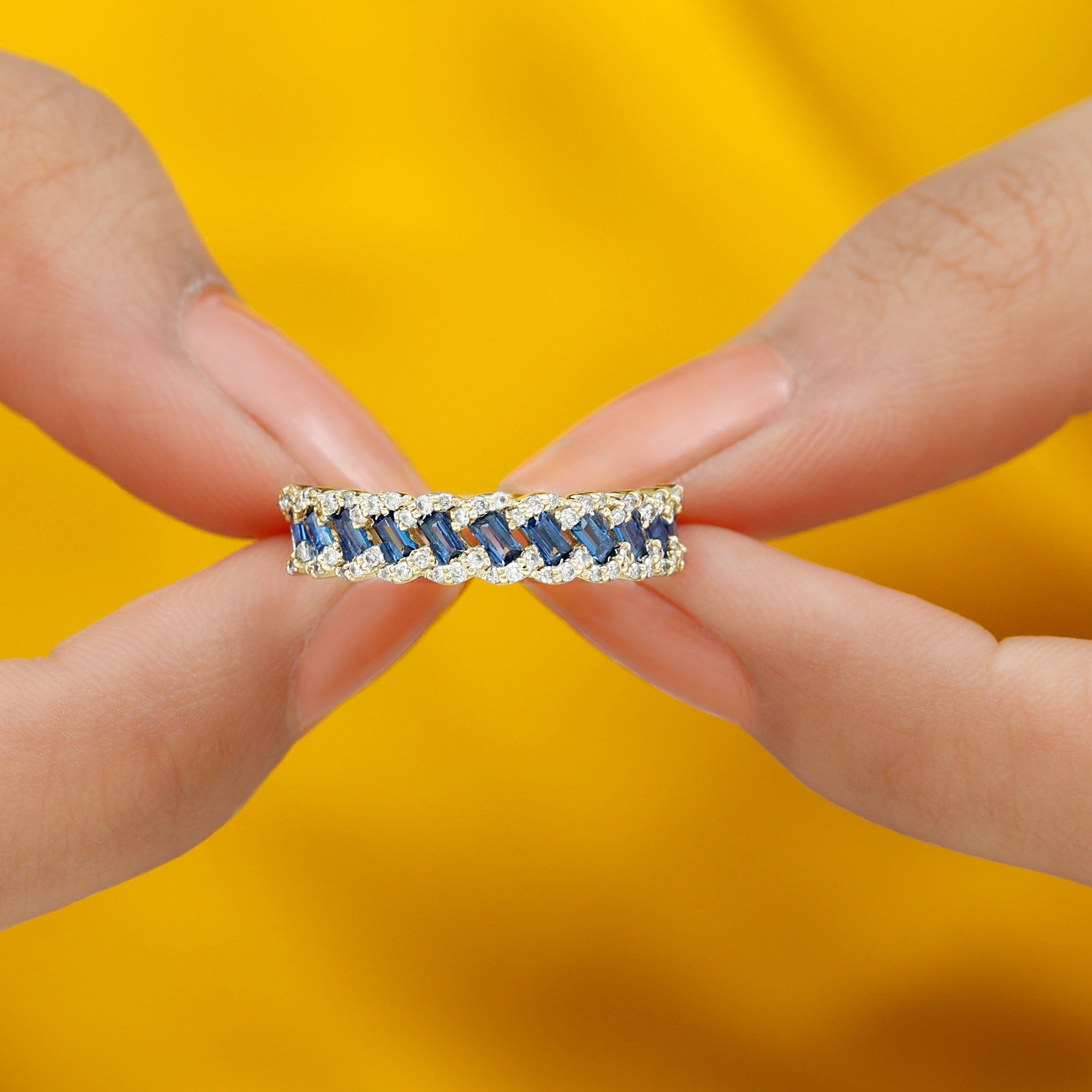 This Braided Band Ring is designed with Baguette Cut Lab Created Blue Sapphires and Round Diamonds in channel and prong setting. This Diamond Wedding Ring is mounted in Solid Gold. Make your bond more strong by presenting this ring as an anniversary gift.