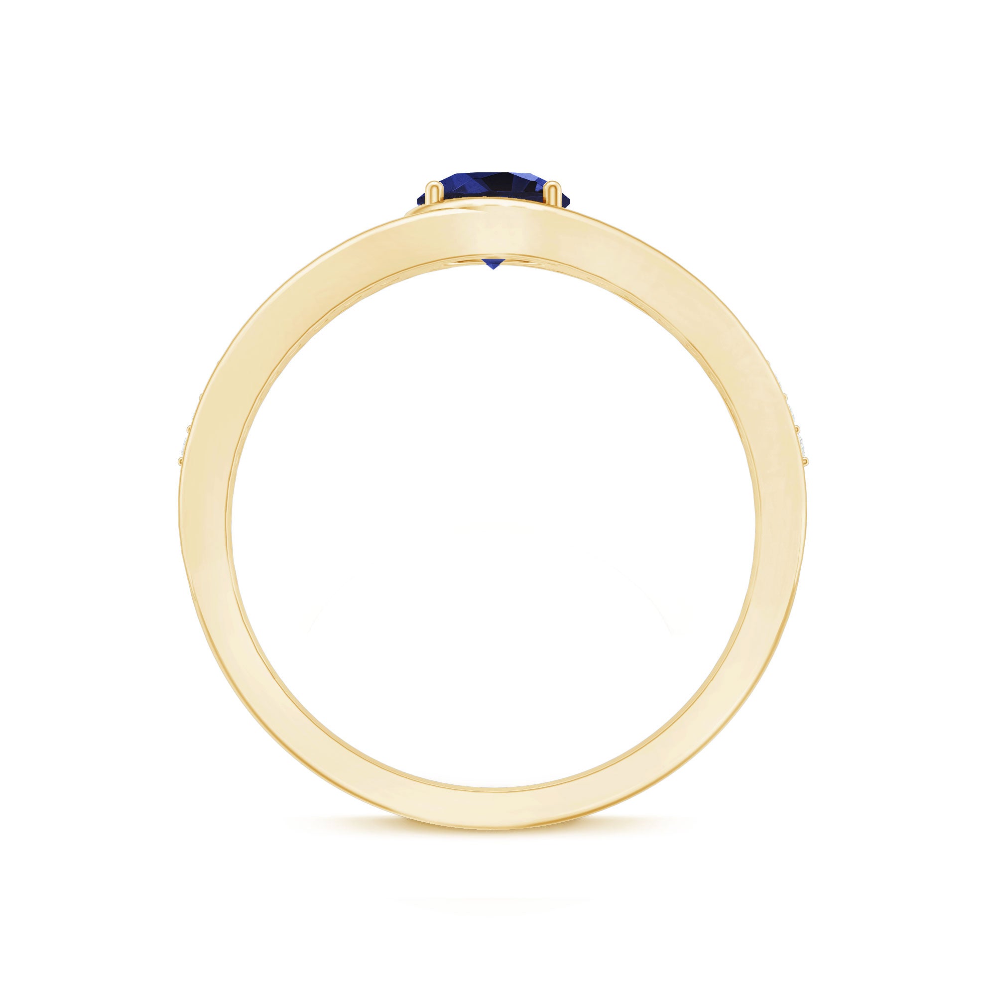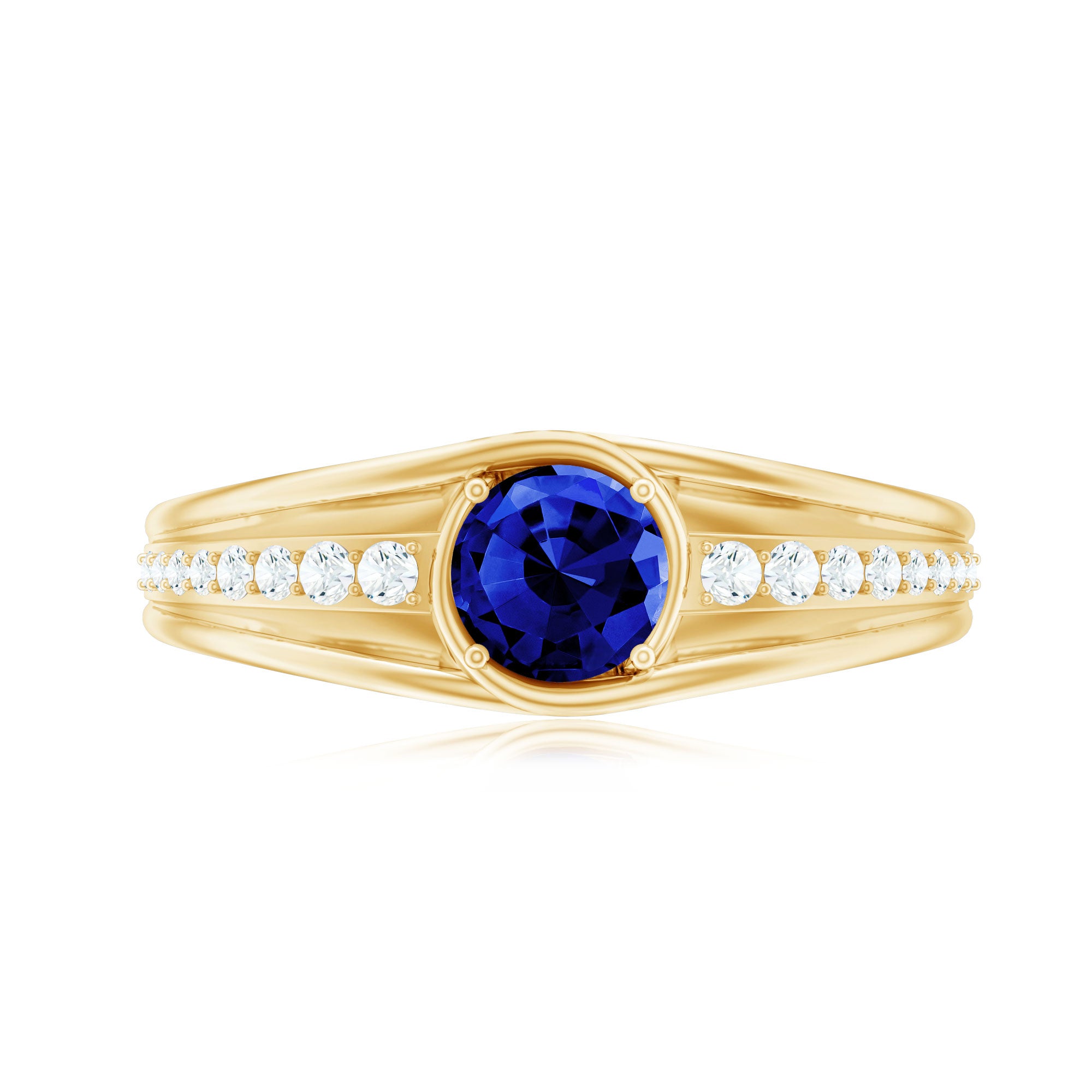 Classic Solitaire Engagement Ring is set with Precious Round Shape Lab Created Blue Sapphire as Solitaire and Diamond in Side Stones in the Prong Setting. It has a Bypass Shank setting with Solid Gold Metal which enhances the charm and beauty of the Ring. Solitaire Split Ring is crafted in Solid Gold. Perfect Engagement Ring for her and surprise your lady with this beautiful ring.