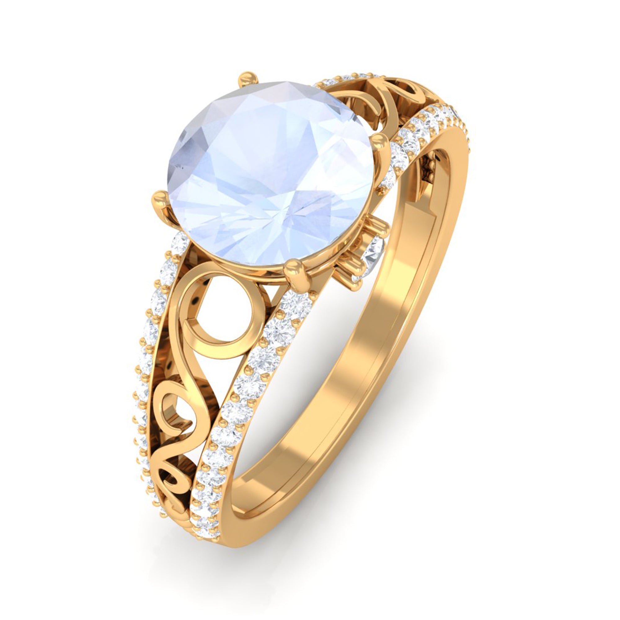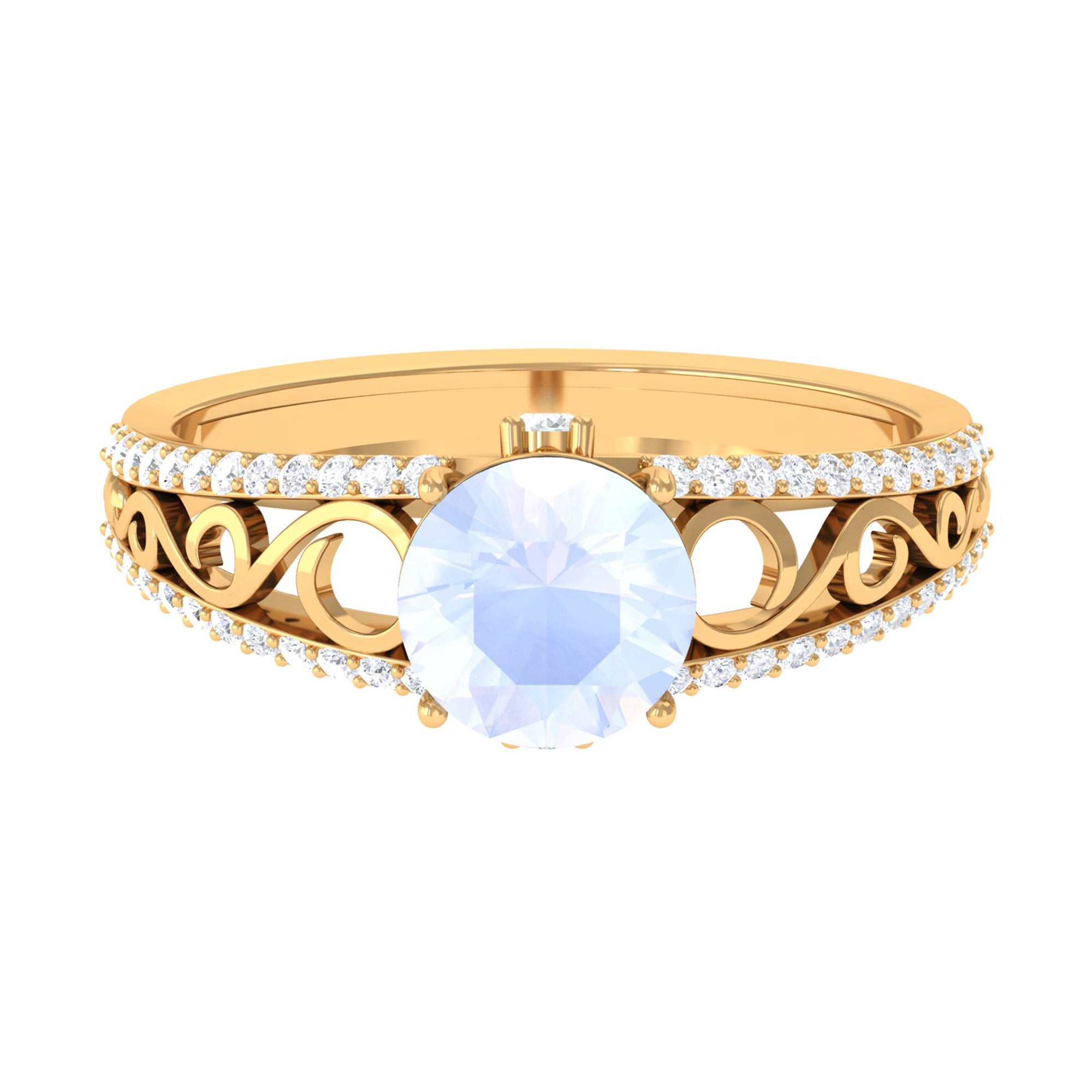 Be the star of the party with this Diamond Engagement Ring. It features Round Shape Moonstone as Solitaire with Diamond Accented on Designer Ring. Crafted in Solid Gold on Solitaire Engagement Ring. Make her yours by proposing with this Moonstone Engagement Ring.