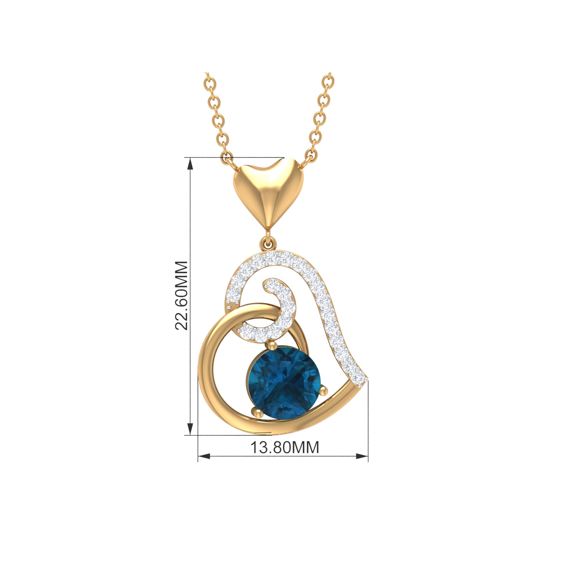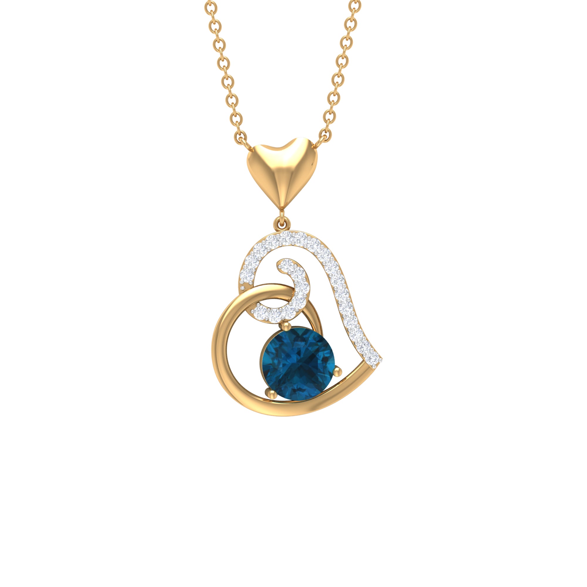 Be Dazzle with these beautiful Heart Drop Pendant embellished with Round Shape London Blue Topaz as Solitaire in 3 Prong Setting and Round Shape Diamond in Prong Setting, Crafted in Solid Gold.