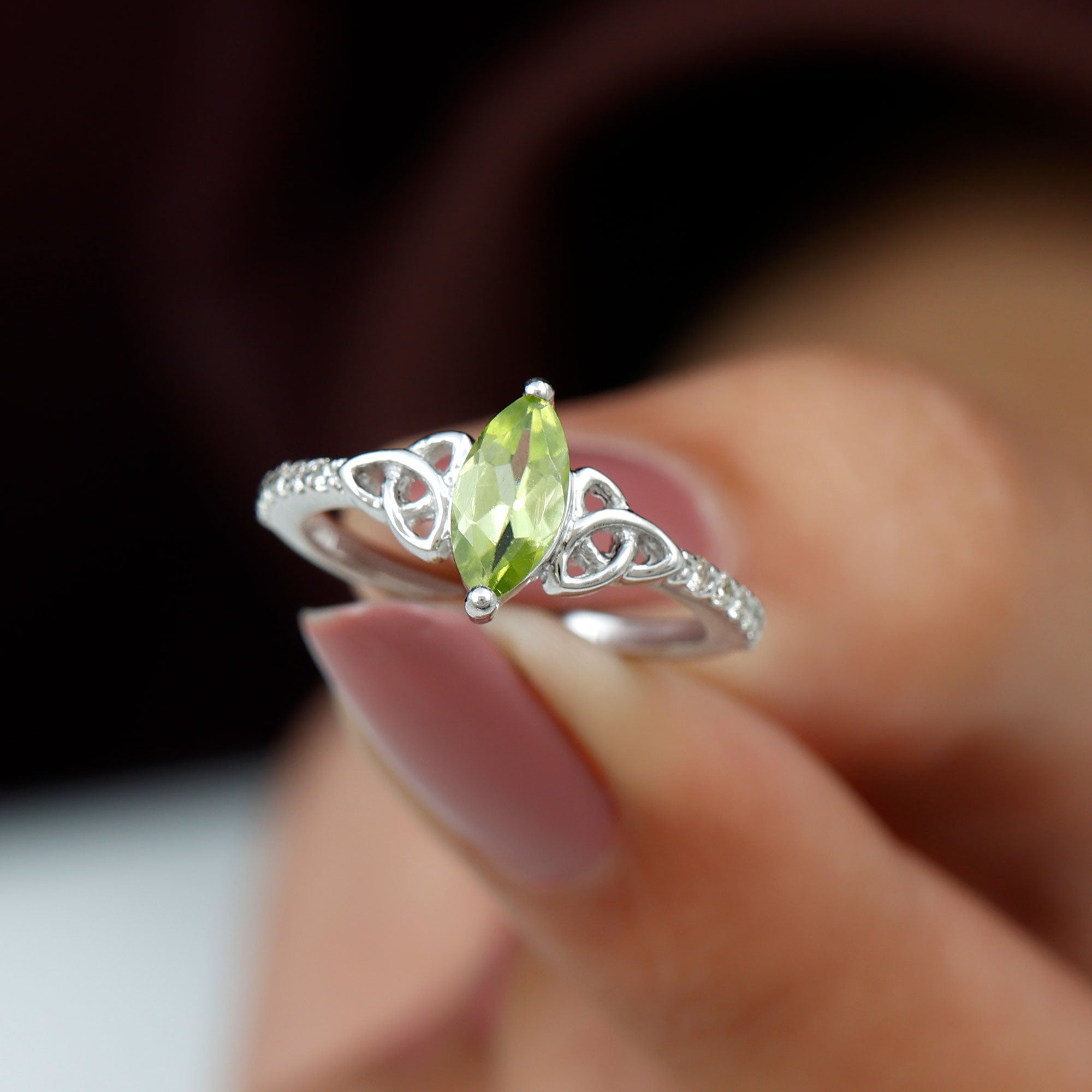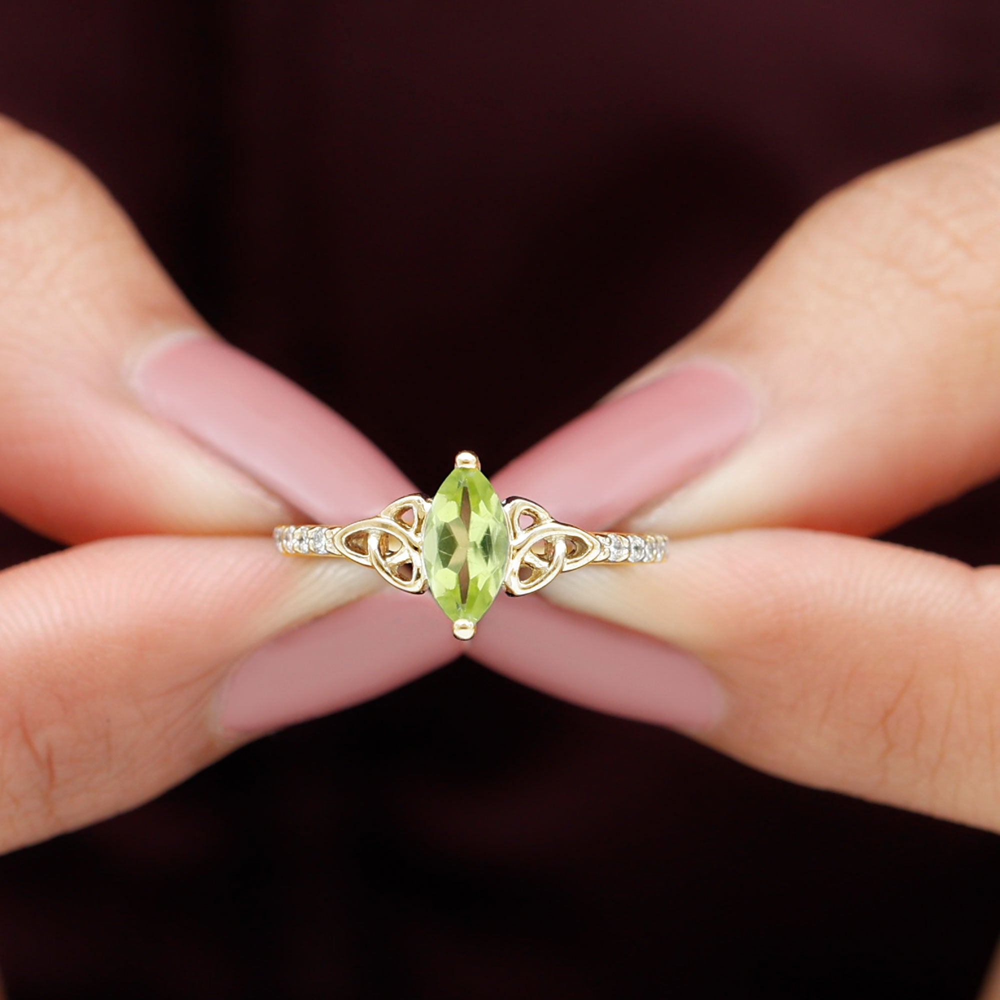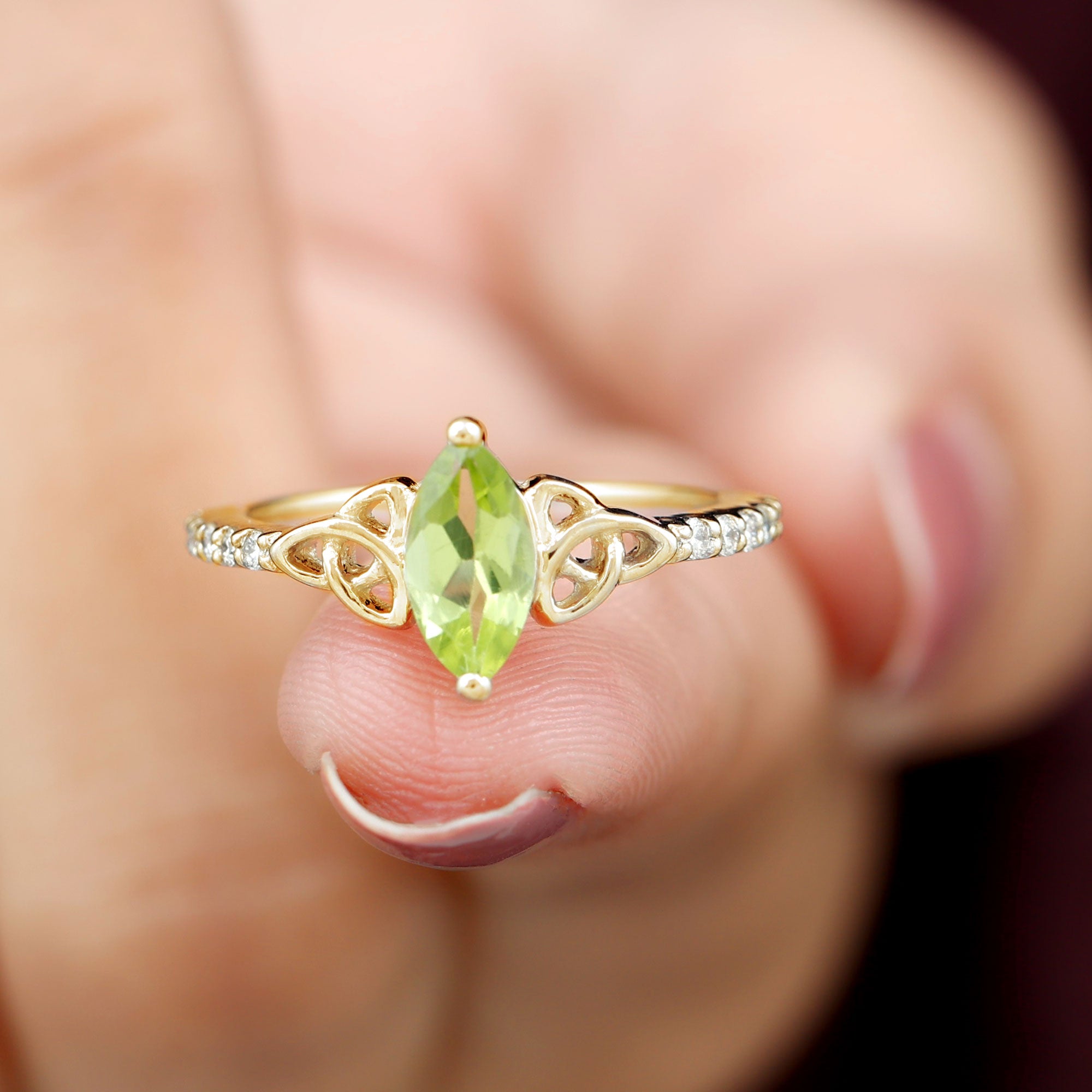 1 CT Marquise Cut Peridot Solitaire Celtic Ring with Diamond Side Stones