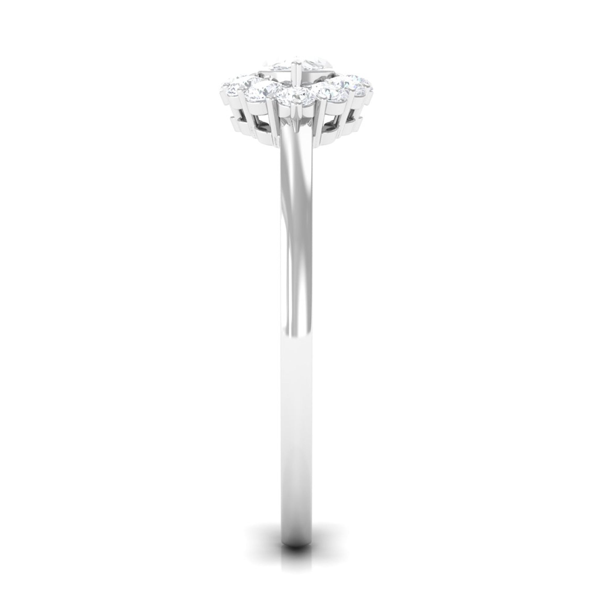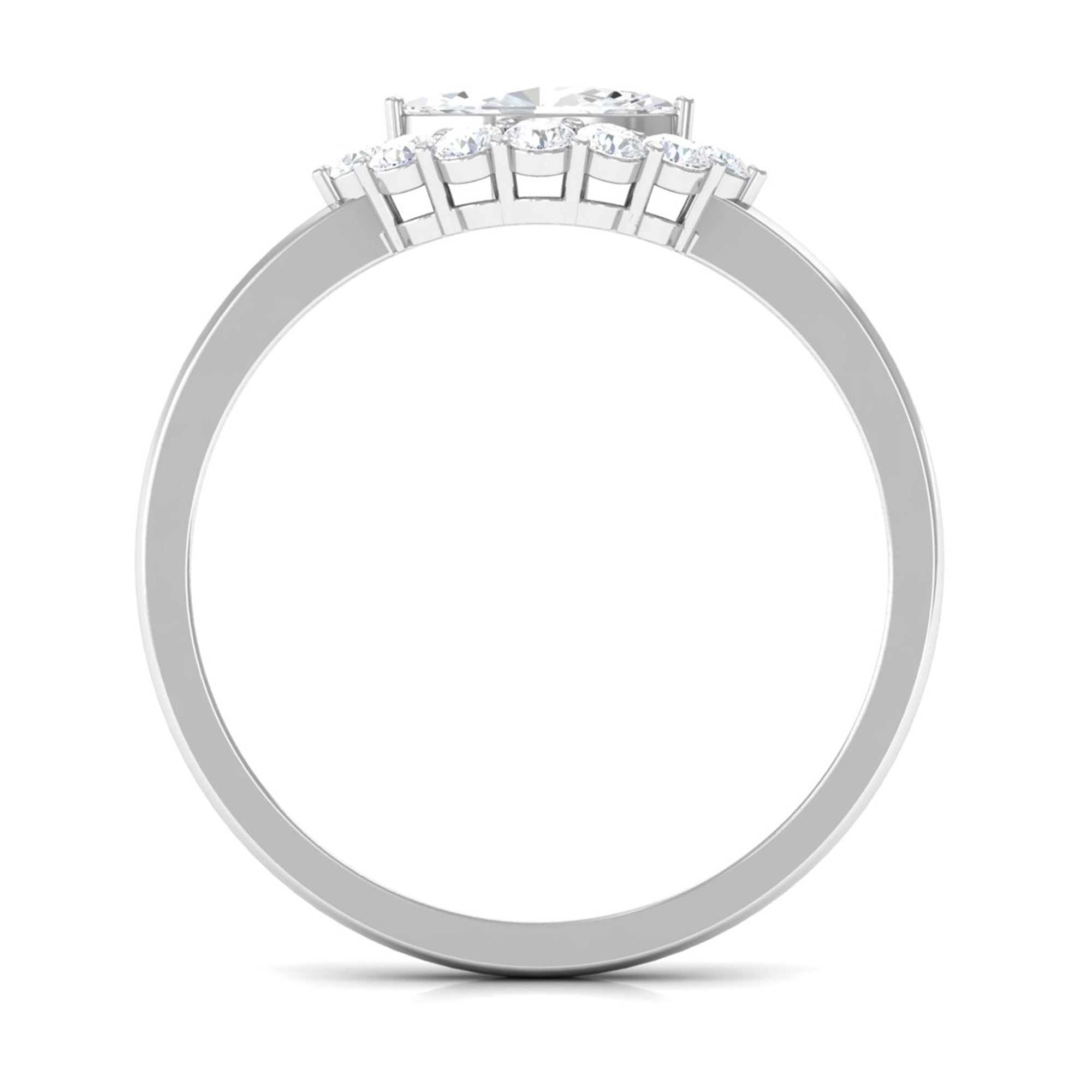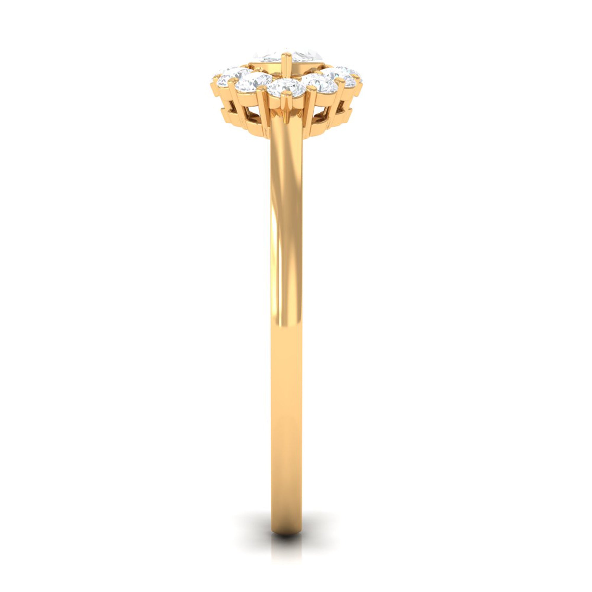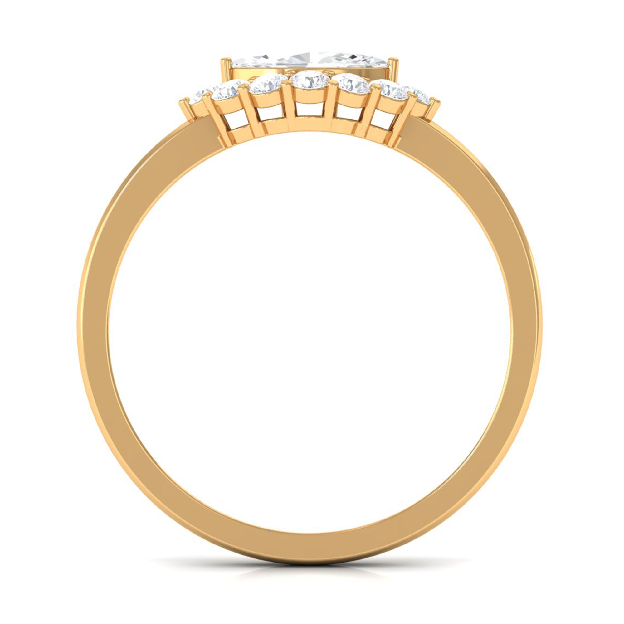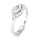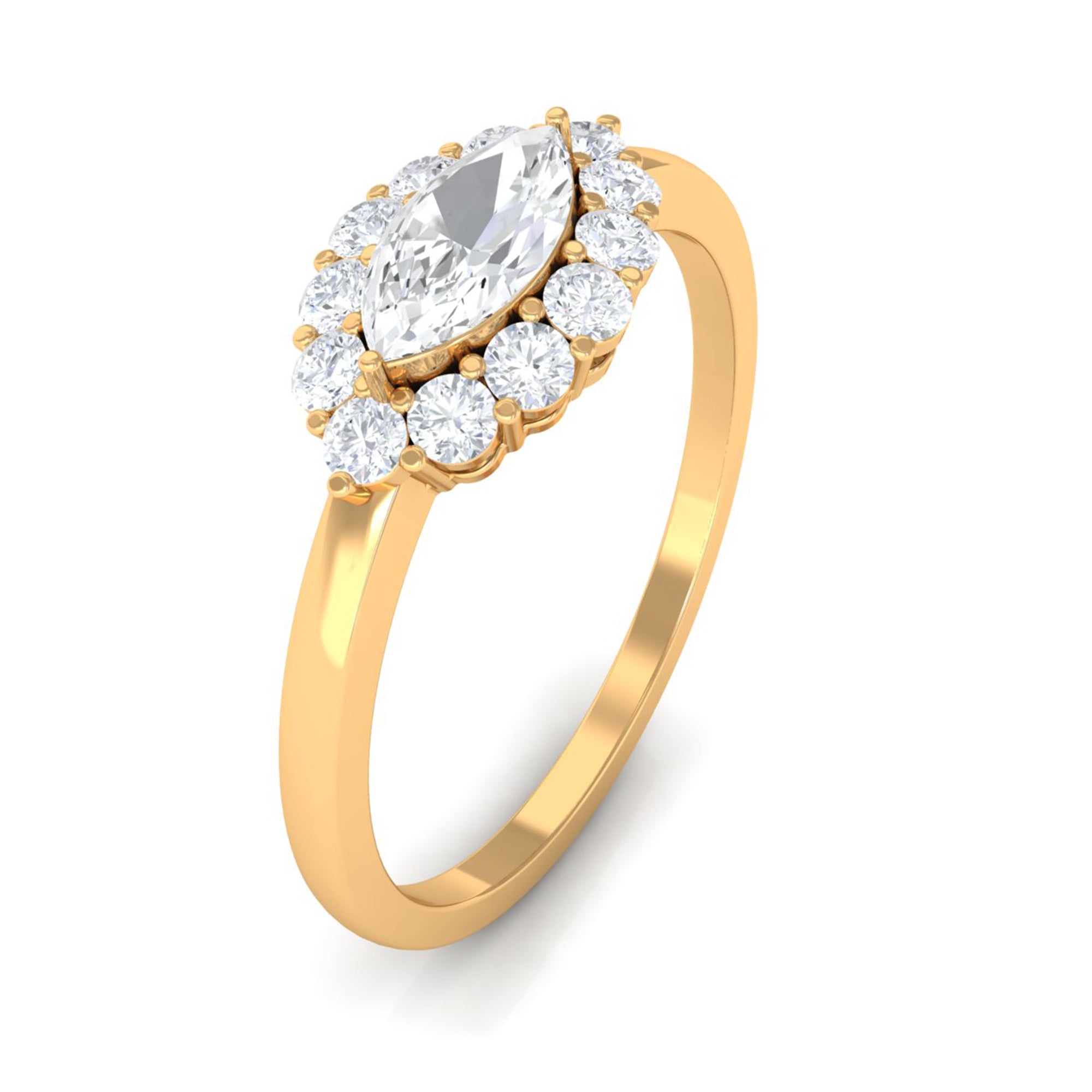 This Engagement Ring is one where the Marquise Cut Cubic Zirconia is oriented horizontally on the band in prong setting along with Round Cut zircon halo. Beautiful East West Simulated Diamond Engagement Ring will make her eyes glitter with your love. Crafted in Gold.