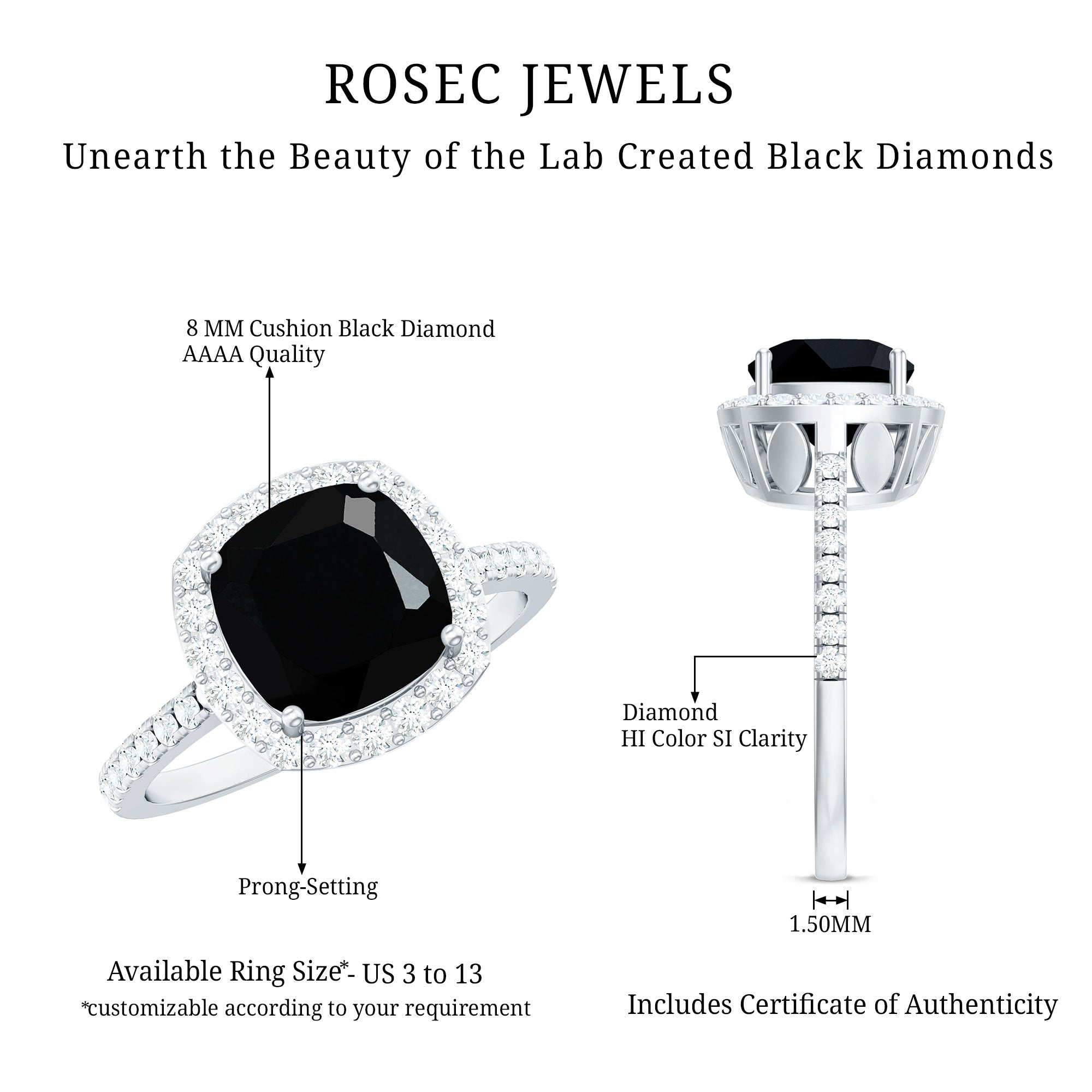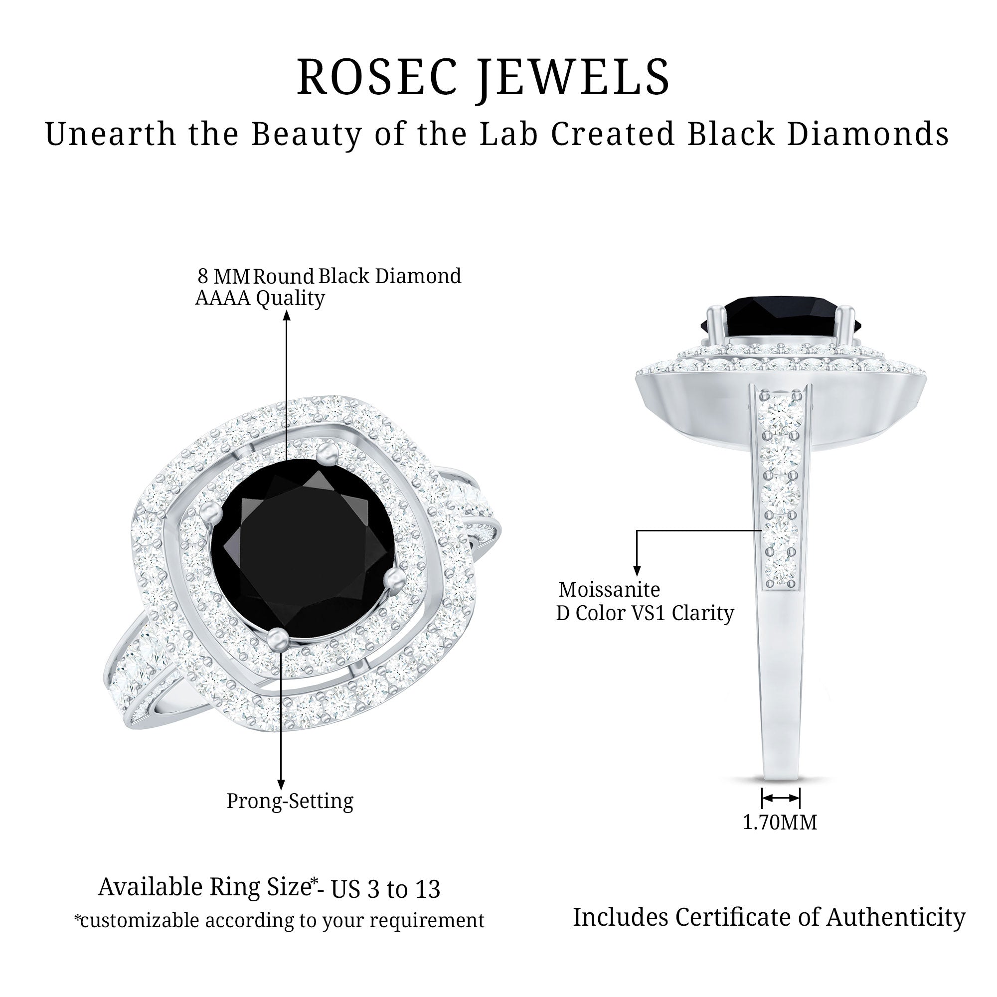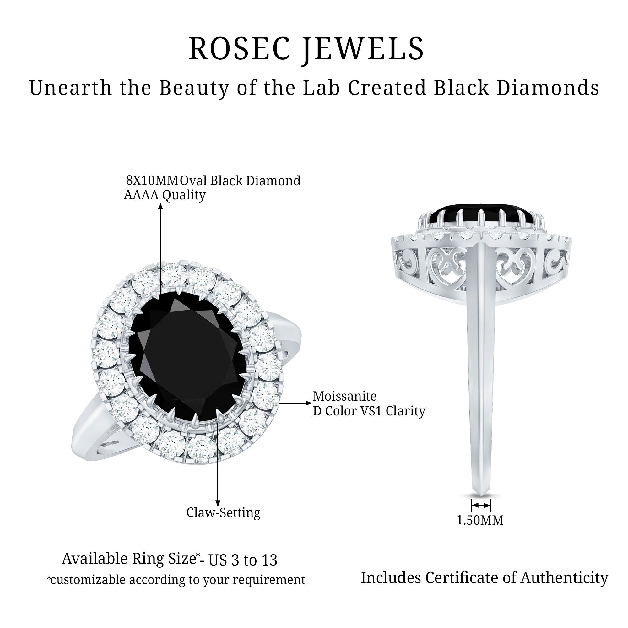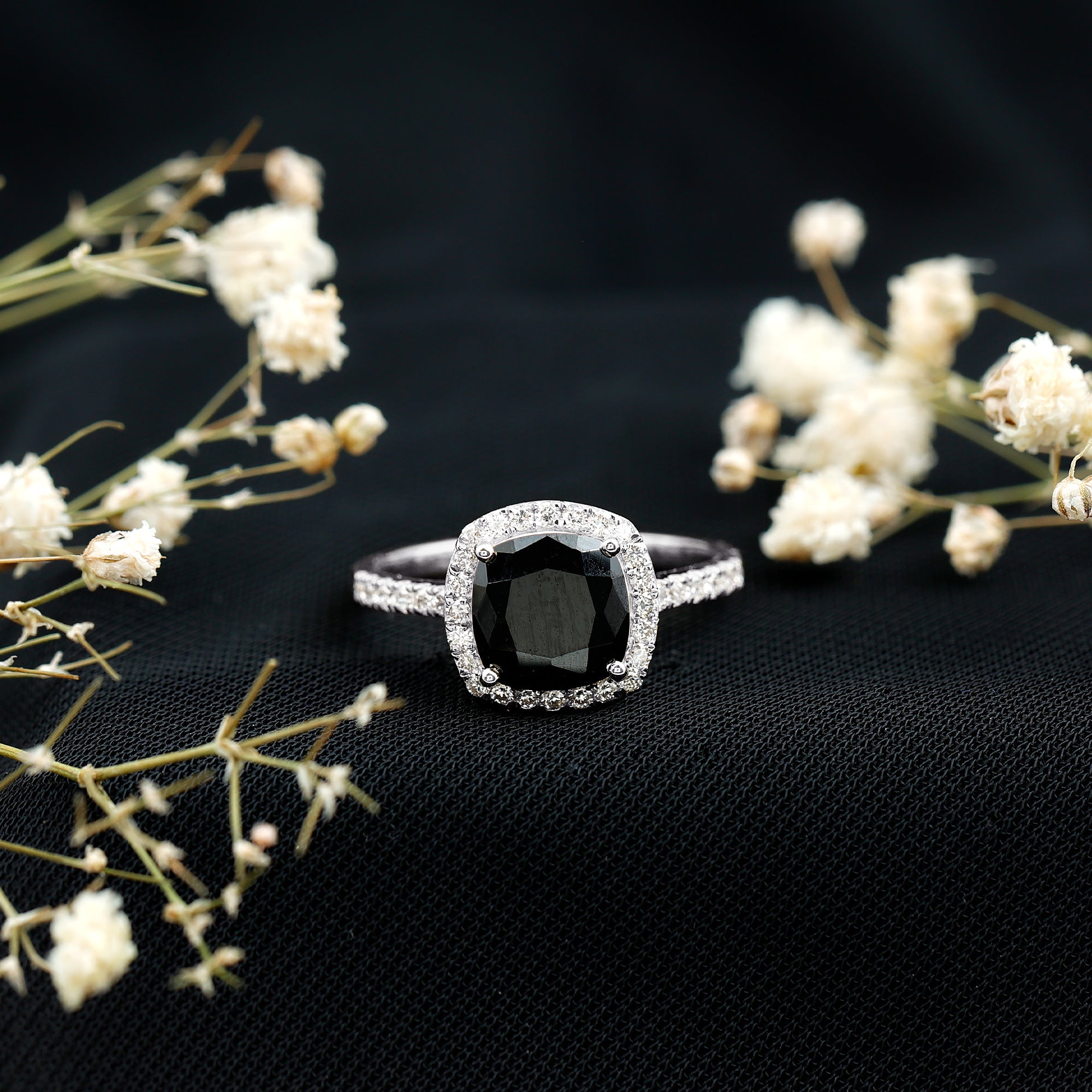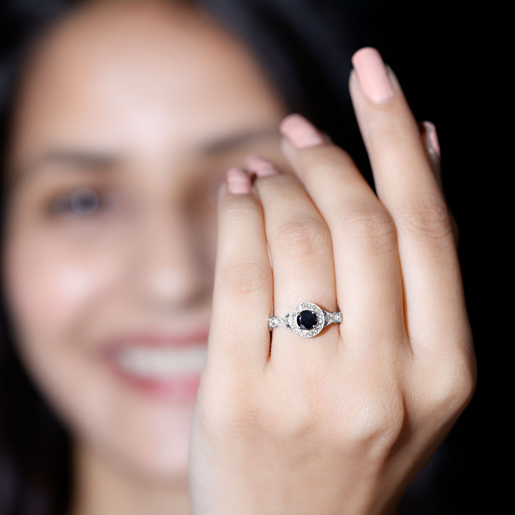 Lab Created Black Diamond Halo Engagement rings: Black diamond making the heart of the ring is surrounded by the accent of other shining gemstones, like moissanite or diamonds. The halo around the gemstone not only adds a sparkle, but offers it protection too.