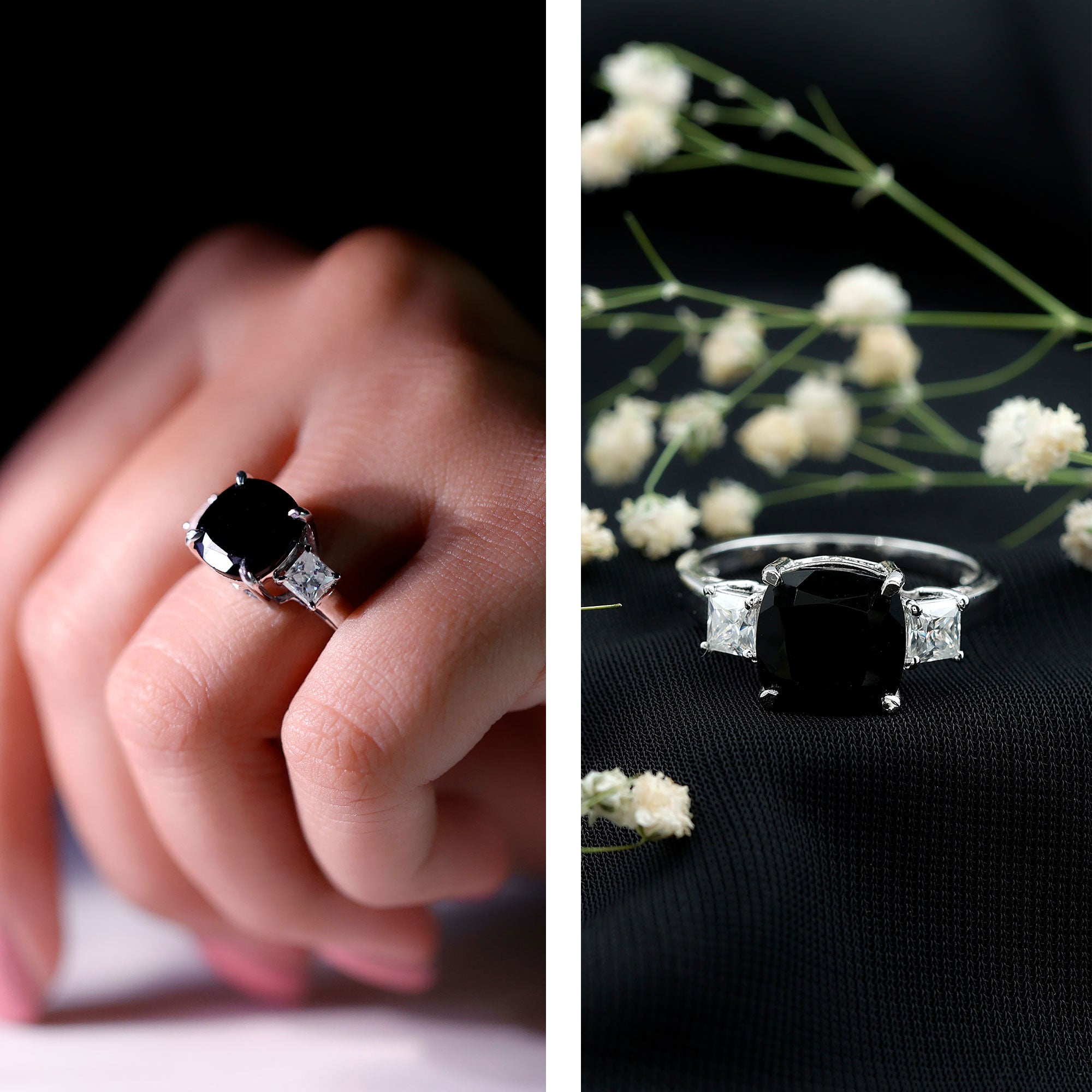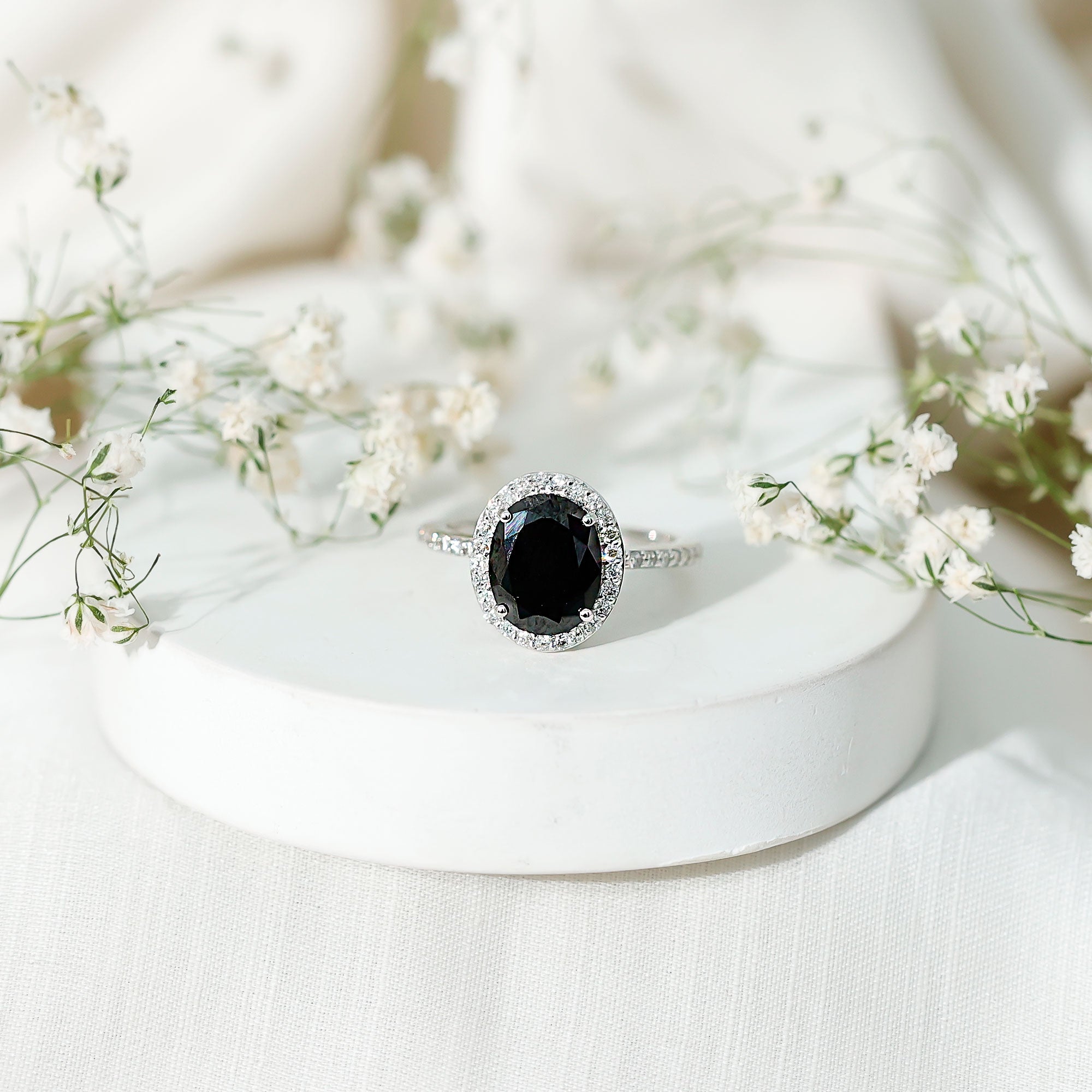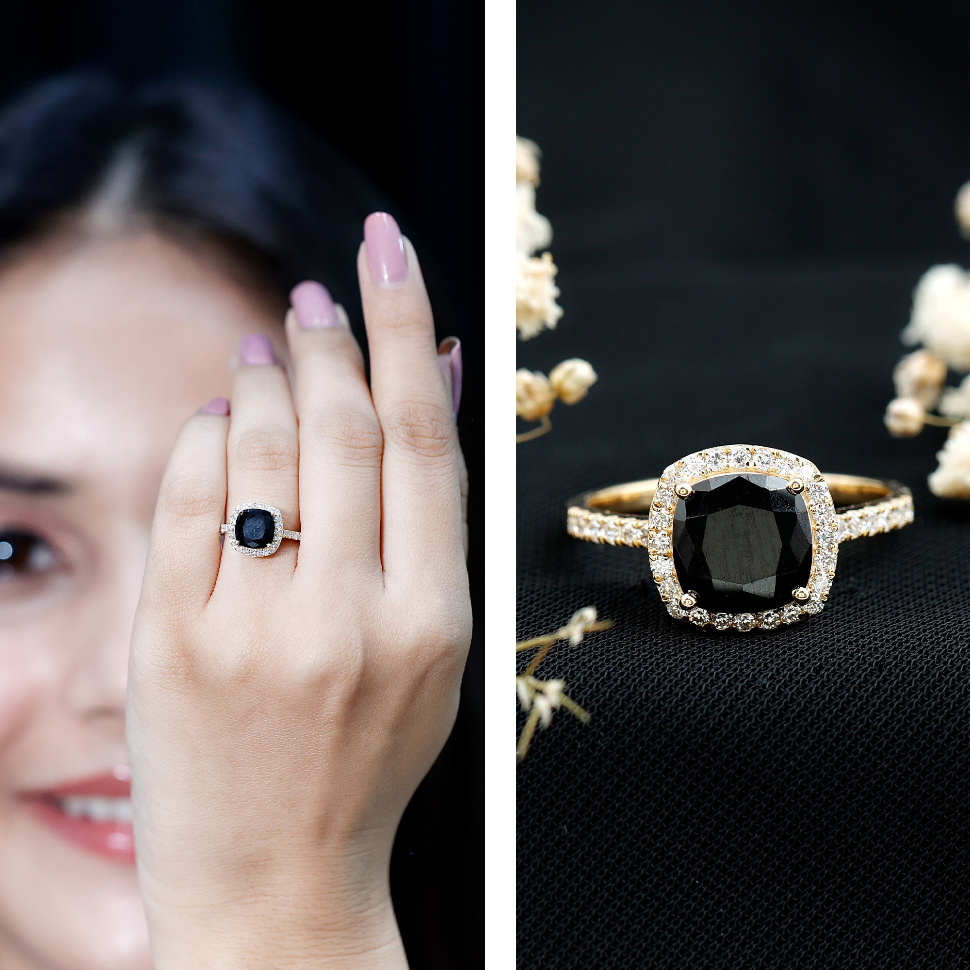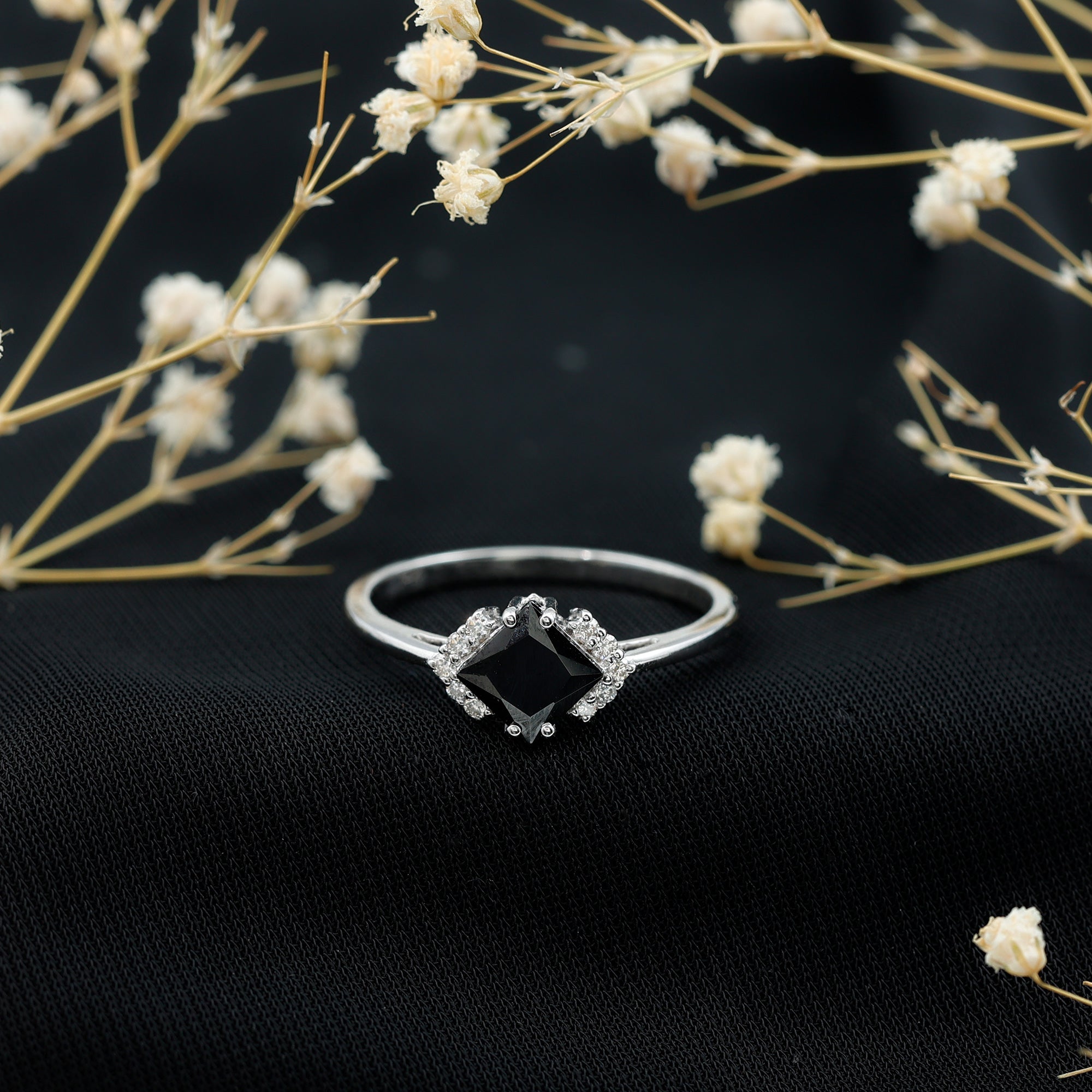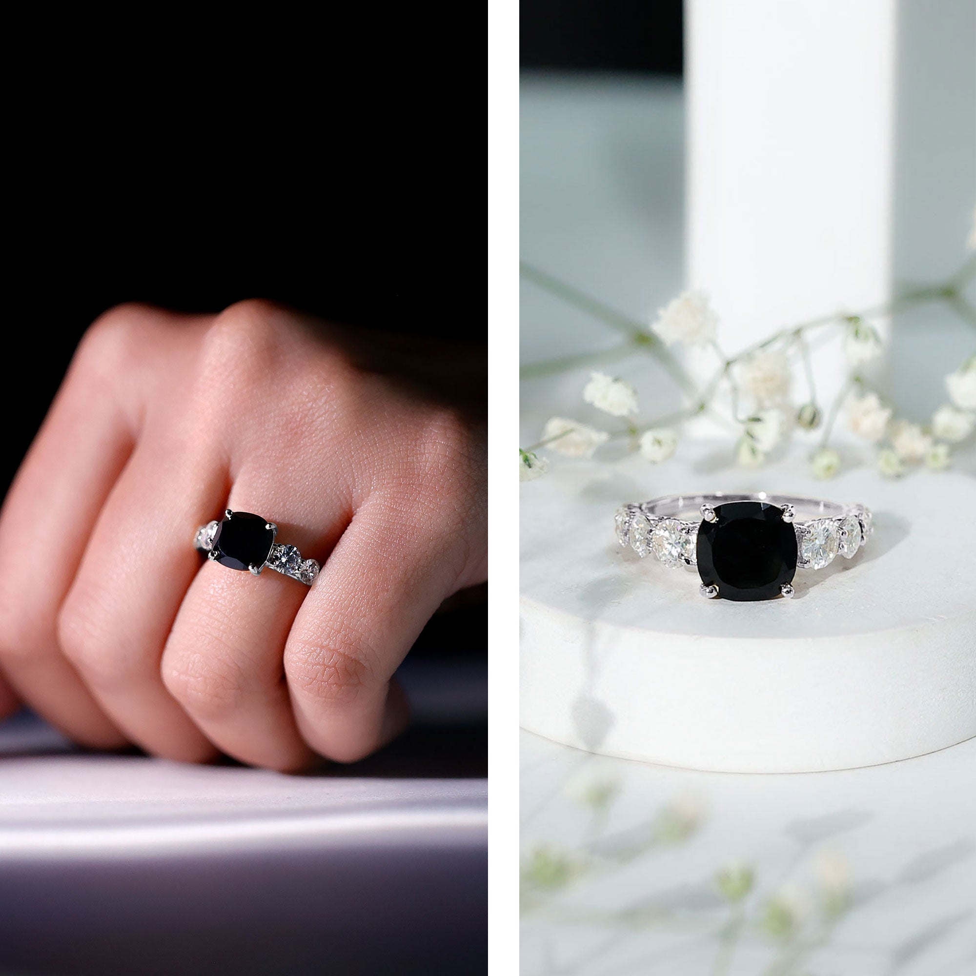 Lab Created Black Diamond Halo Engagement rings: Black diamond making the heart of the ring is surrounded by the accent of other shining gemstones, like moissanite or diamonds. The halo around the gemstone not only adds a sparkle, but offers it protection too.