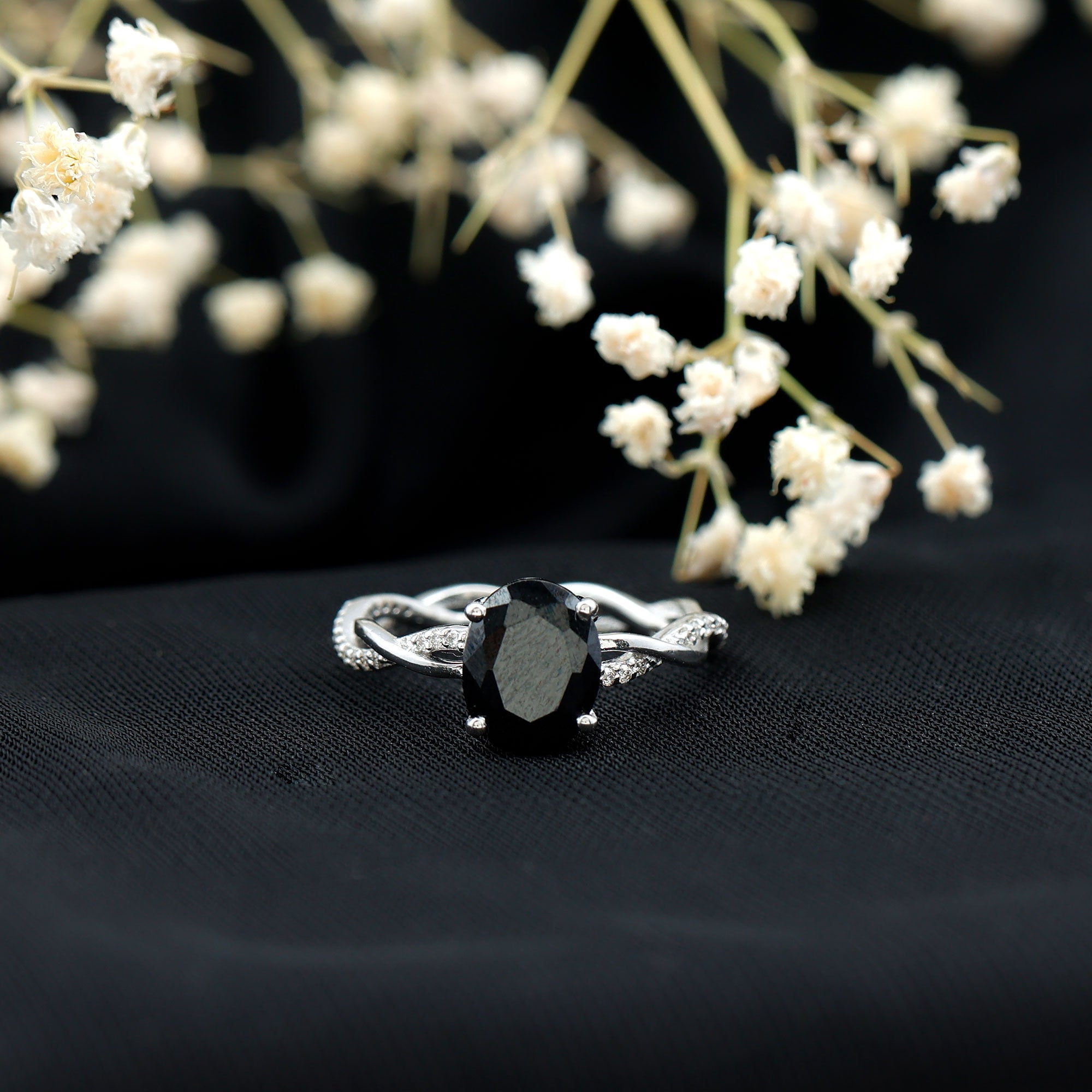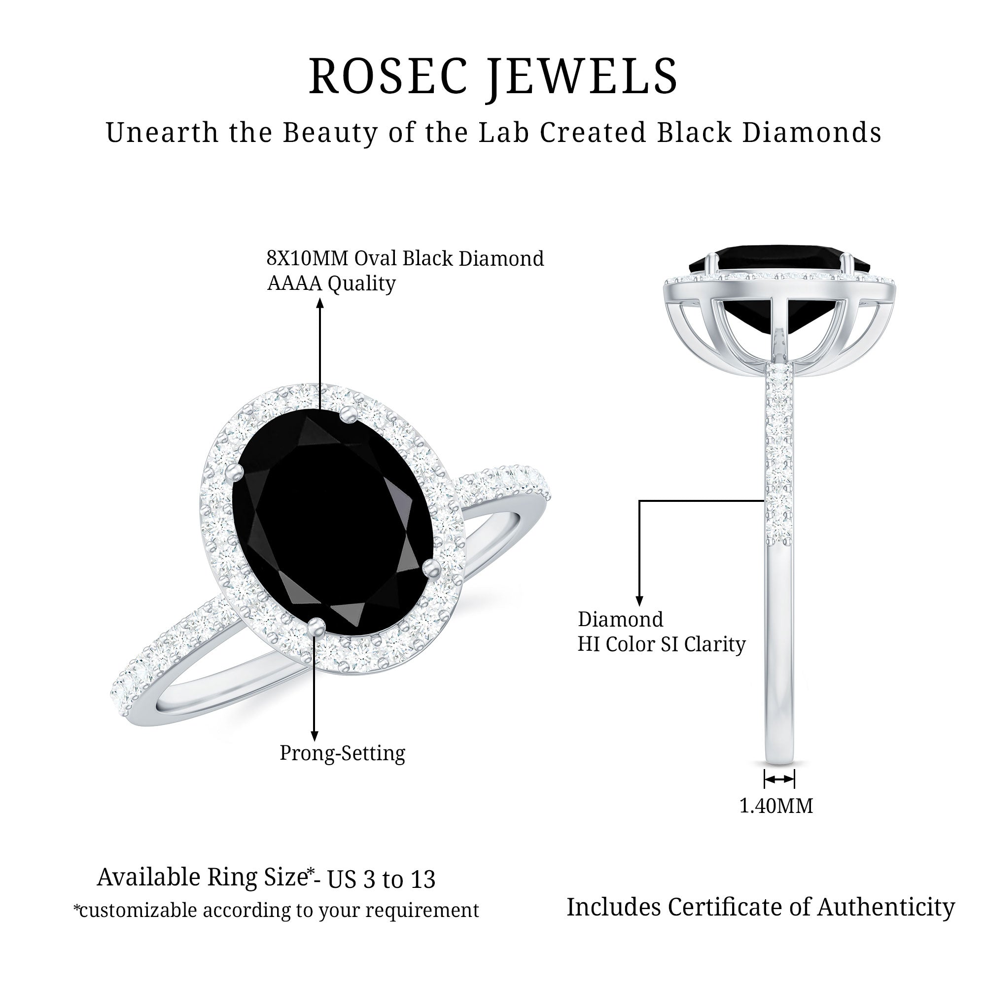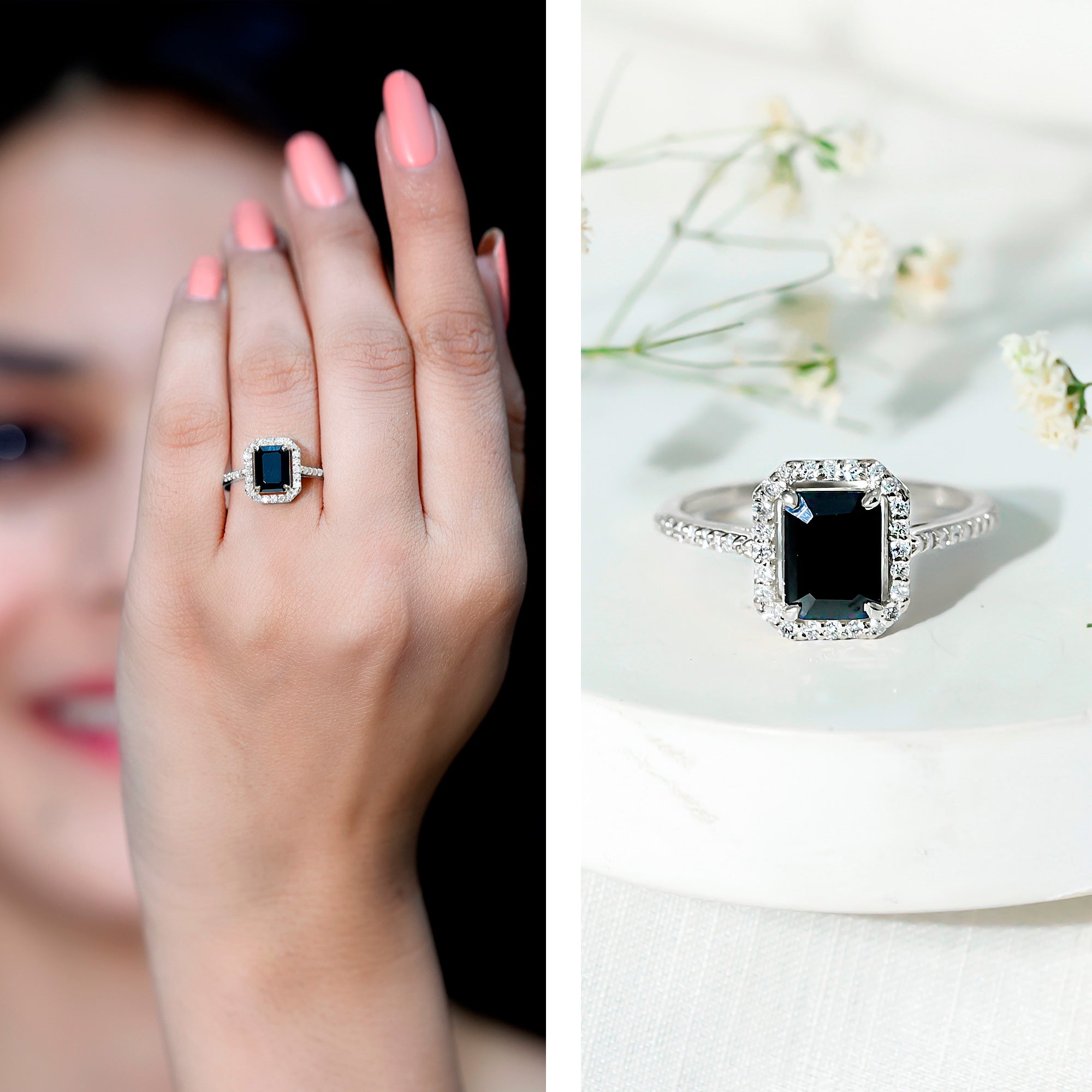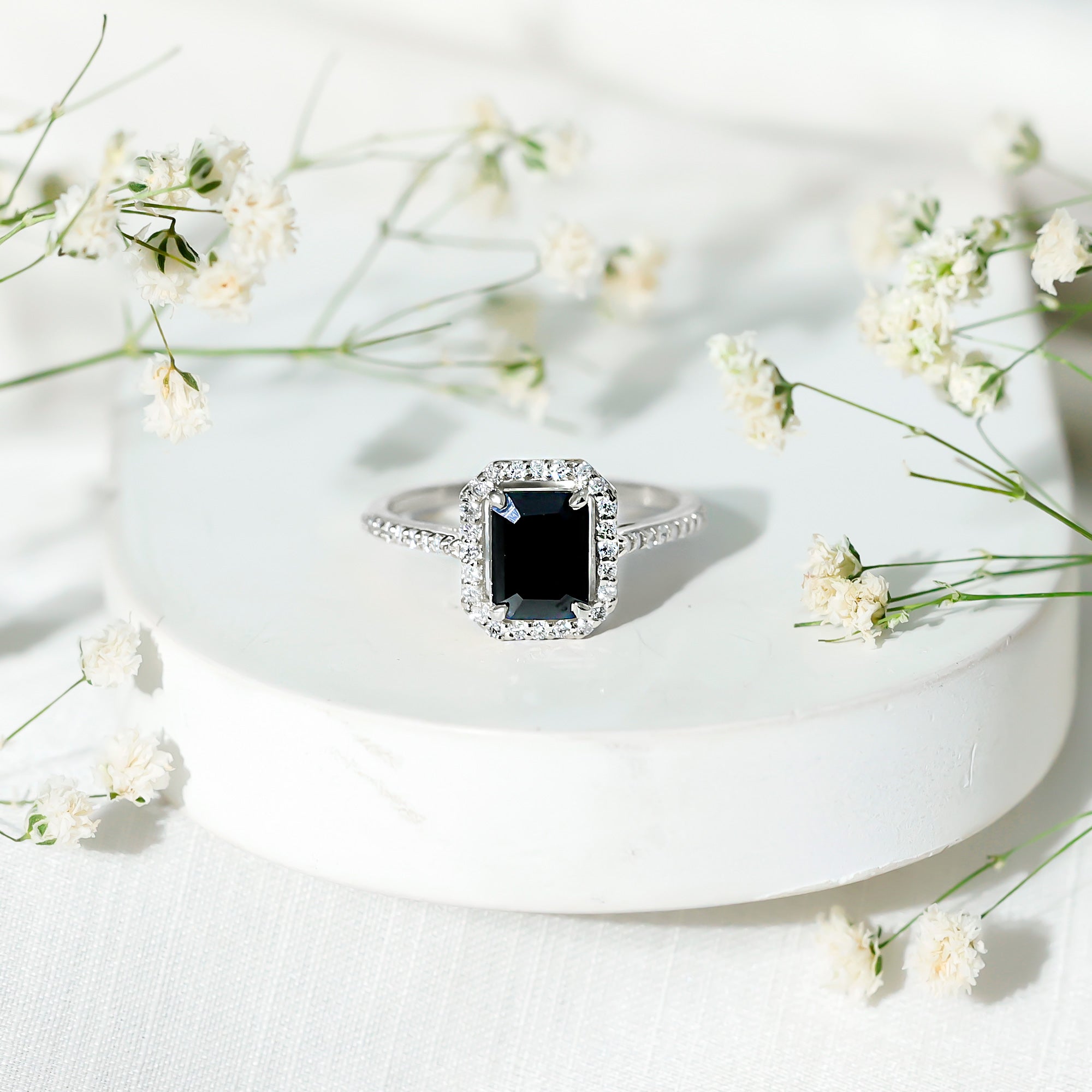 Lab Created Black Diamond Halo Engagement rings: Black diamond making the heart of the ring is surrounded by the accent of other shining gemstones, like moissanite or diamonds. The halo around the gemstone not only adds a sparkle, but offers it protection too.