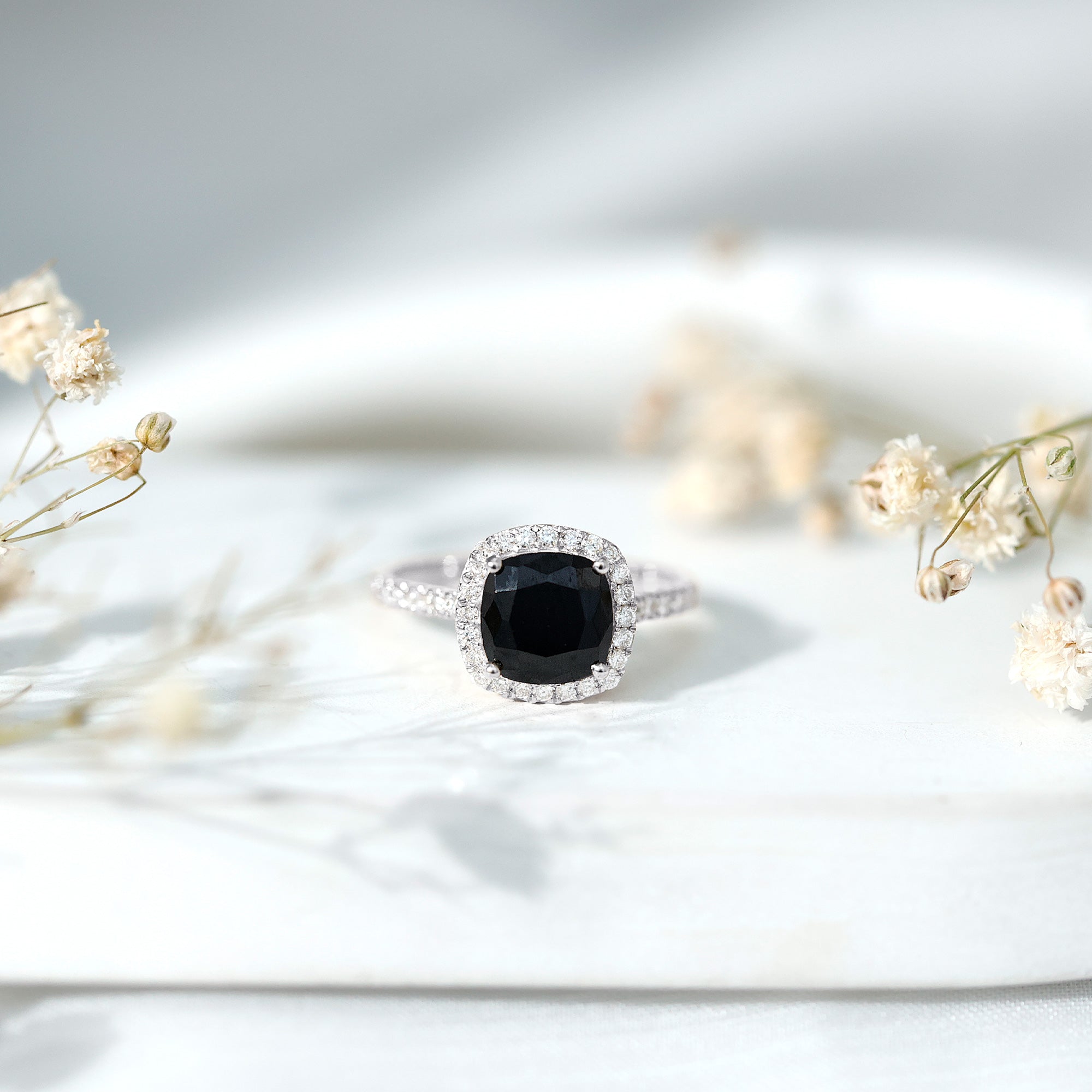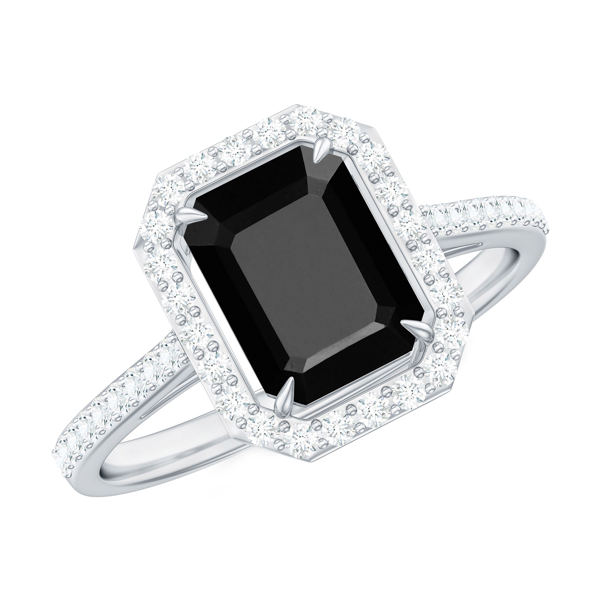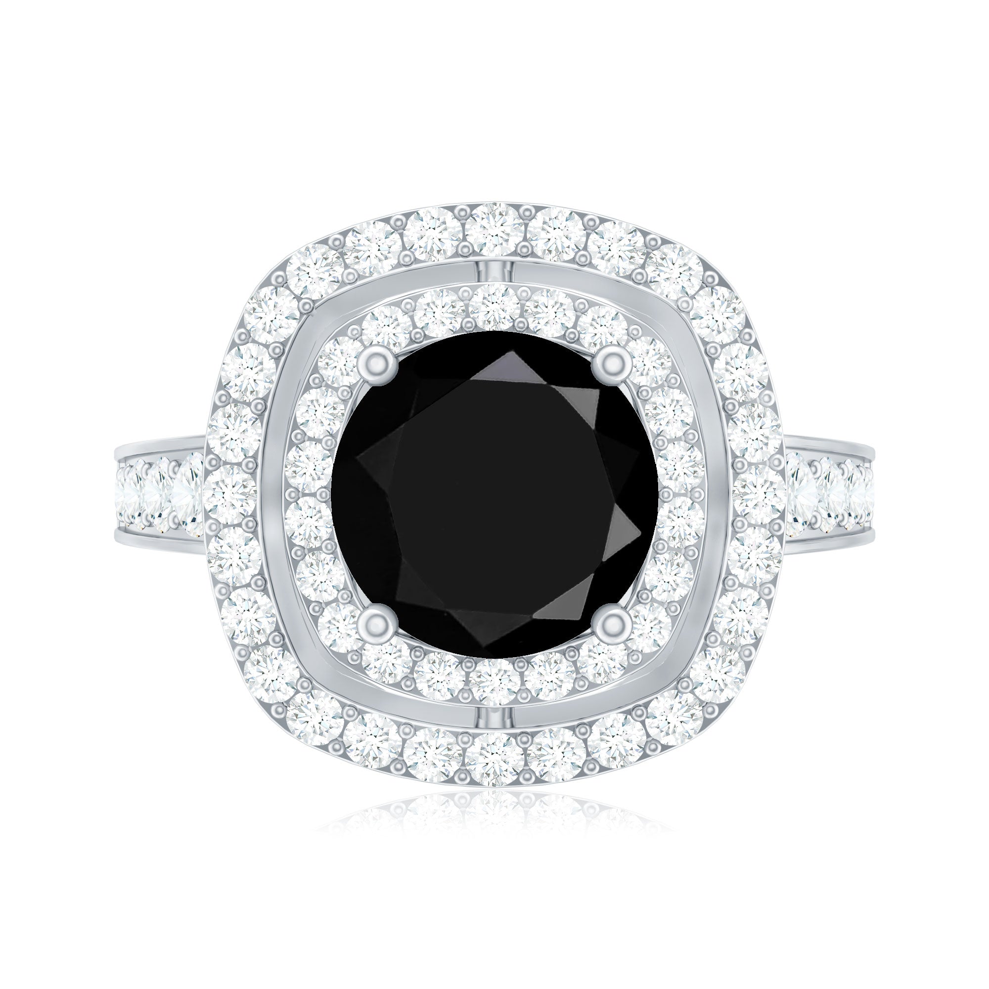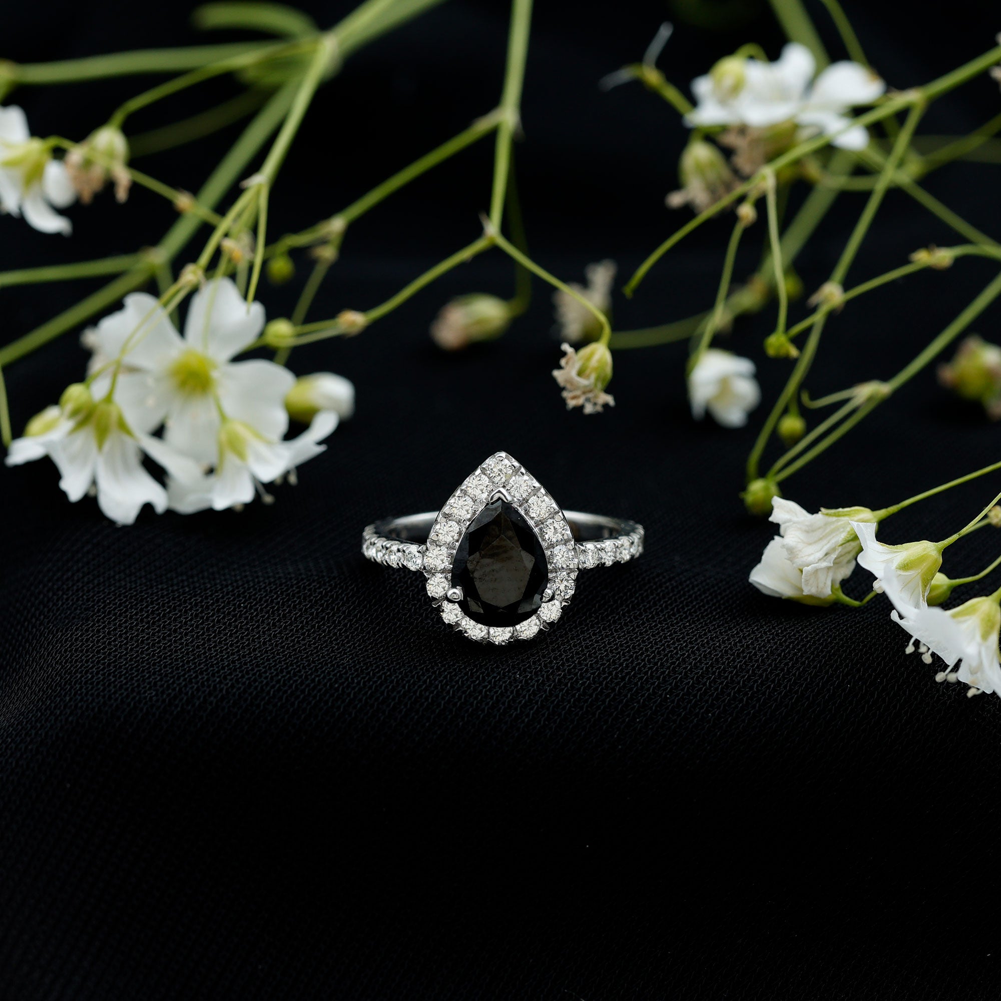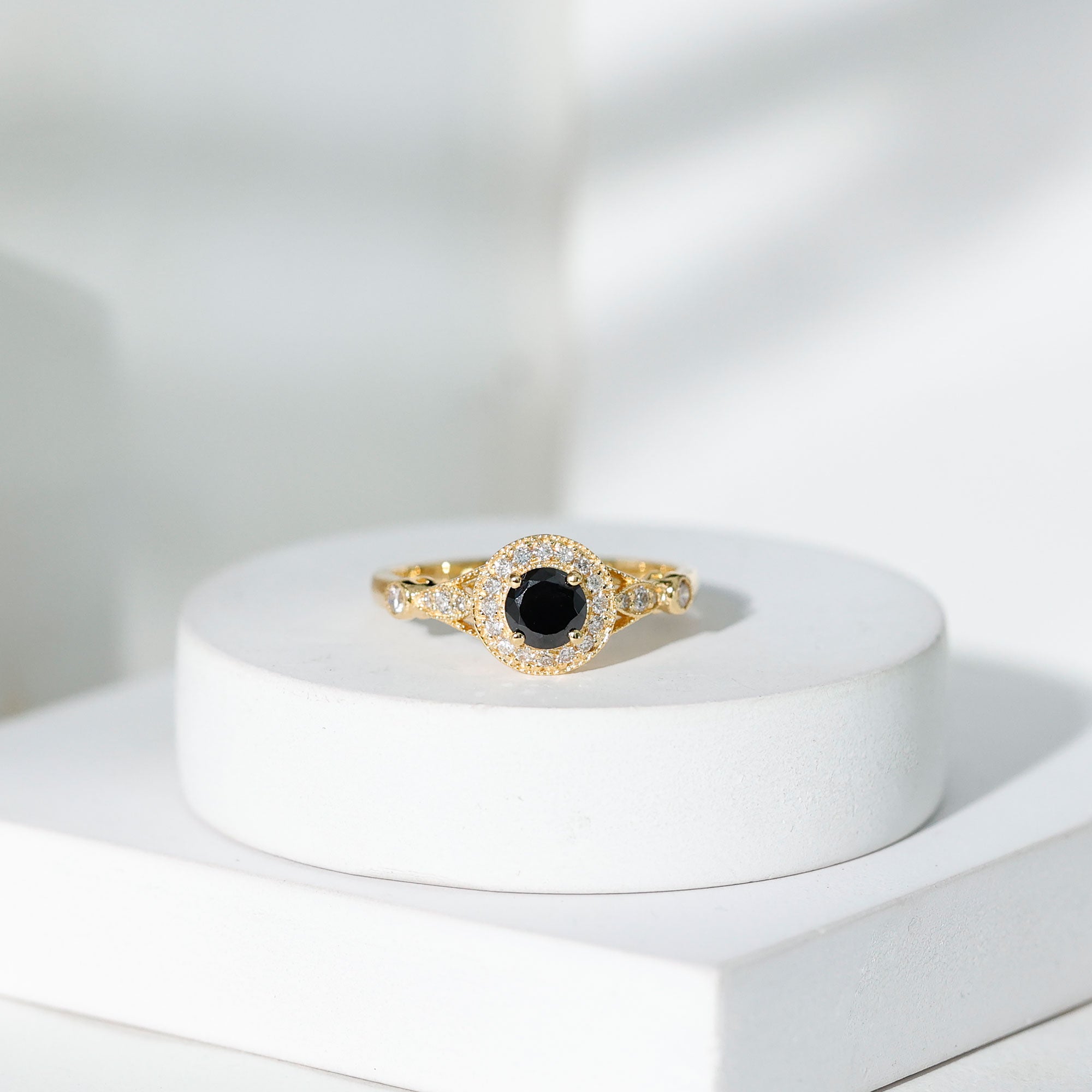 Lab Created Black Diamond Halo Engagement rings: Black diamond making the heart of the ring is surrounded by the accent of other shining gemstones, like moissanite or diamonds. The halo around the gemstone not only adds a sparkle, but offers it protection too.