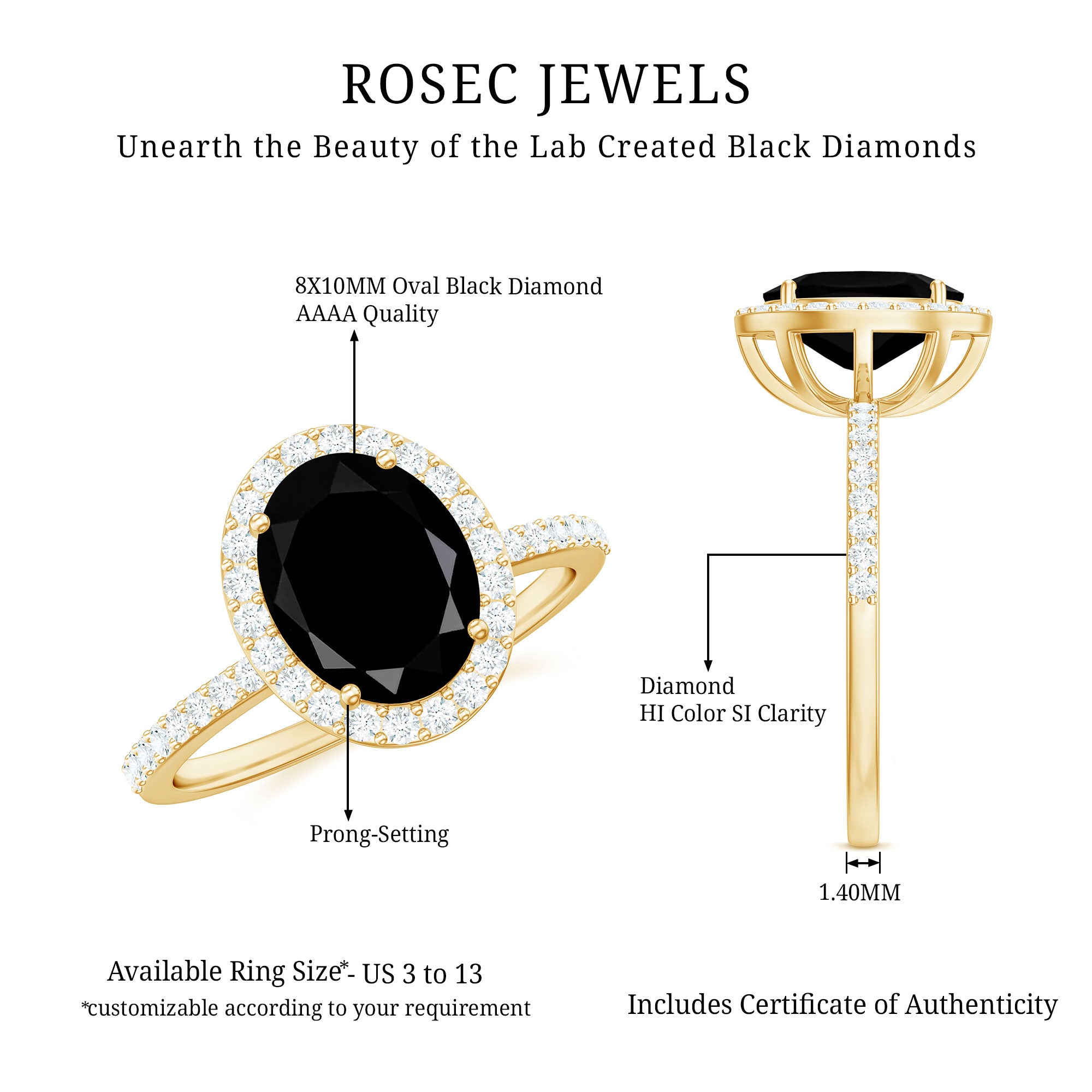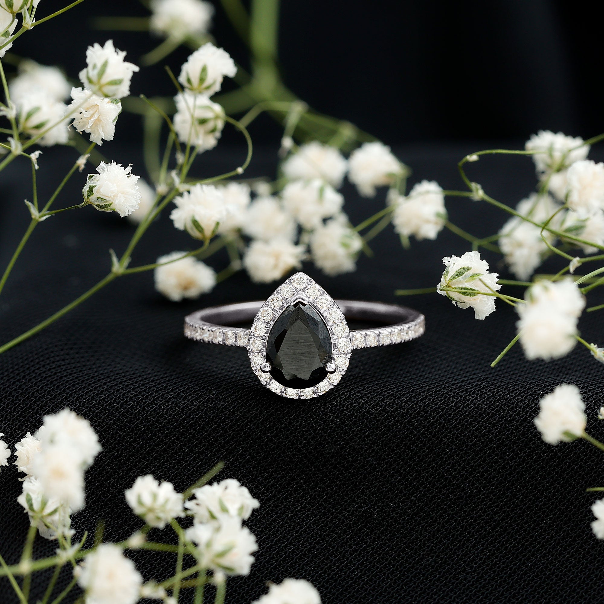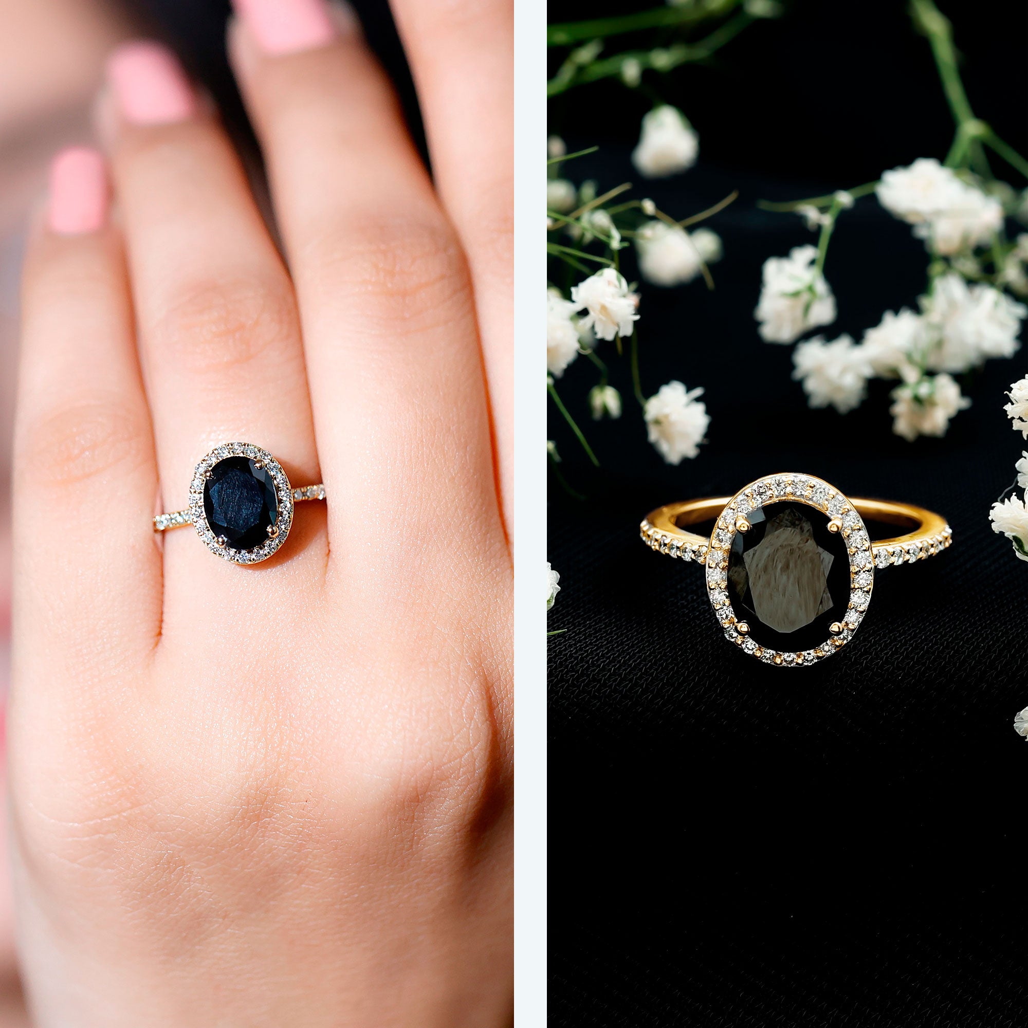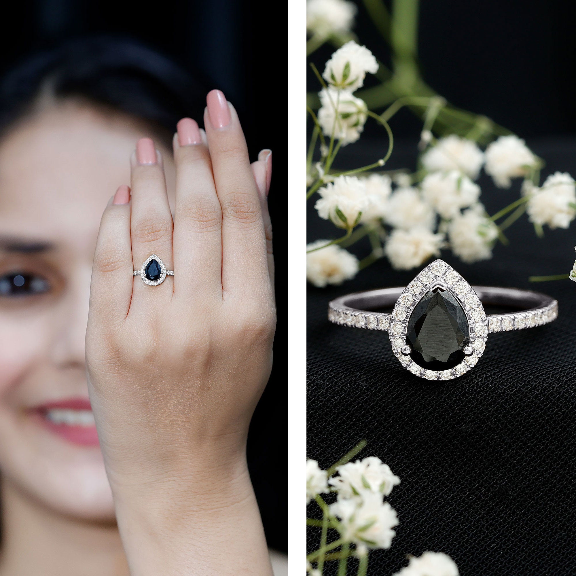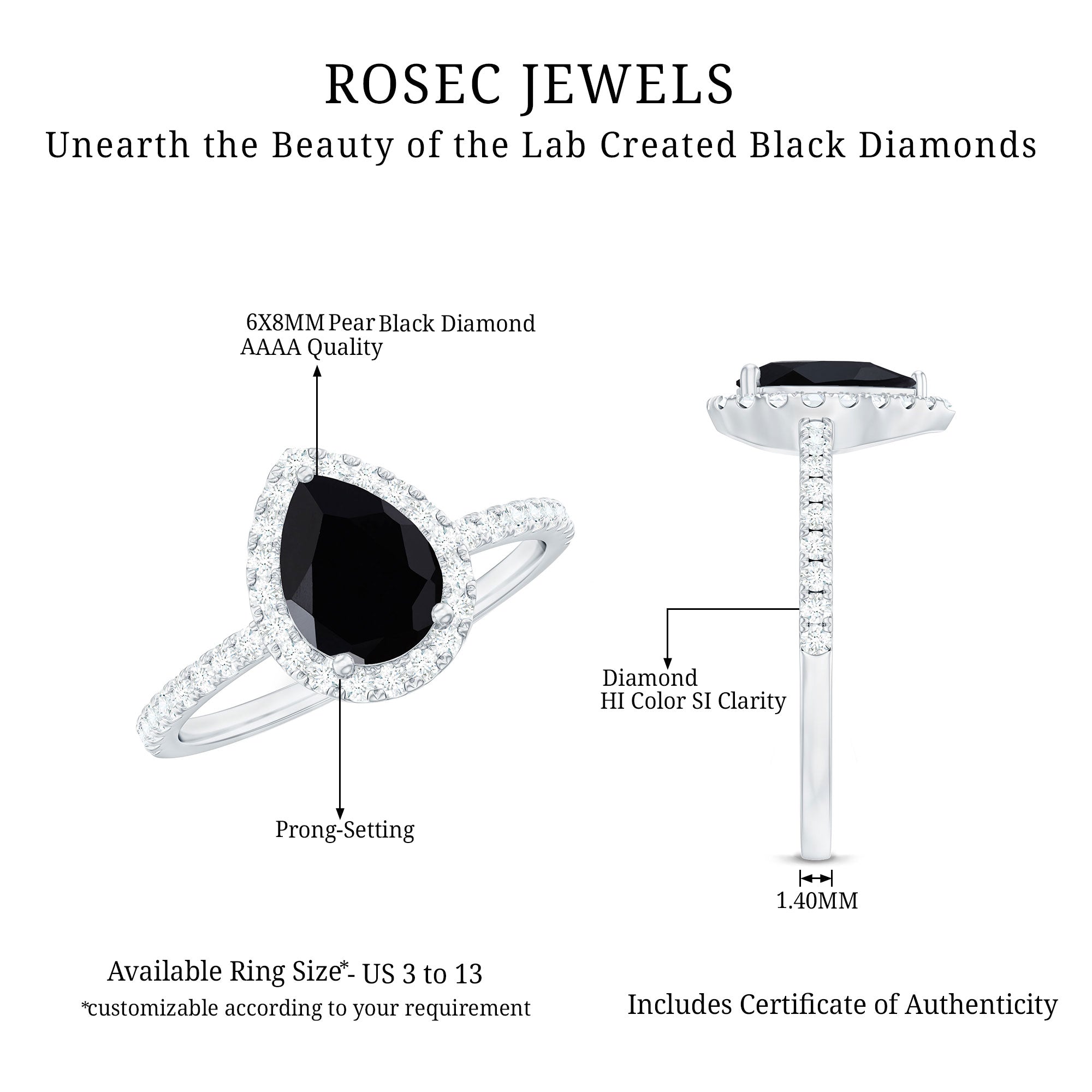 Lab Created Black Diamond Halo Engagement rings: Black diamond making the heart of the ring is surrounded by the accent of other shining gemstones, like moissanite or diamonds. The halo around the gemstone not only adds a sparkle, but offers it protection too.