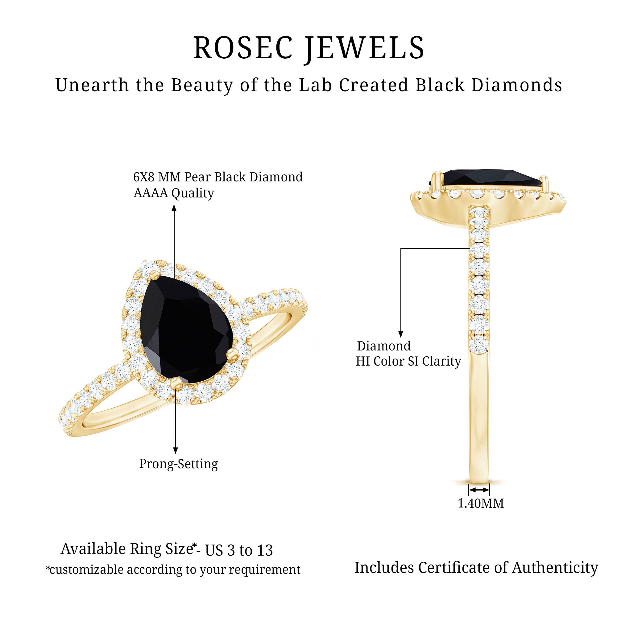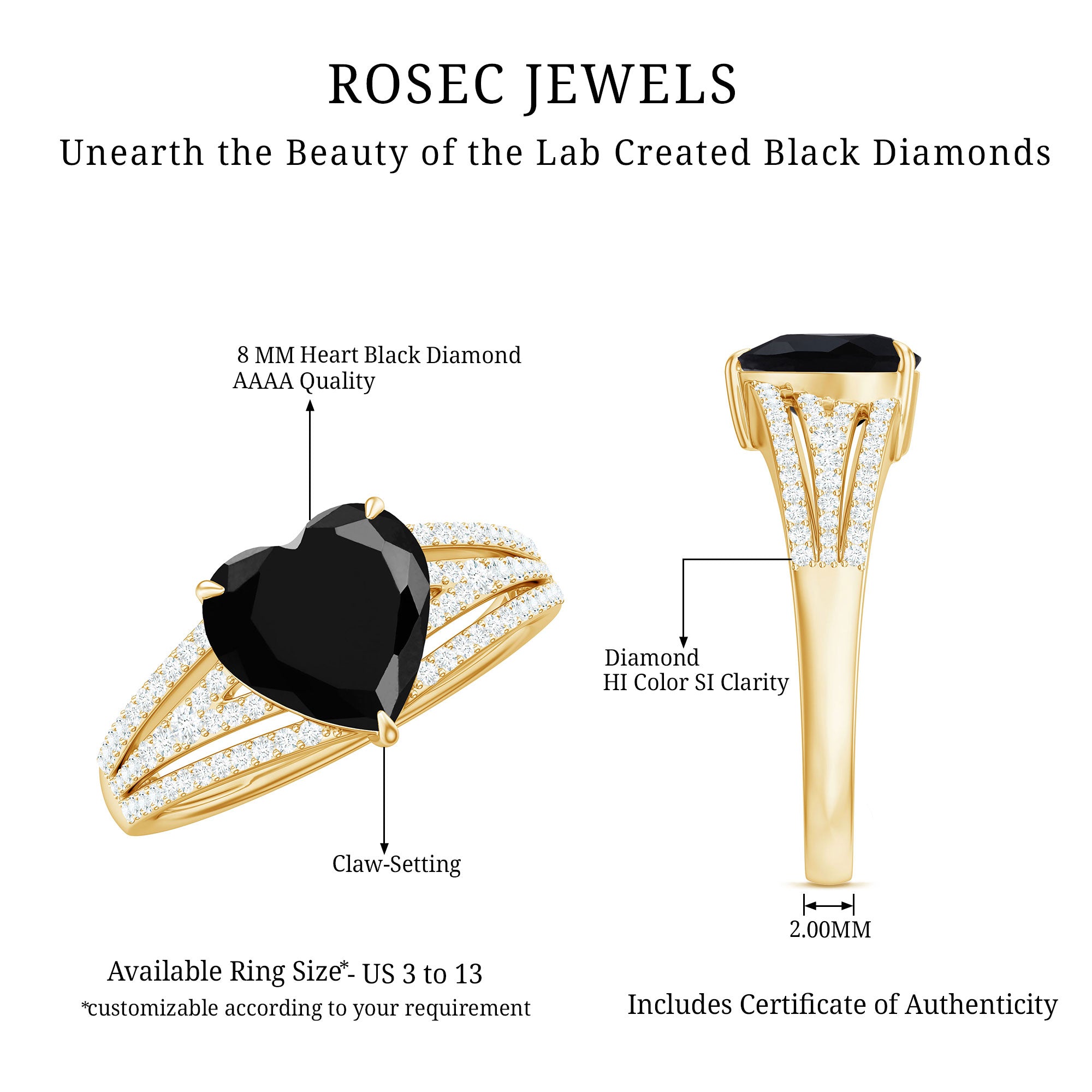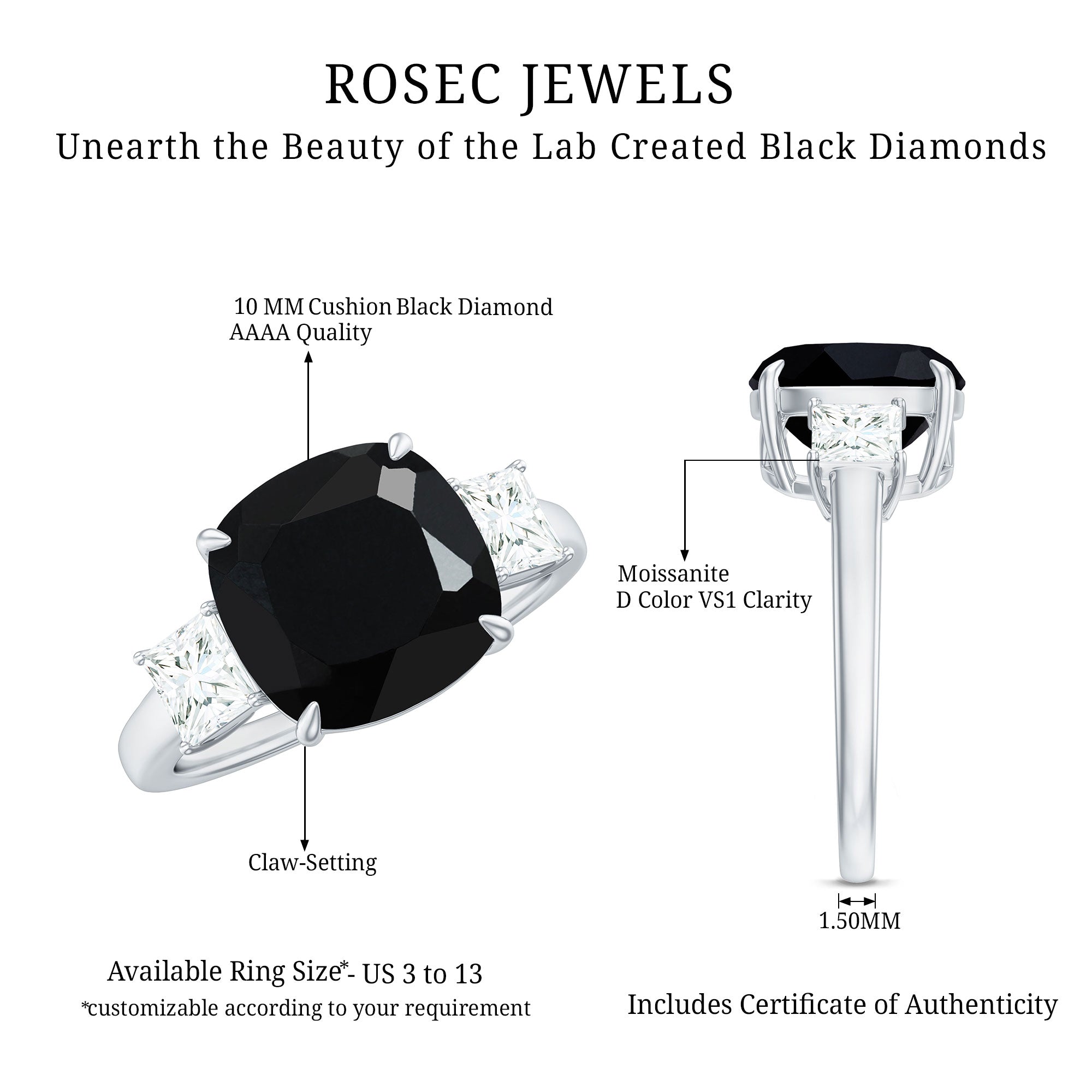 Lab grown black diamonds compared to natural counterparts are easily available, hence designers get a chance to try more complex designs. Bigger diamonds with intricate patterns or unique rings with preferred sizes and settings are easier to create. Black diamonds score 10 on the Mohs scale of hardness, making them durable gemstones, perfect for everyday wear.