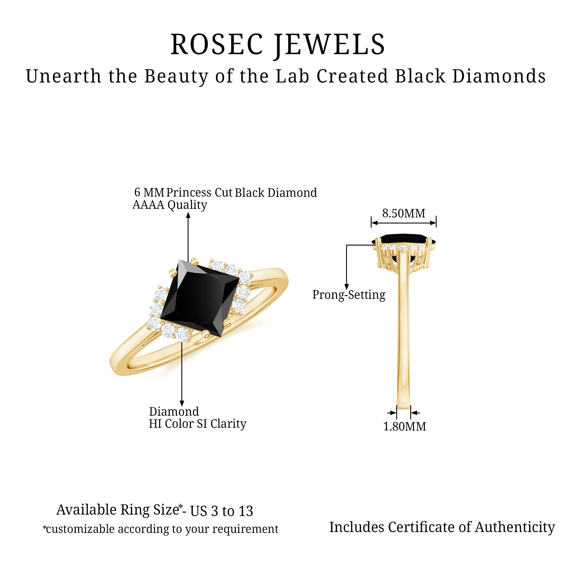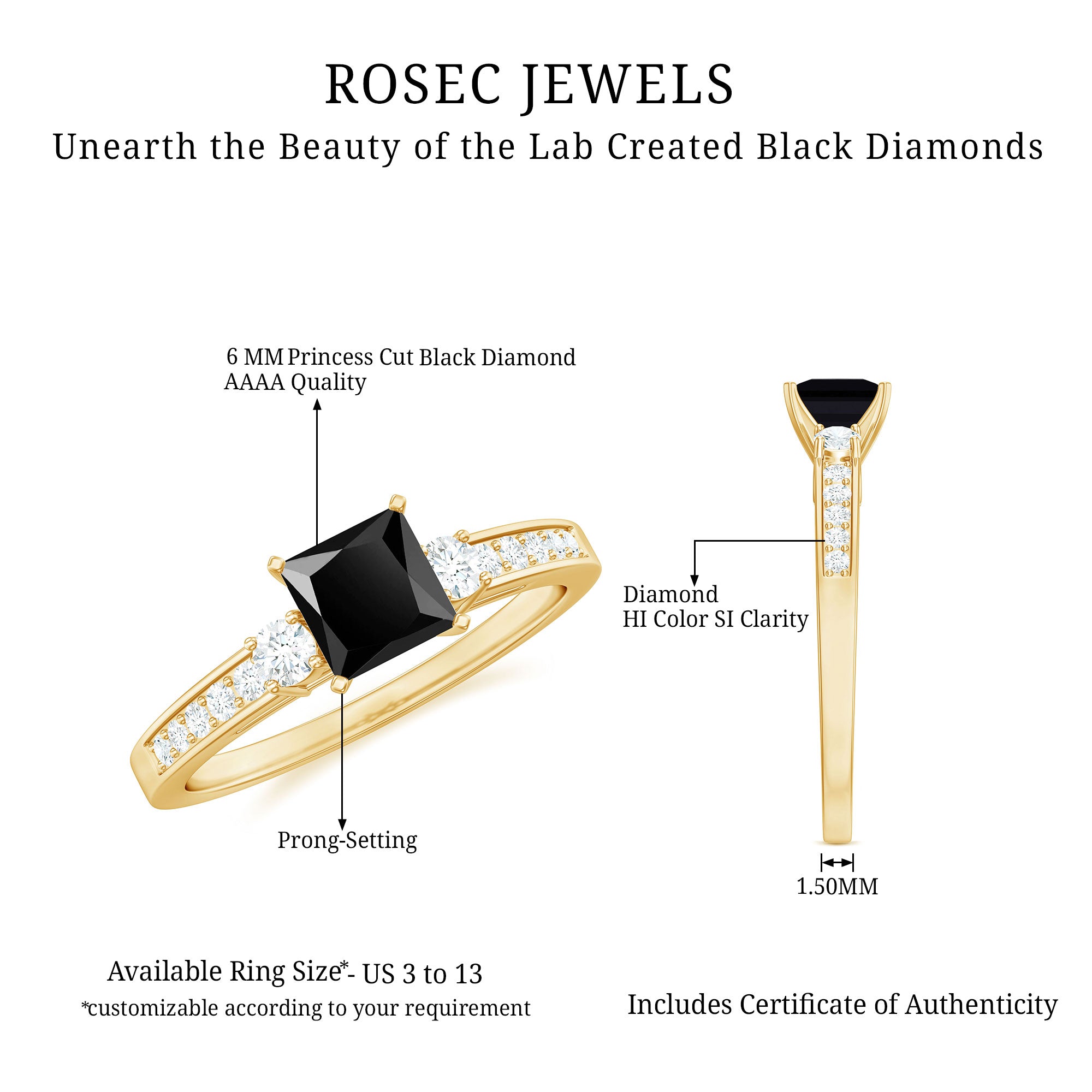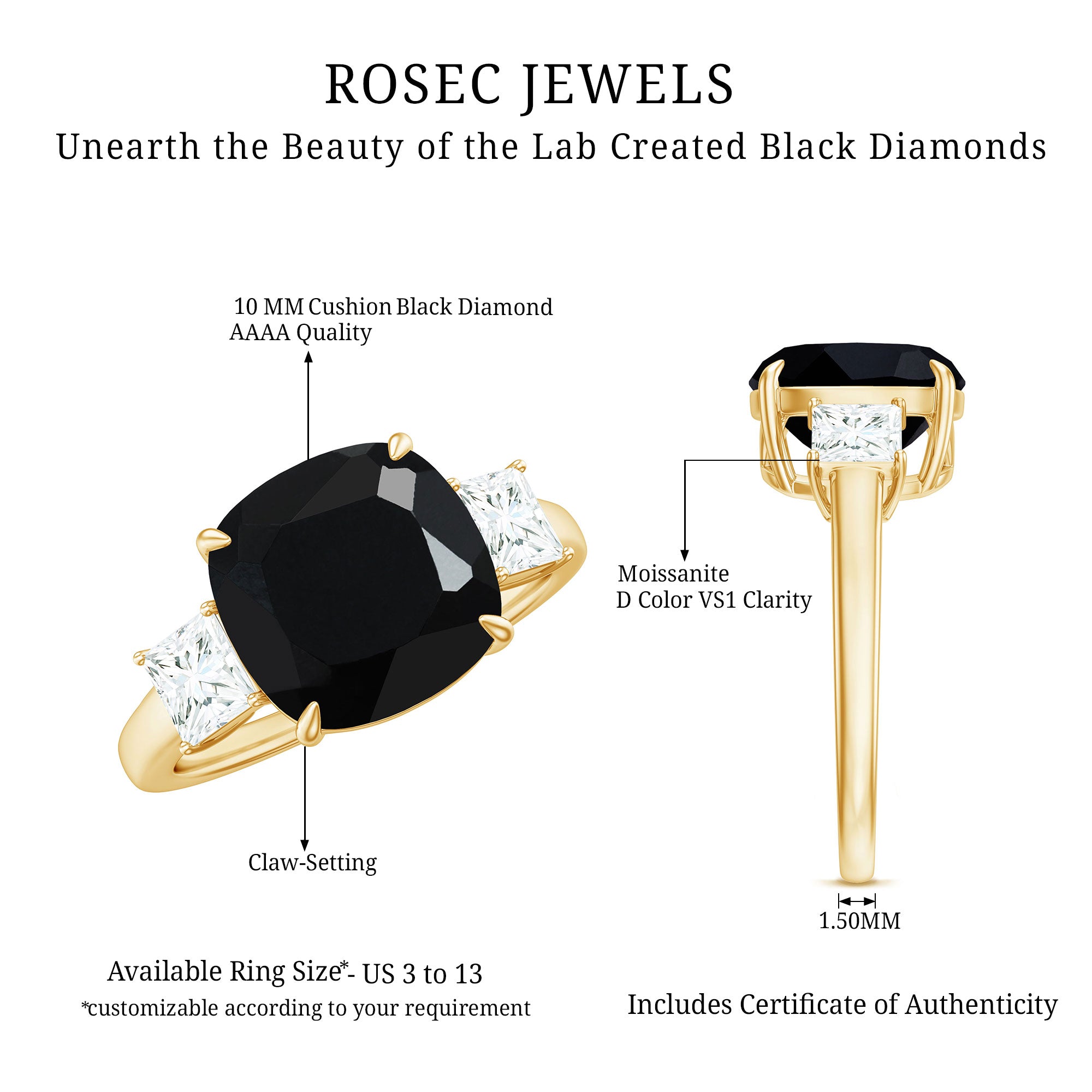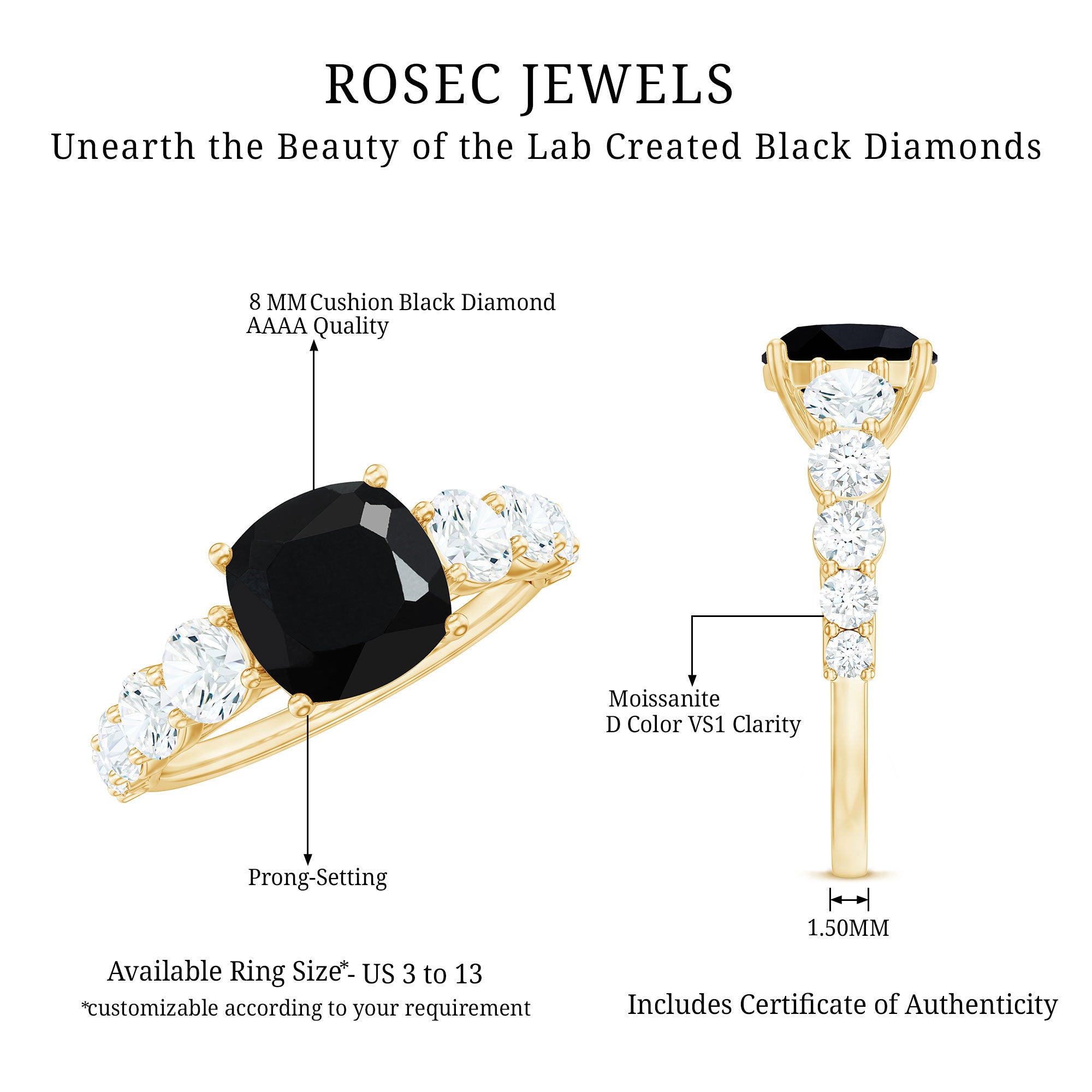 Black diamonds symbolize strength, resilience, and power. Your lab black diamond engagement ring reflects your unbreakable connection with your partner. This strong bond comes with the resilience to face life challenges together. Like the gemstone, your love is bold, rare, and enduring, ready to withstand every pressure.