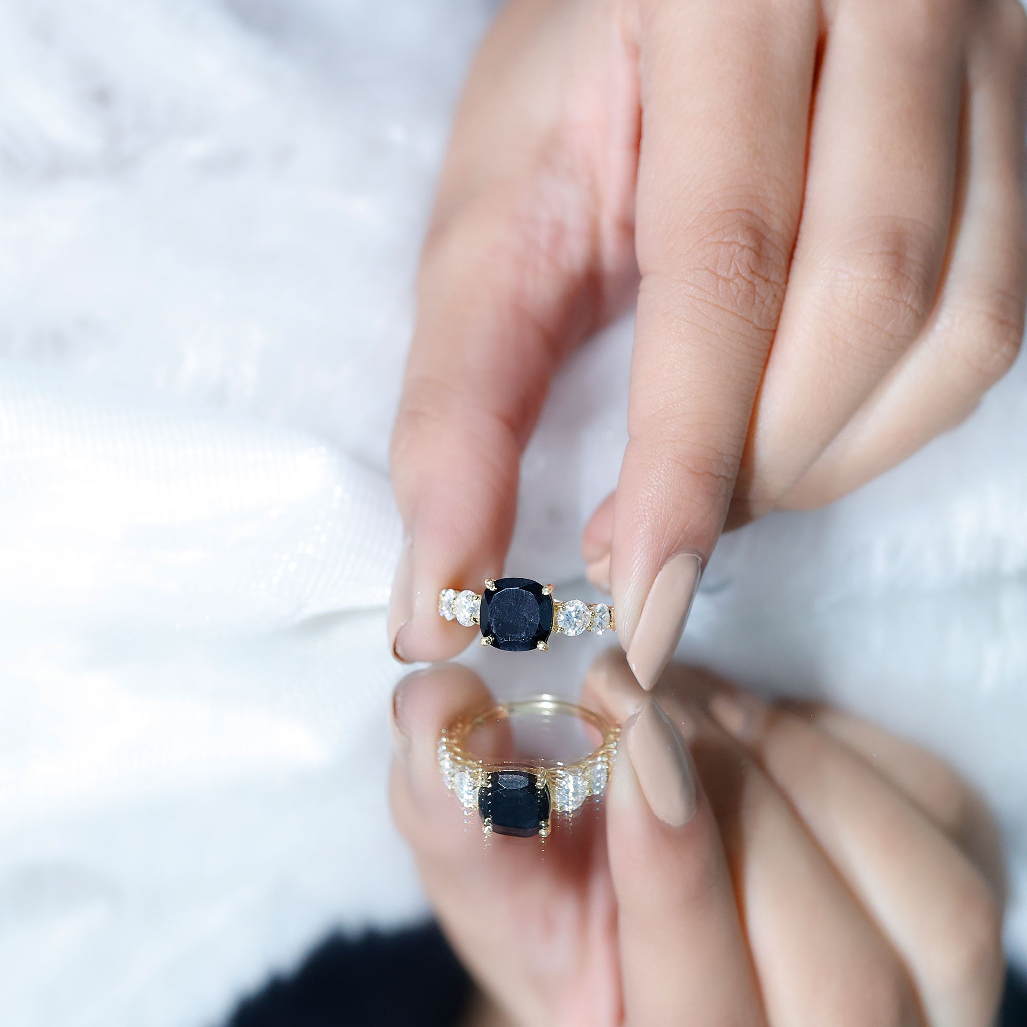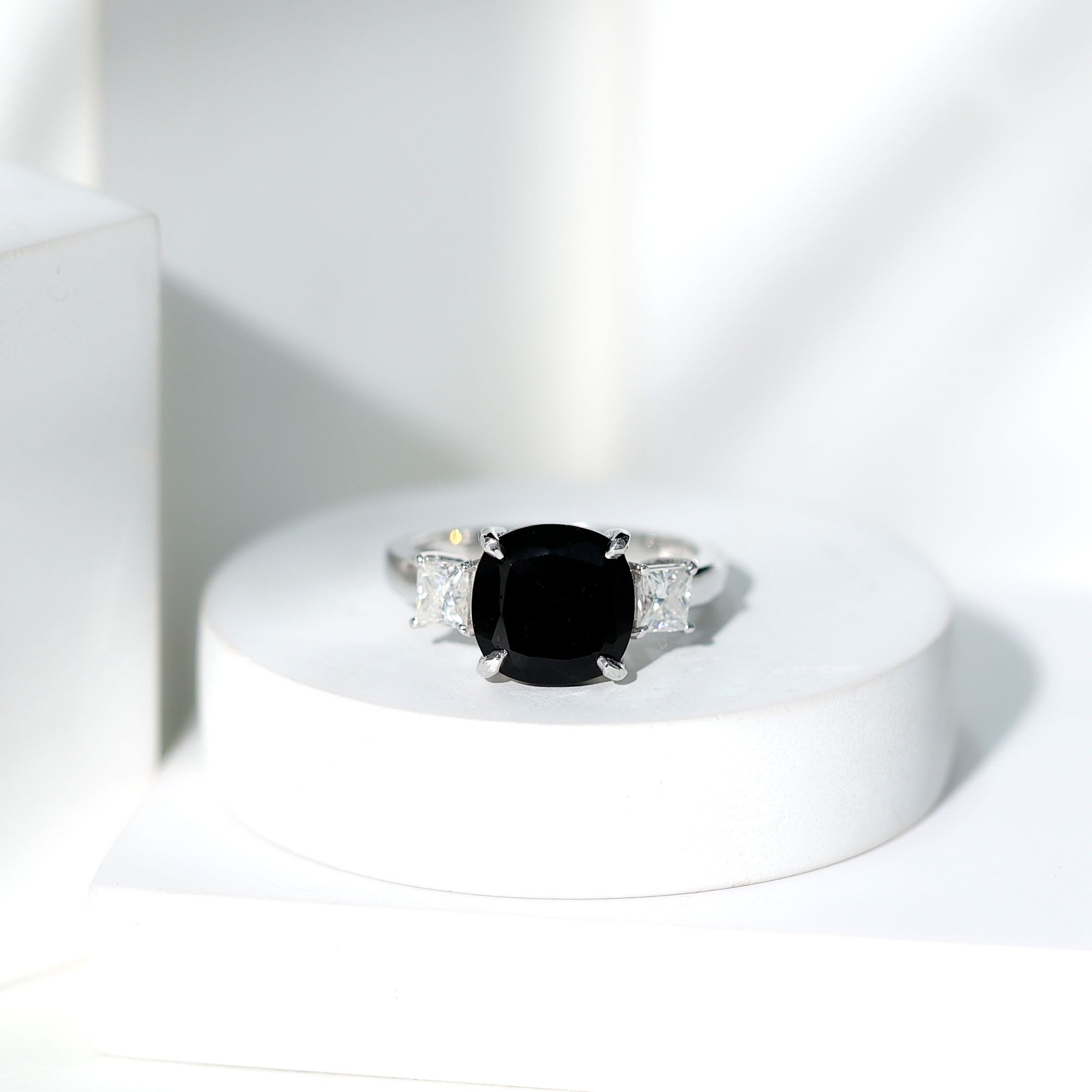 Three Stone lab Created Engagement Ring in Black Diamonds: These rings symbolizing past, present and future of couples relationship through three gemstones are beautiful as well as meaningful choices. These similar or different gemstones add a sentimental value, promising a shared future.