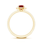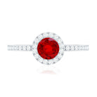 A Unique Minimal Engagement Ring is embellished with Round Shape Created Ruby as solitaire and Round Shape Diamond is set as a side stone and the Halo makes a lovely piece. This Gold Minimal Ring is Composed of Solid Gold.