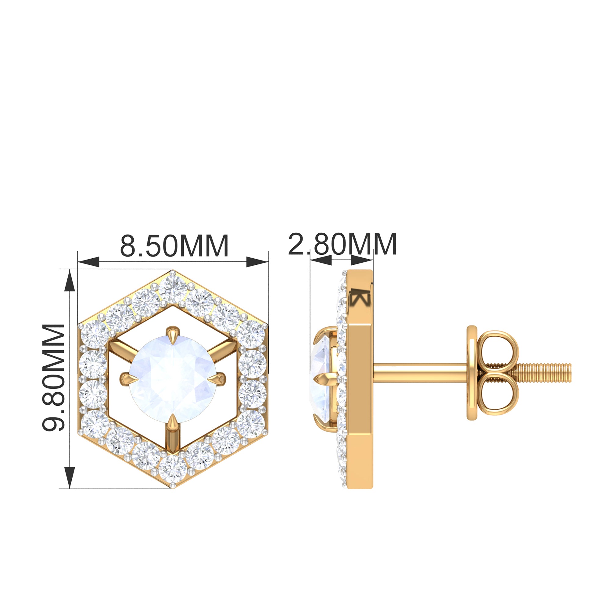 Feel unique with these Geometric Stud Earrings, adorned with Round Shape Moonstone Gemstone set as a center stone with Diamond Accent. These Minimal Stud Earrings are crafted in Solid Gold
