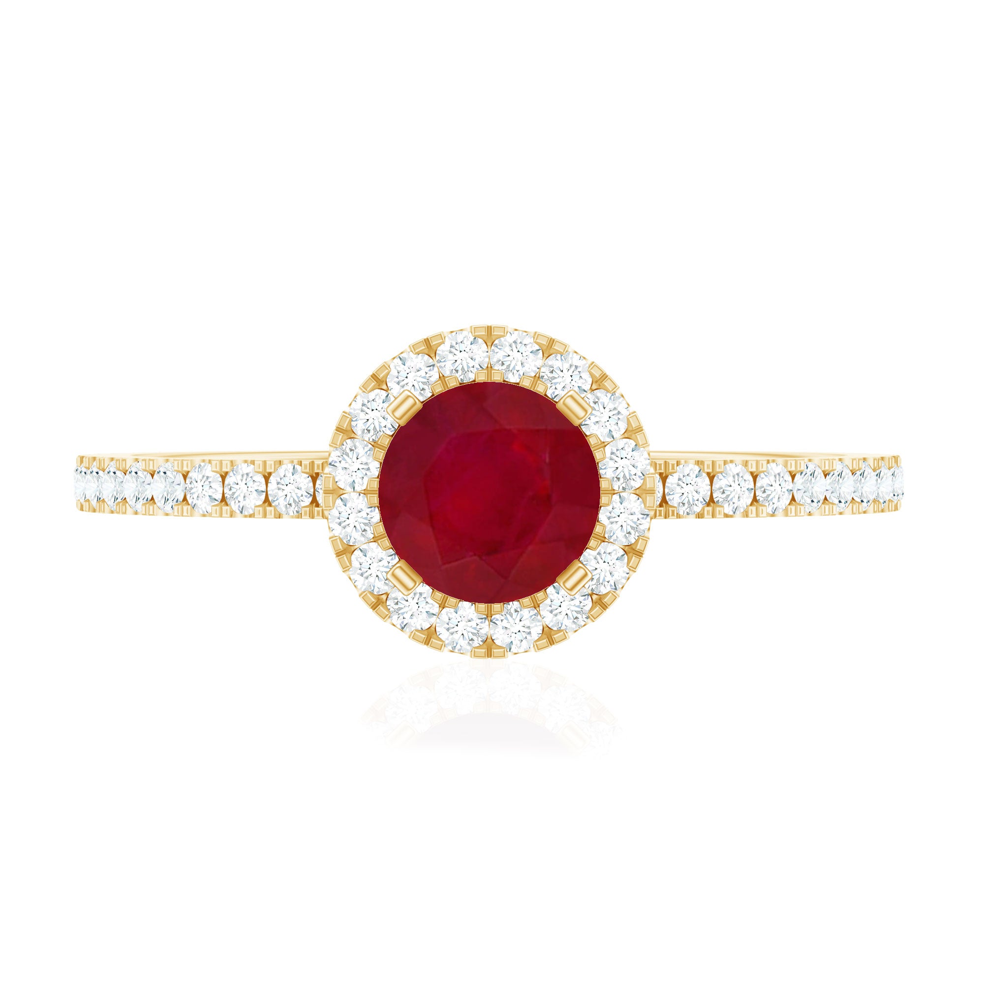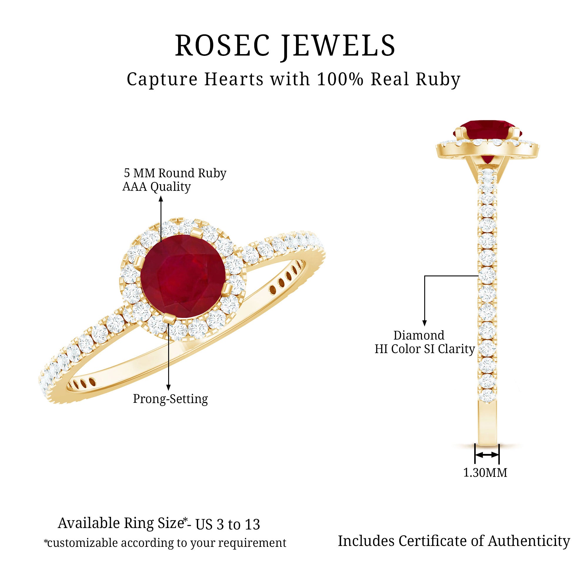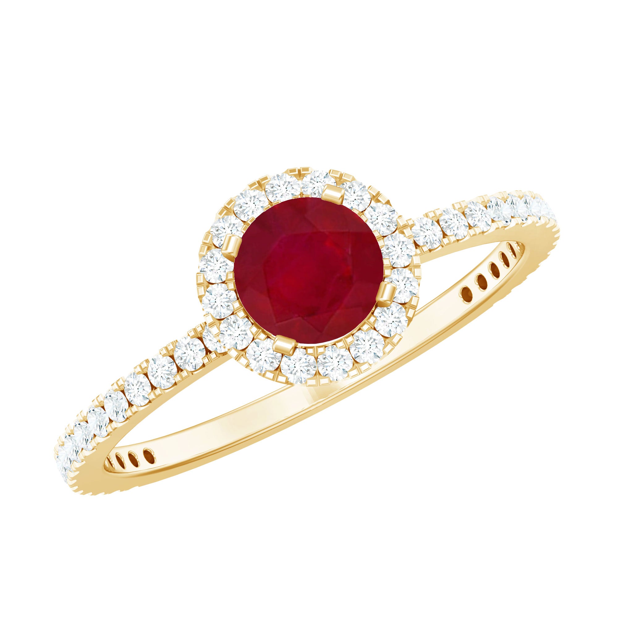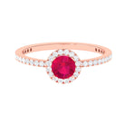 A Unique Minimal Engagement Ring is embellished with Round Shape Ruby as solitaire and Round Shape Diamond is set as a side stone makes a lovely piece. This Gold Minimal Ring is Composed of Solid Gold.
