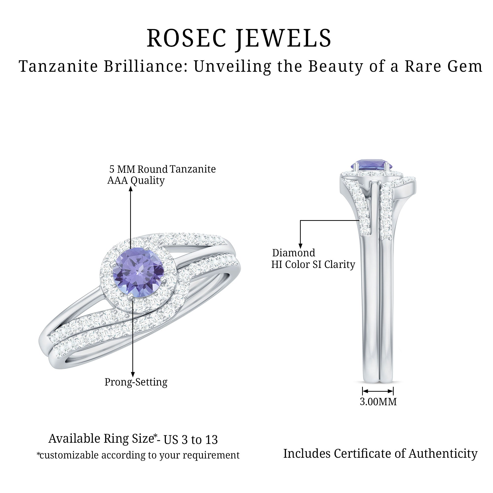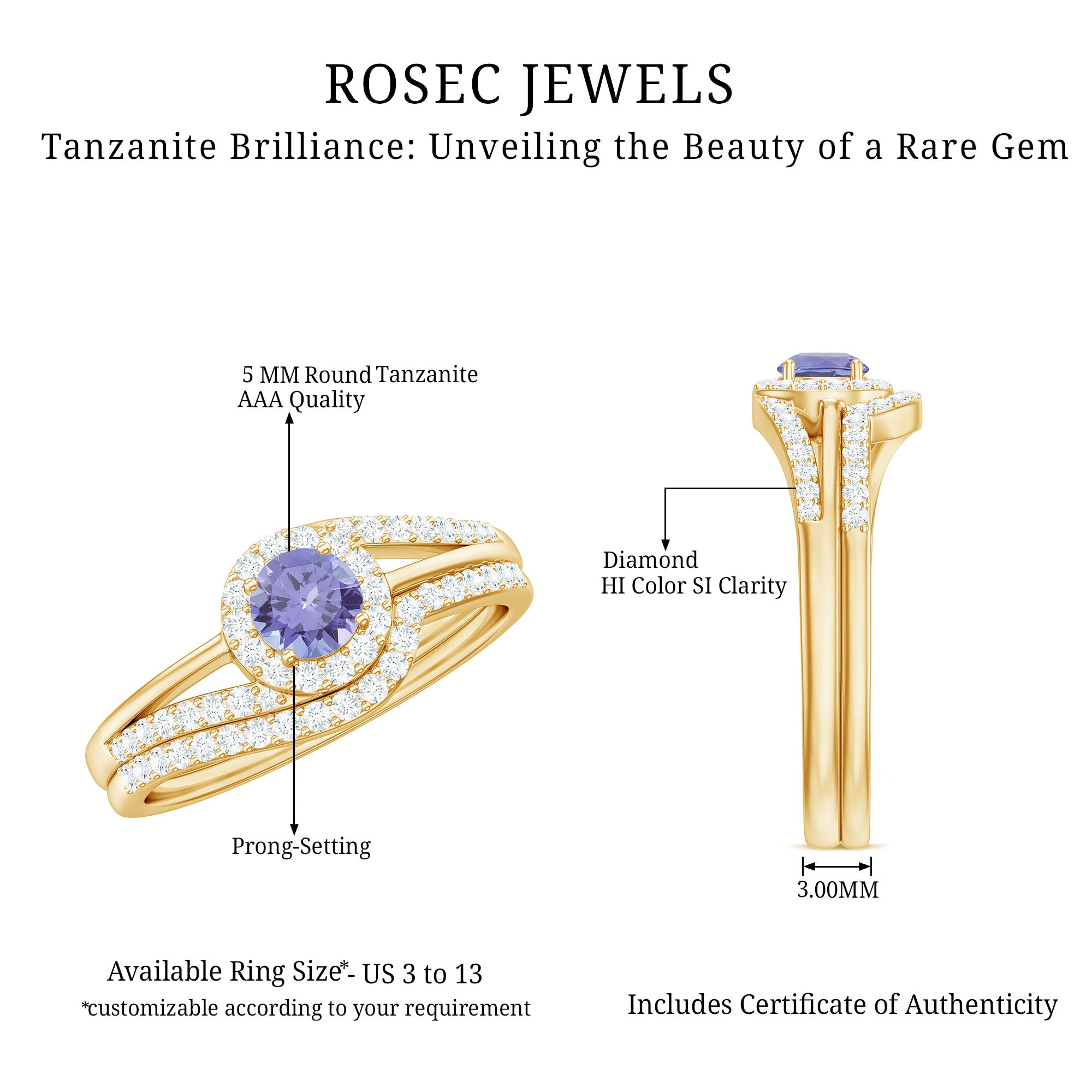 This Engagement Ring with Enhancer is embellished with Round Shape Tanzanite is set at the center encircled with Round Shape Diamond and more Diamond are set on the split shank and Enhancer Ring is encased with Round Shape Diamond, crafted in a Solid Gold.