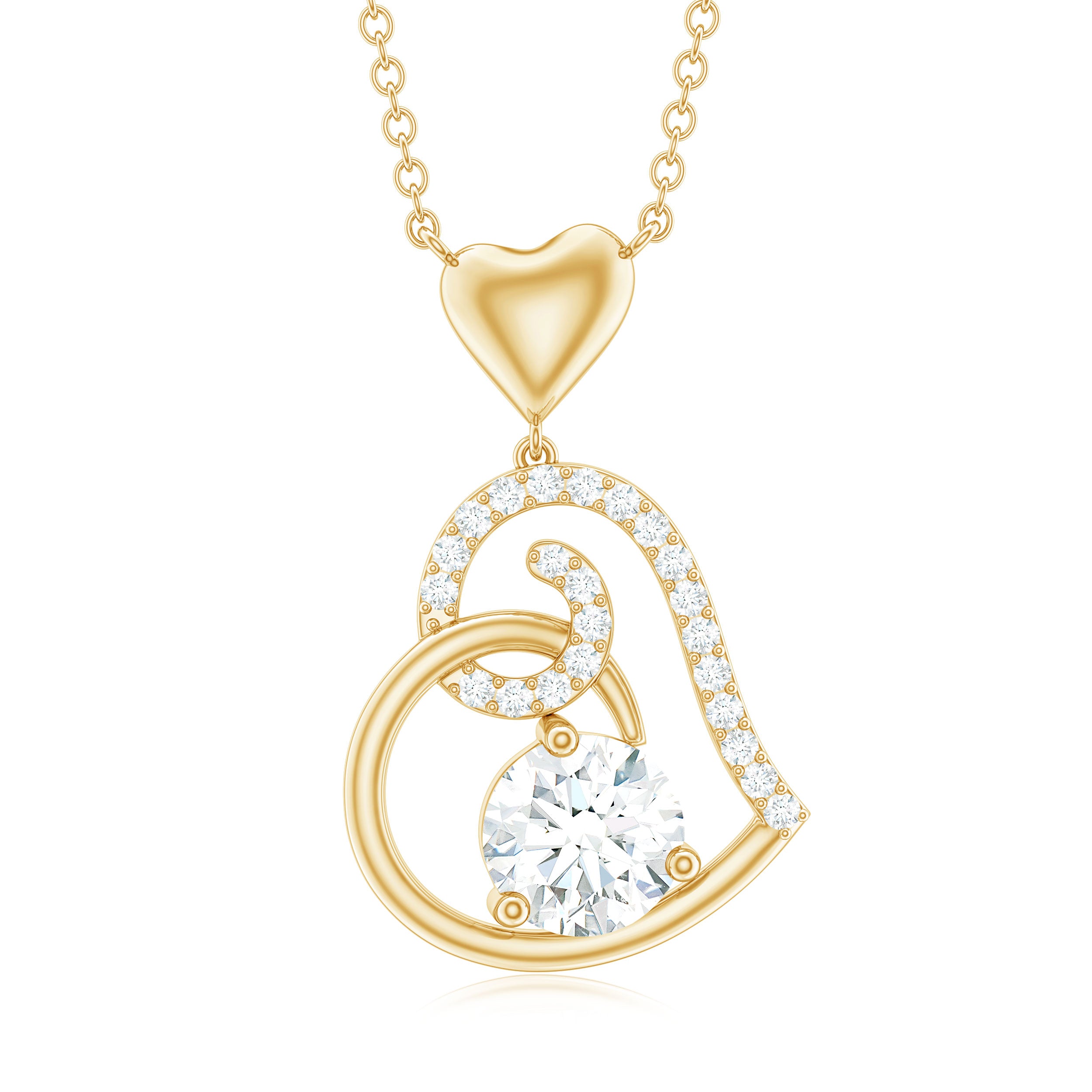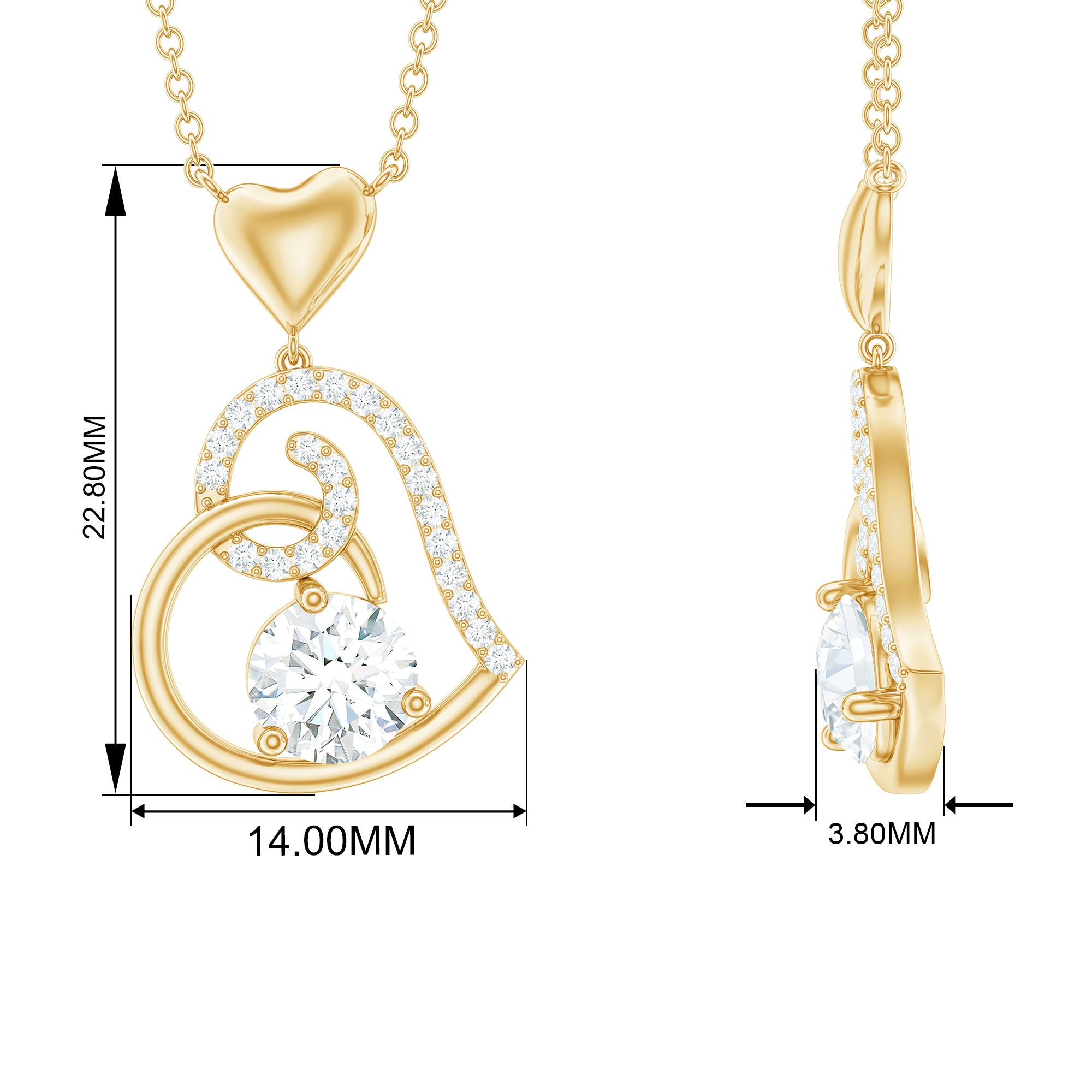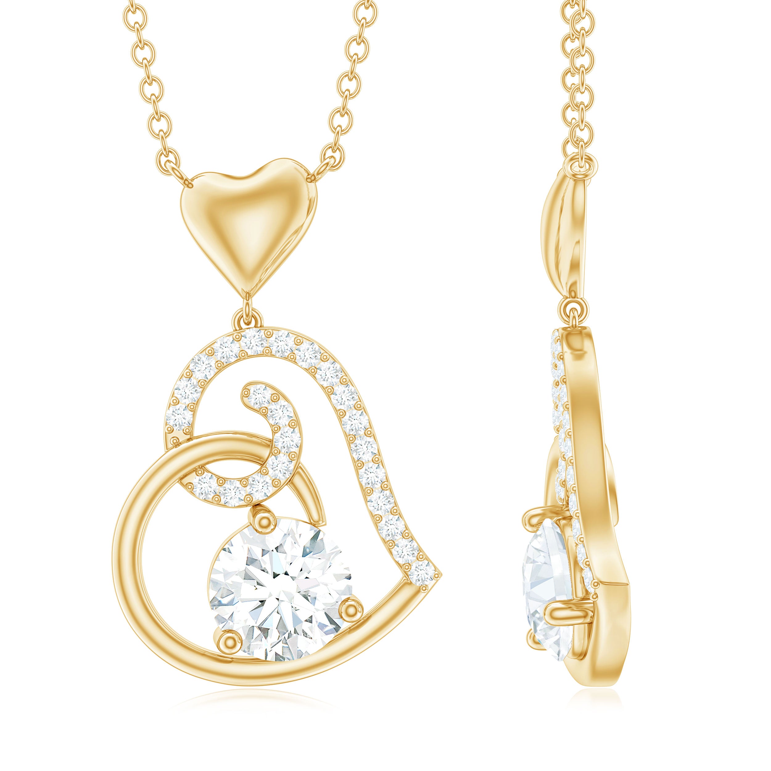 Be Dazzle with these beautiful Heart Drop Pendant embellished with Round Shape Moissanite as Solitaire in 3 Prong Setting and Round Shape Moissanite in Prong Setting, Crafted in Solid Gold.