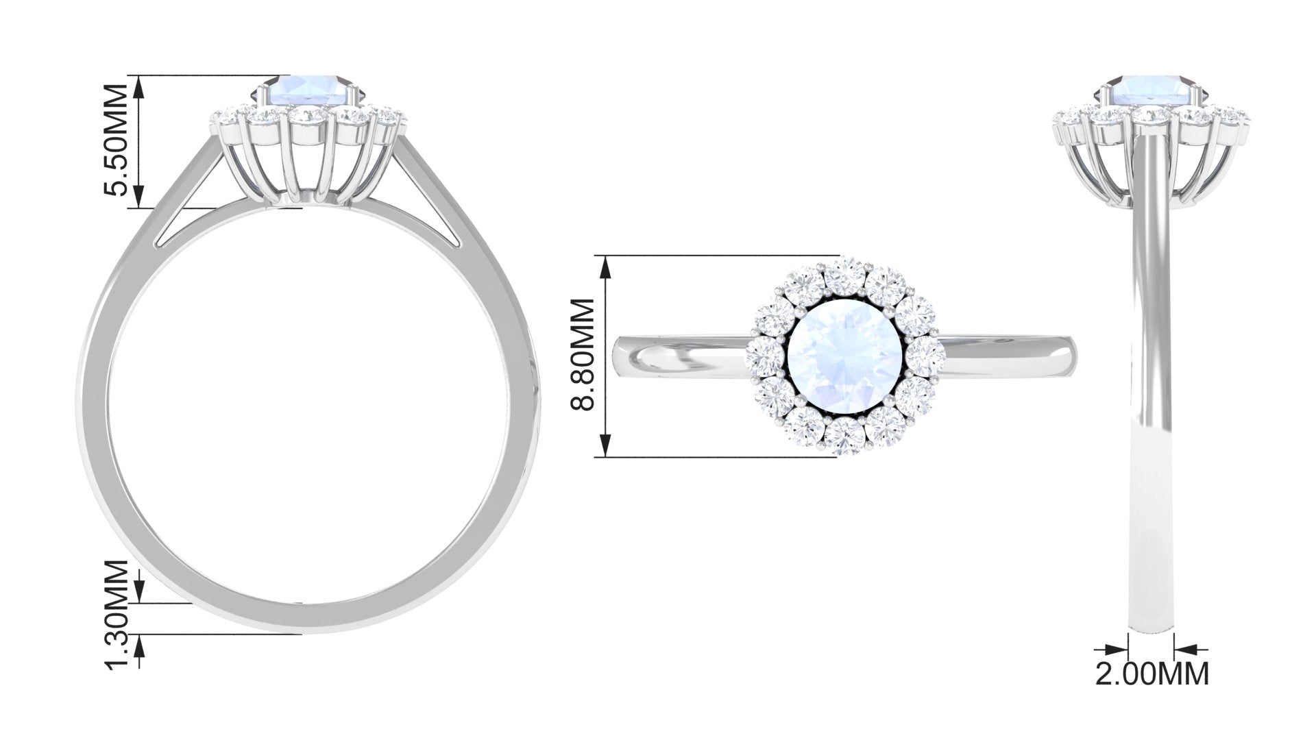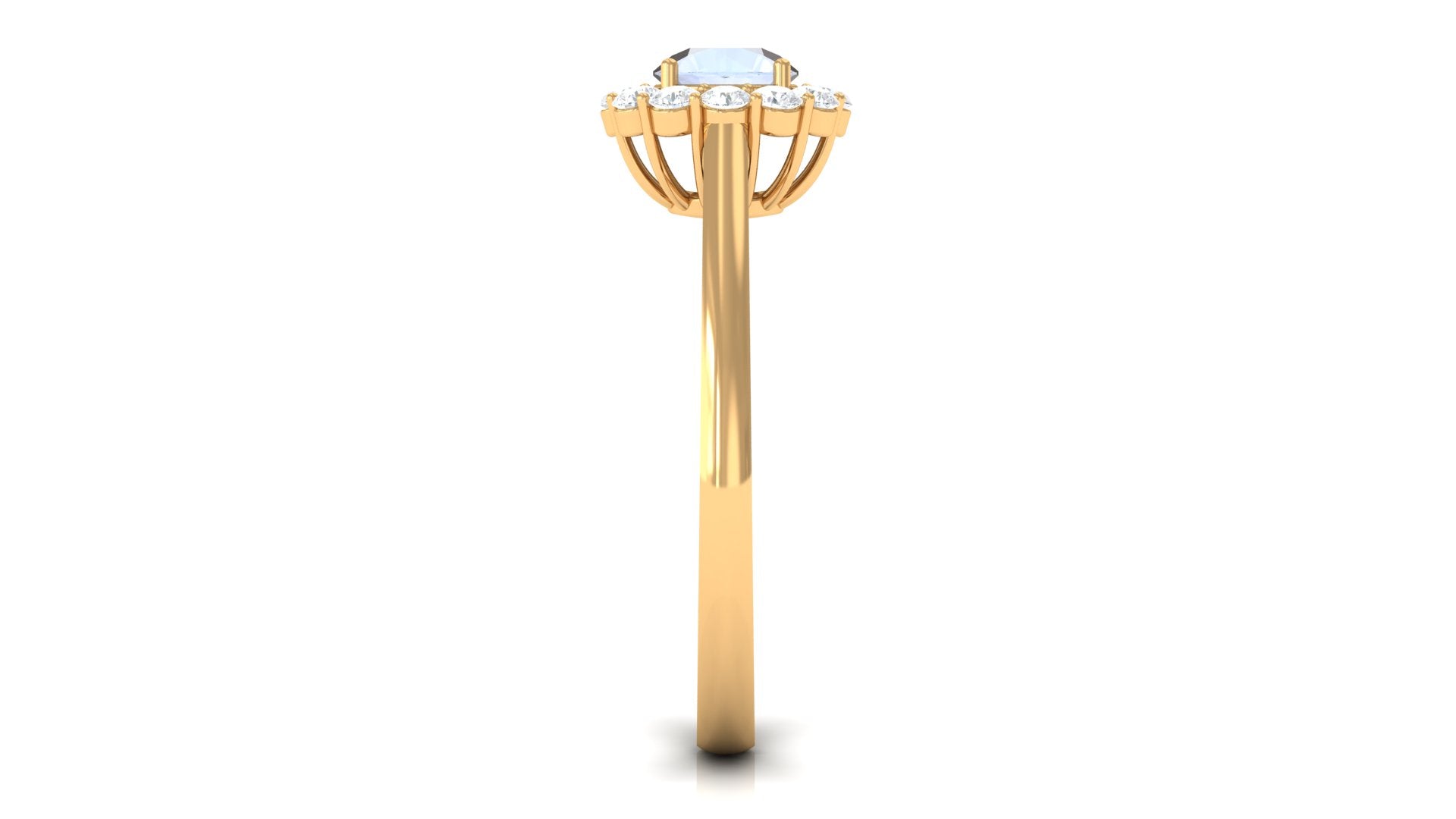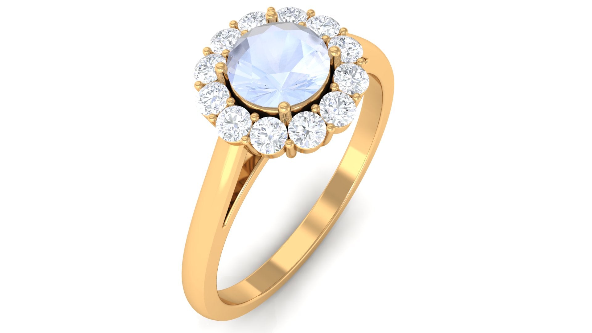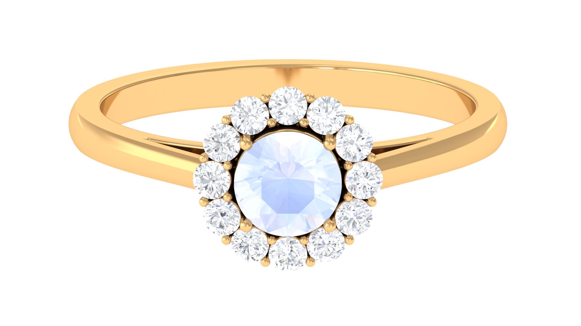Enhance your beauty with Floating Halo Engagement Ring is embellished with Round Shape Moonstone Set as a solitaire in a prong setting and Round Shape Diamond in a floating Halo. This Engagement Ring is composed of solid gold.