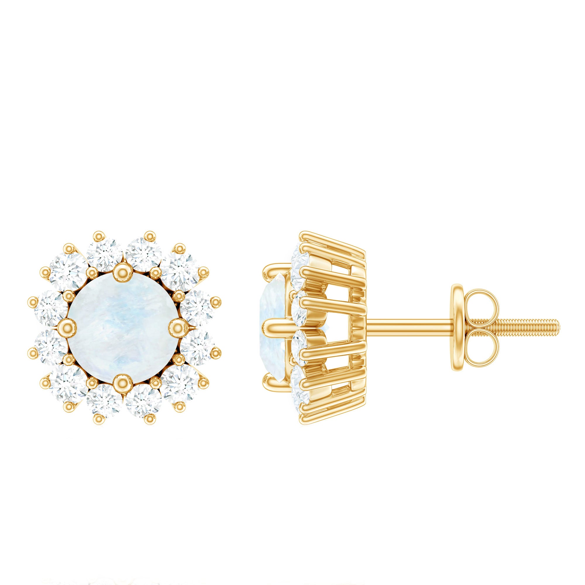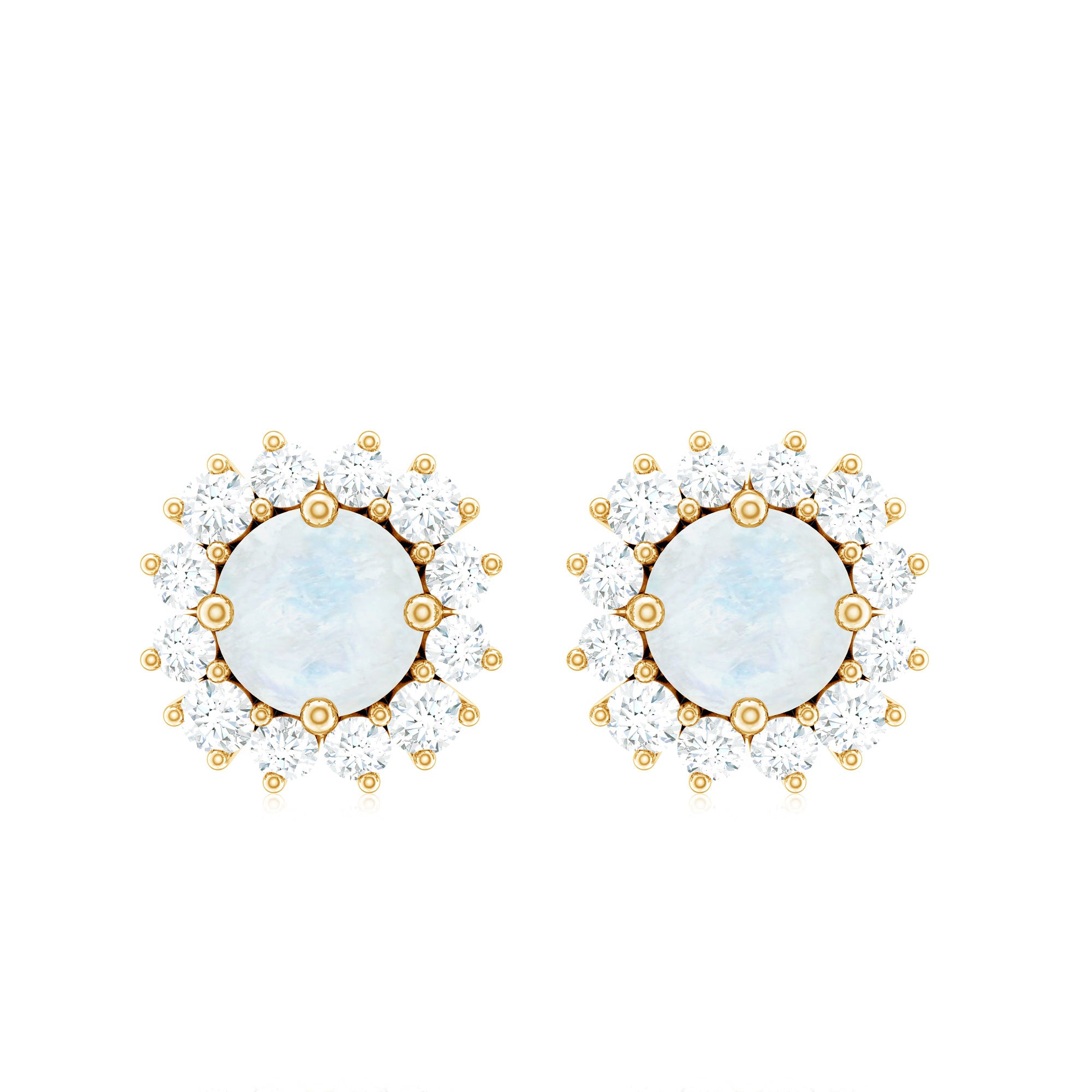 A Celebration without ring is Incomplete, a Jewelry will bring smiles of delight on Mothers Day. Explore these Stud Earrings adorned with Round Shape Moonstone in Prong Setting with Halo Diamond, crafted in Solid Gold Metal.