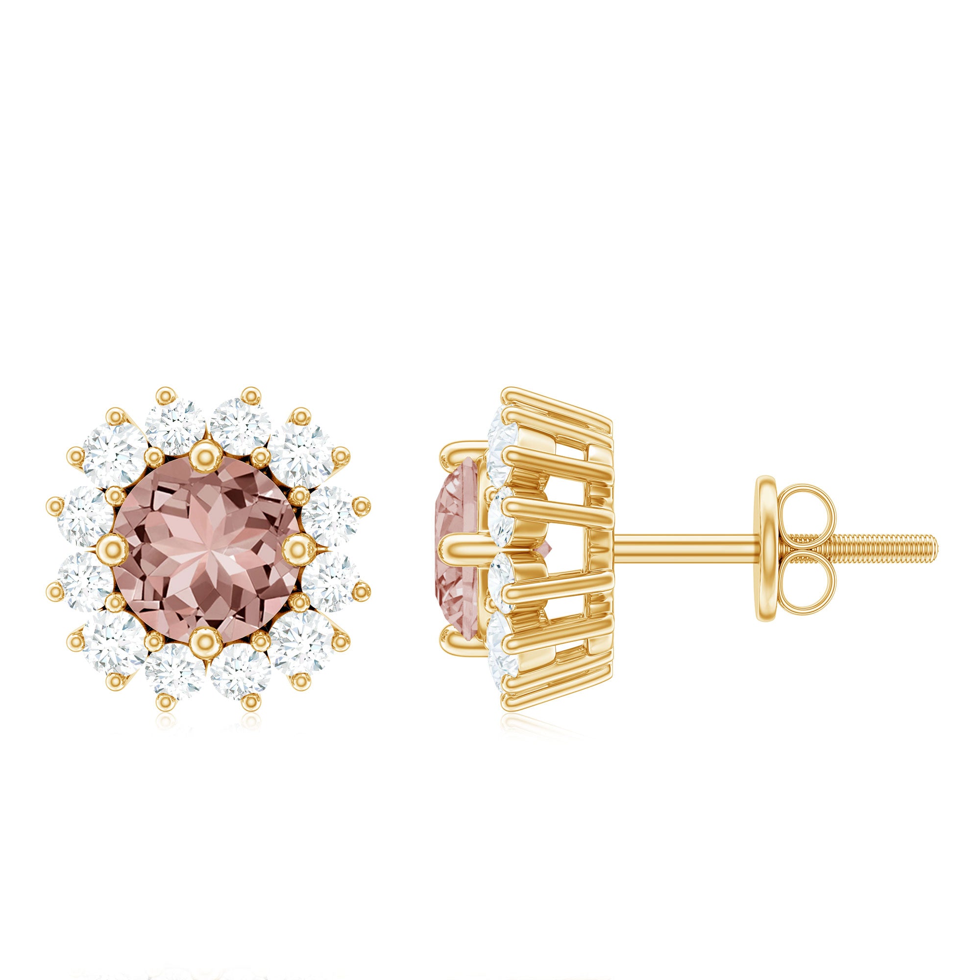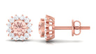 A Celebration without Gift is Incomplete, a Gift of Jewelry will bring smiles of delight on Mothers Day. Explore these Stud Earrings adorned with Round Shape Morganite in Prong Setting with Halo Diamond, crafted in Solid Gold Metal.