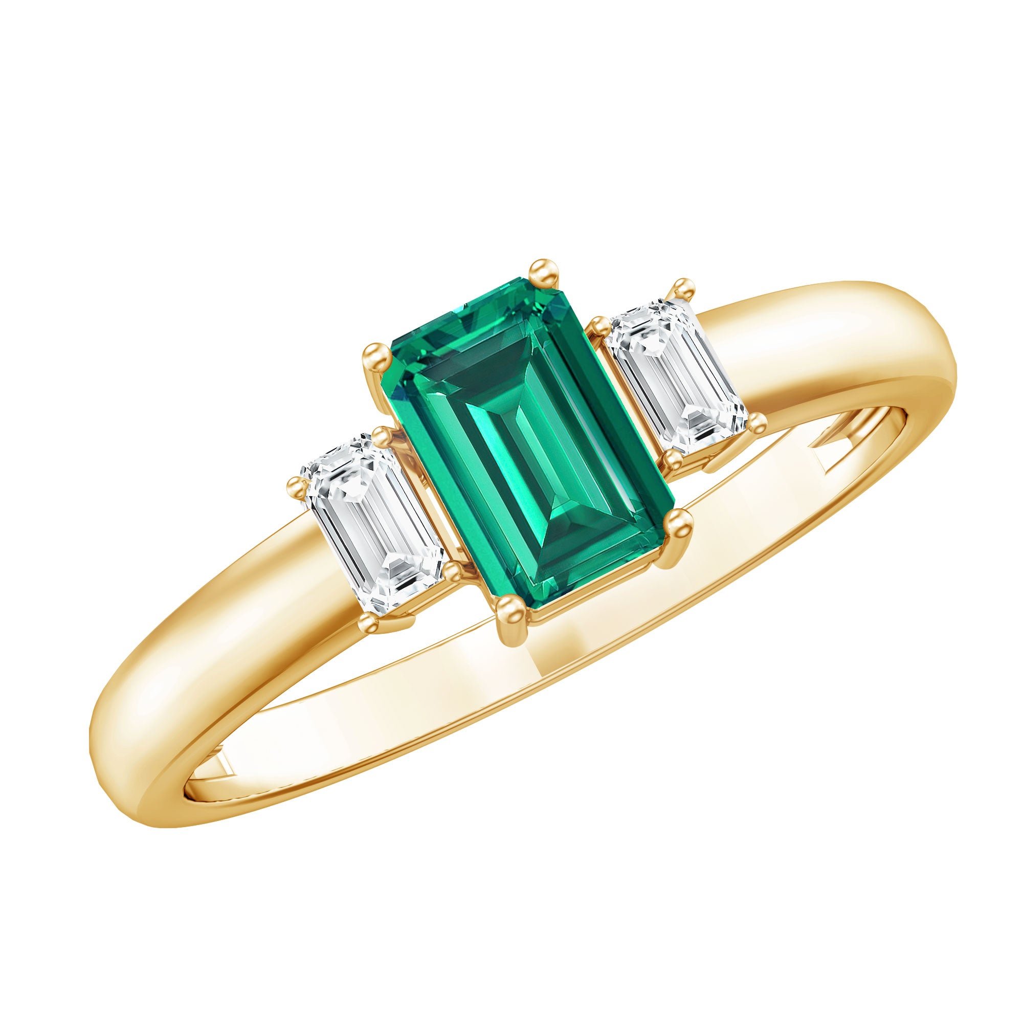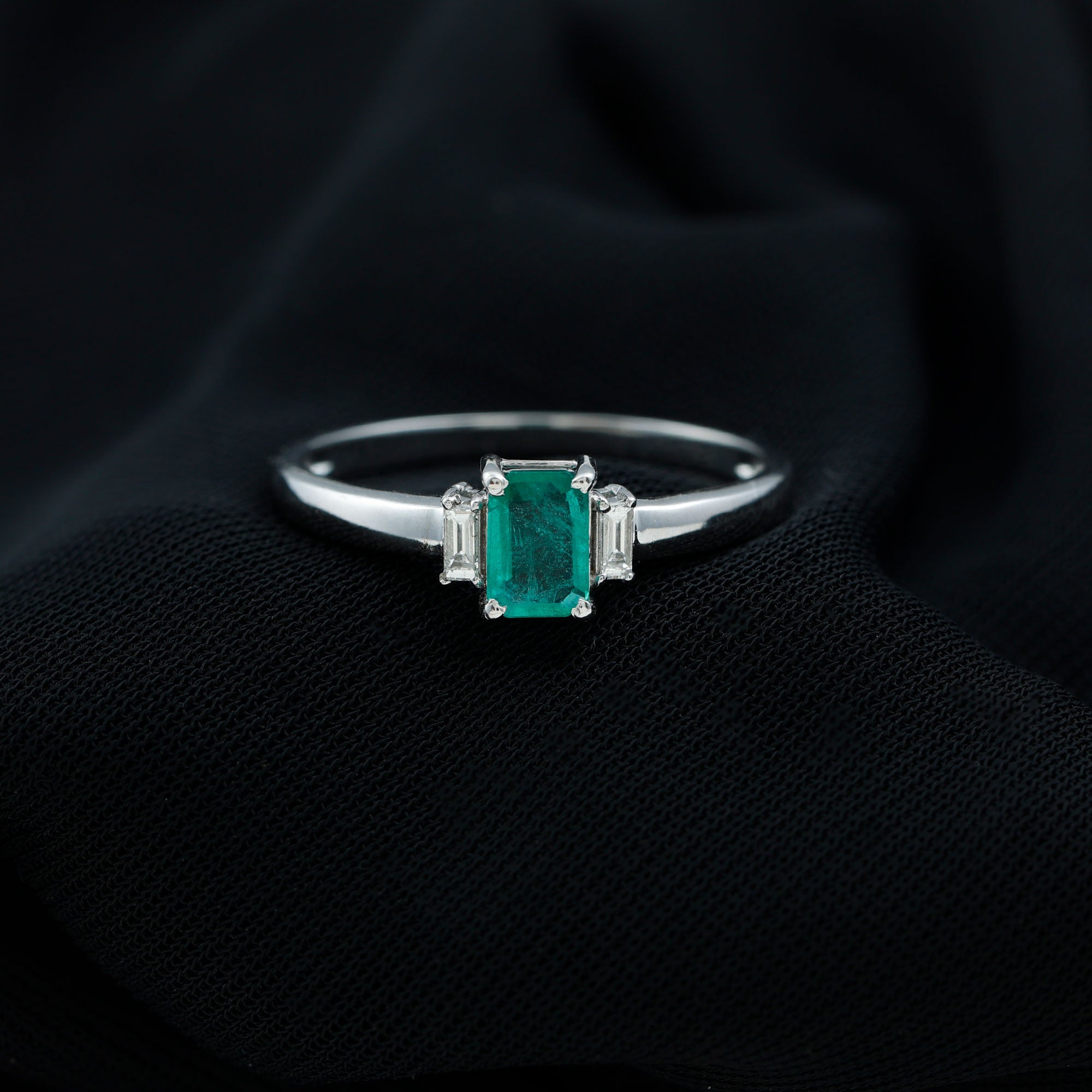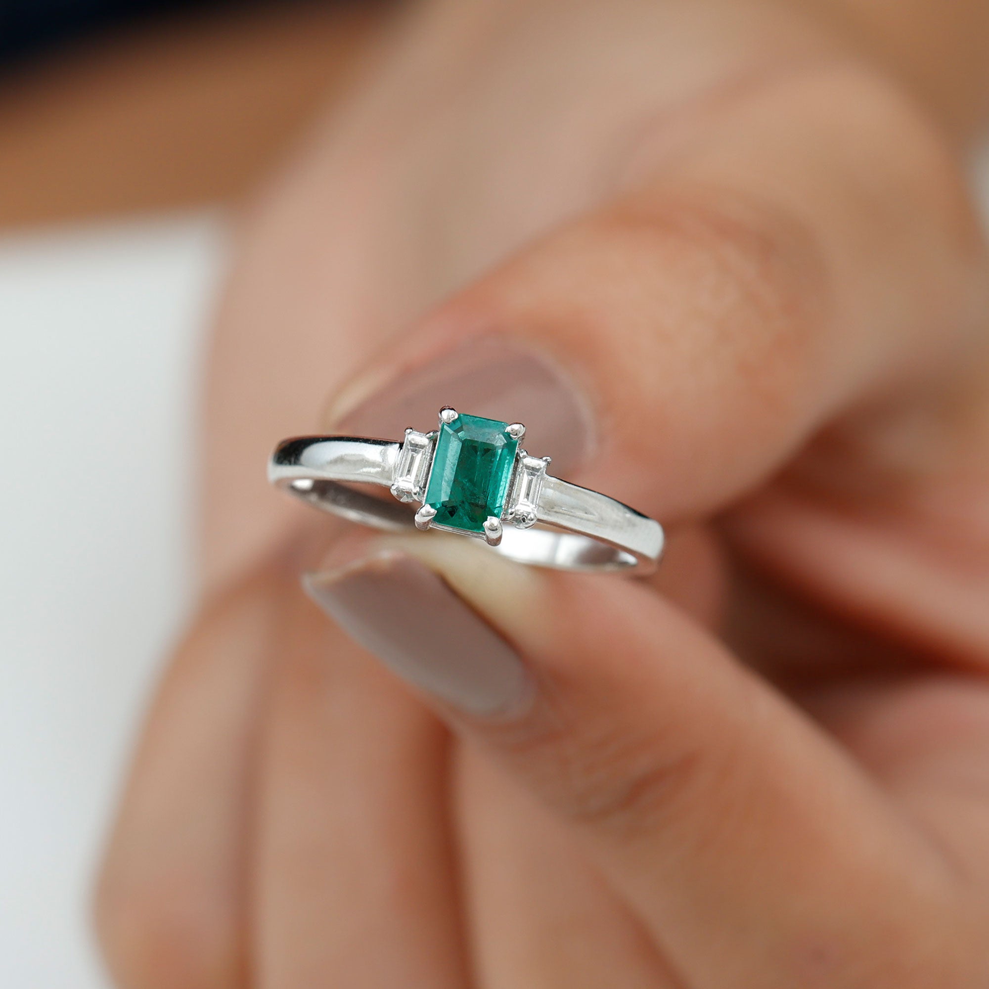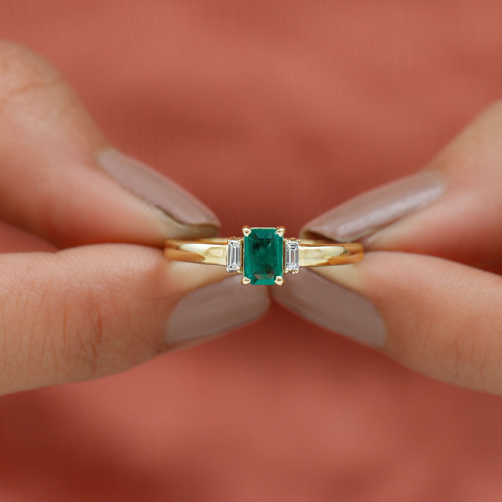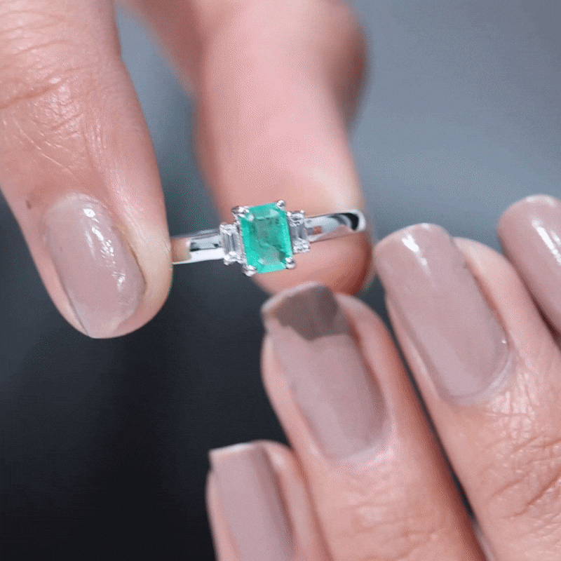 This Emerald Promise Ring is a beautiful symbol of love and new beginnings. At the center is a 4X6 MM emerald cut emerald of AAA quality, shining with a rich green color that stands for growth and harmony. On each side of the emerald are baguette cut HI-SI quality diamonds that add gentle sparkle and make the design complete. The three stone style of this Emerald and Diamond Ring represents the past, present, and future, making it a meaningful choice for someone special. Each gemstone is carefully selected, certified for its quality, and set securely in prong setting to ensure lasting beauty. The simple arrangement of the stones gives the Emerald Three Stone Ring an elegant and balanced look. The bright emerald and sparkling diamonds create a design that feels classic yet modern. Perfect for a promise, anniversary, or any important moment, this Emerald Cut Emerald Ring is made to be worn with pride and love. It is comfortable for everyday wear but still has a special look for memorable occasions. With its fine details and thoughtful design, this Pre Engagement Ring is a reminder of love, trust, and the journey shared together. A timeless piece that will always hold a special place in the heart.