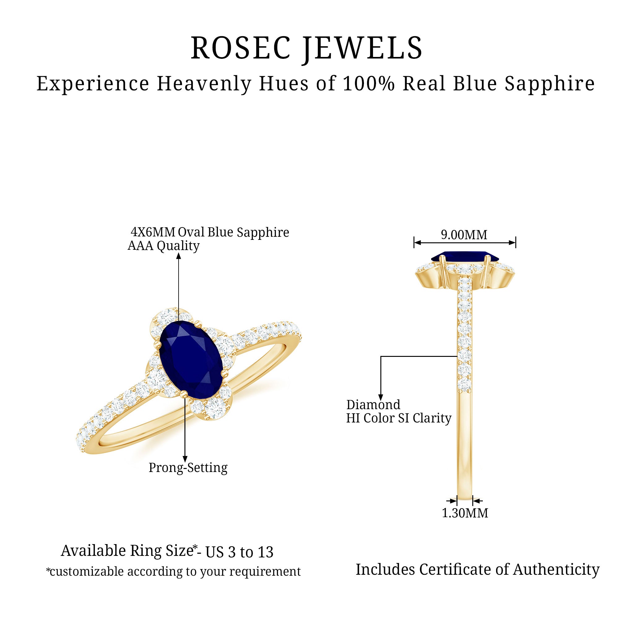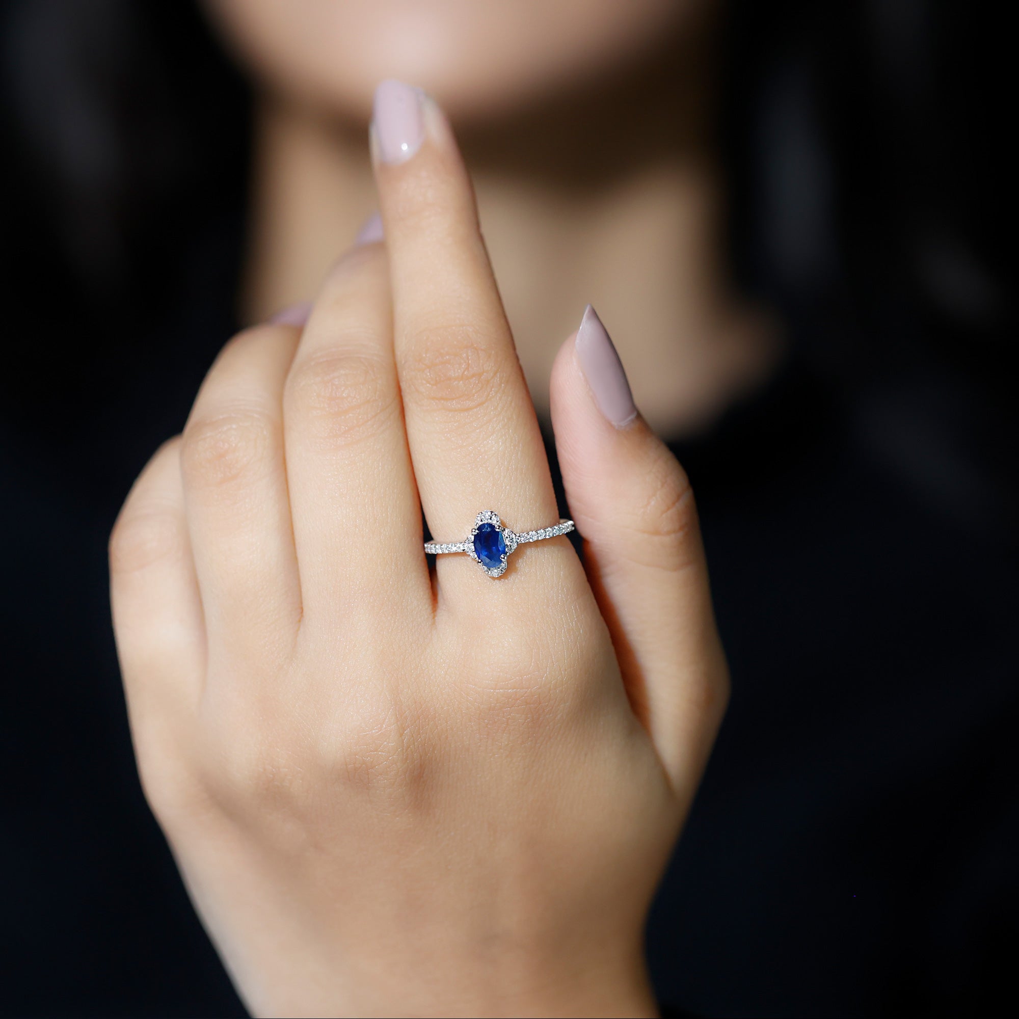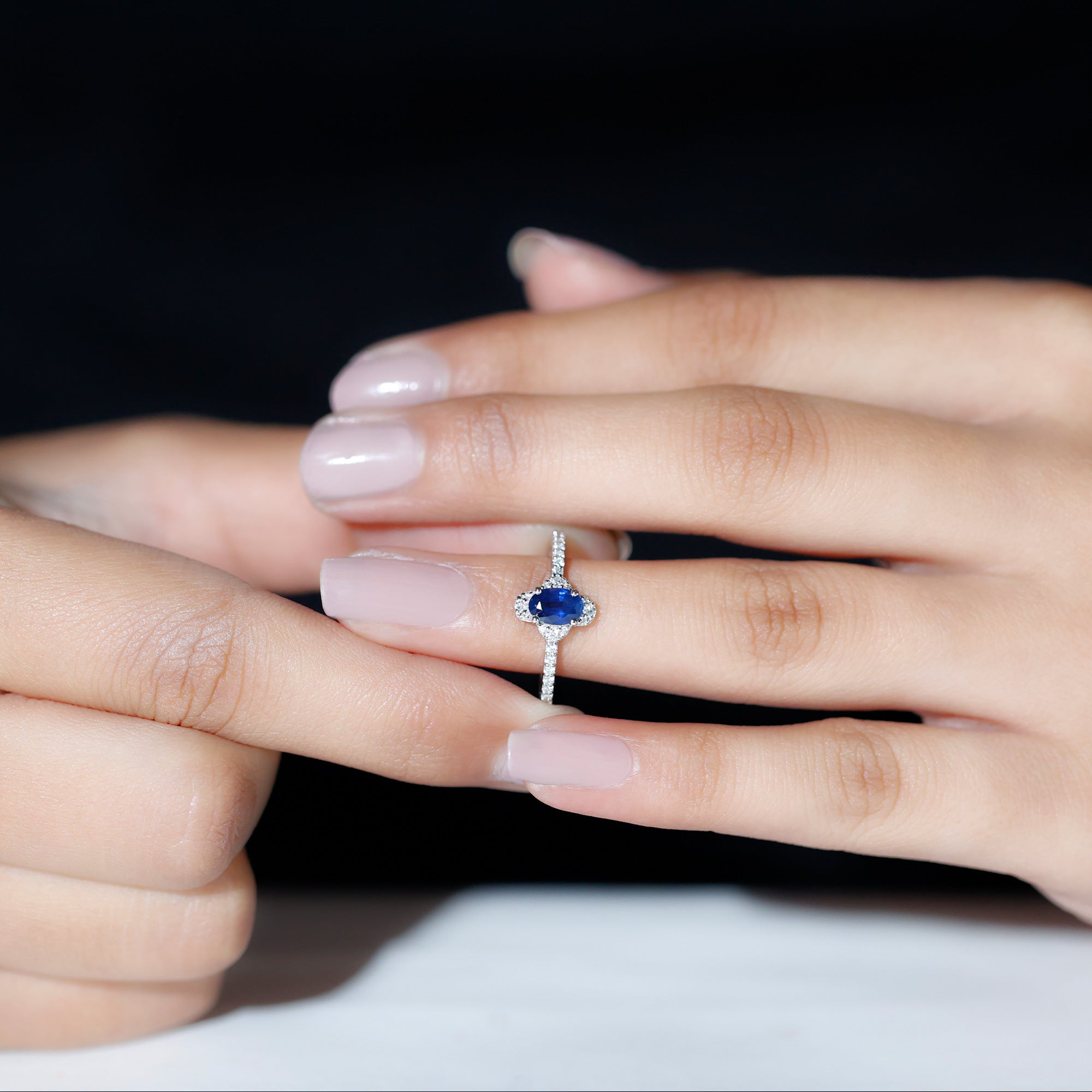 1 CT Oval Cut Blue Sapphire Classic Solitaire Ring with Diamond Halo