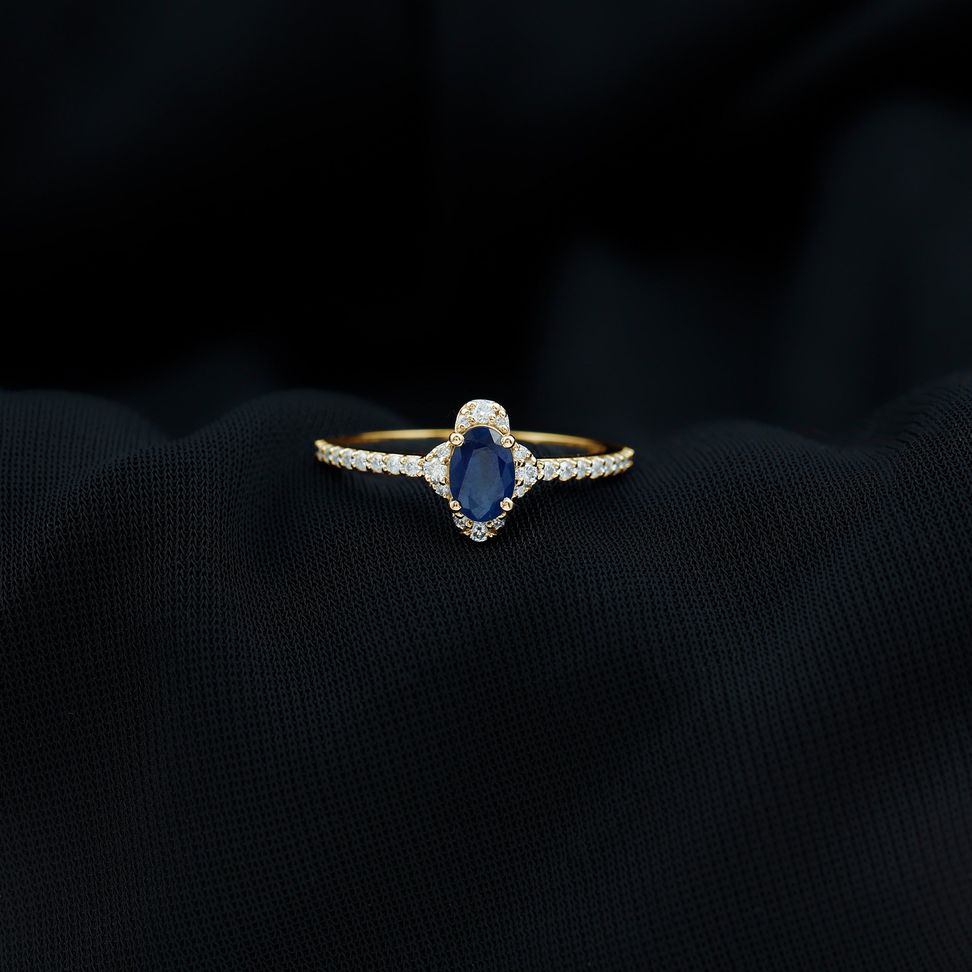 Keep Negative Vibe at Bay with Blue Sapphire Ring that is set in Oval Shape in the Center with a Designer Diamond Studded Halo. The Solid Gold Crafted Ring represents good luck and more happiness.