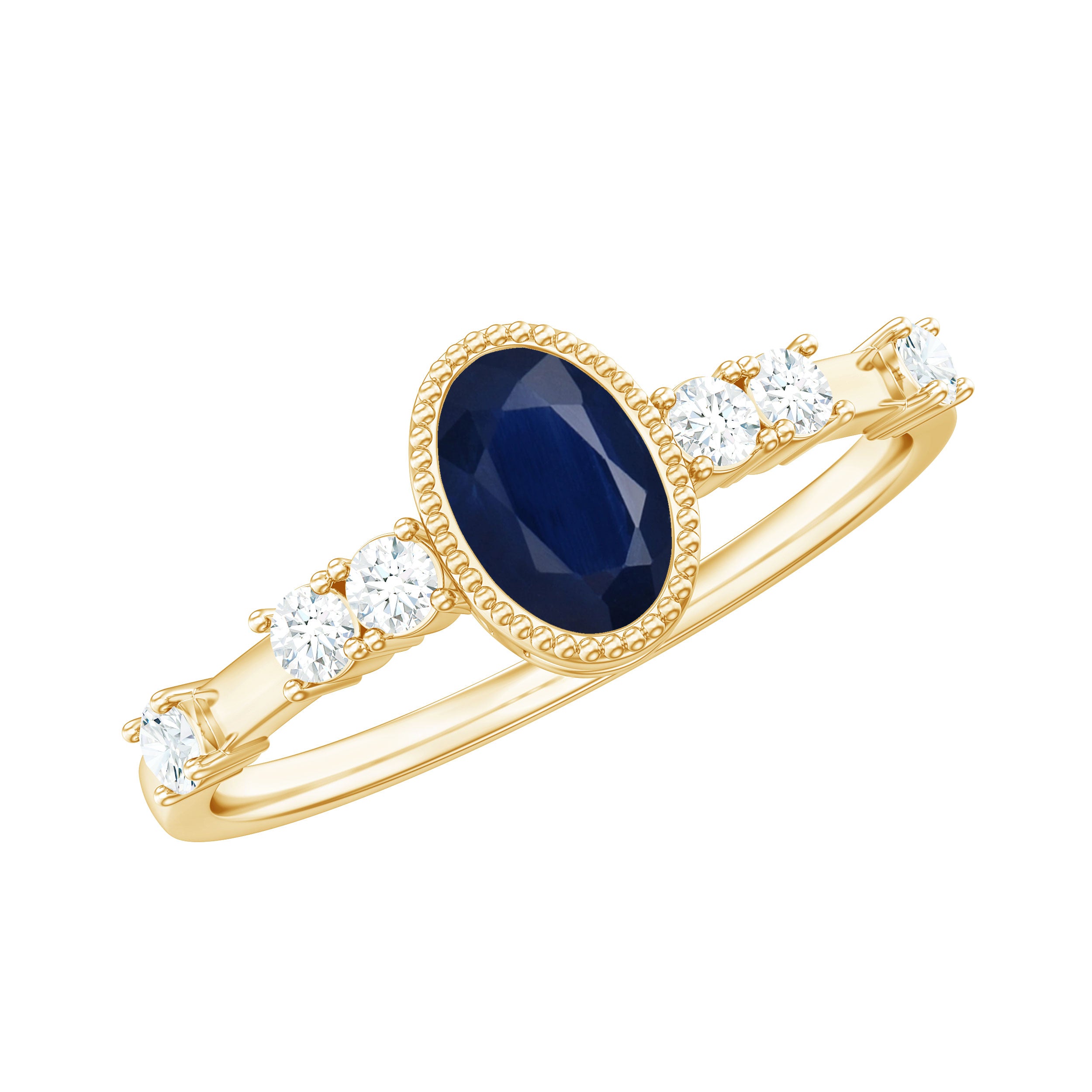 Turn a simple look into a classic one! on your special day with this Oval Blue Sapphire Engagement Ring. It is crafted in Gold for fabulous and graceful appeal. The Blue Sapphire is held in beaded bezel setting, accompanied by round Diamond. This Blue Sapphire Engagement Ring is a glistening piece of fine jewelry.